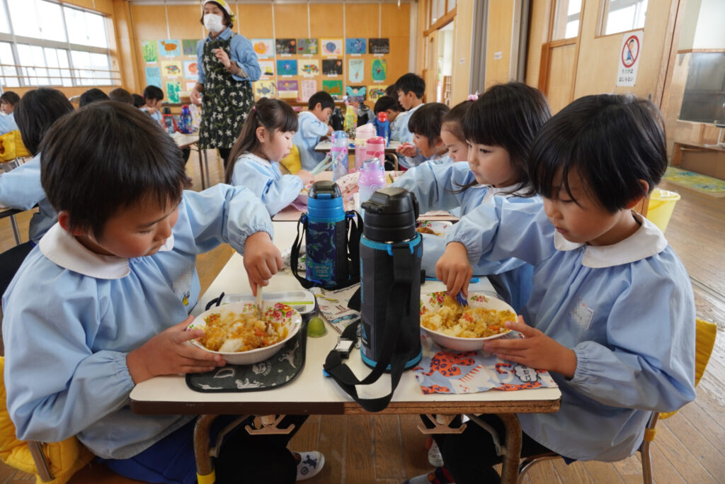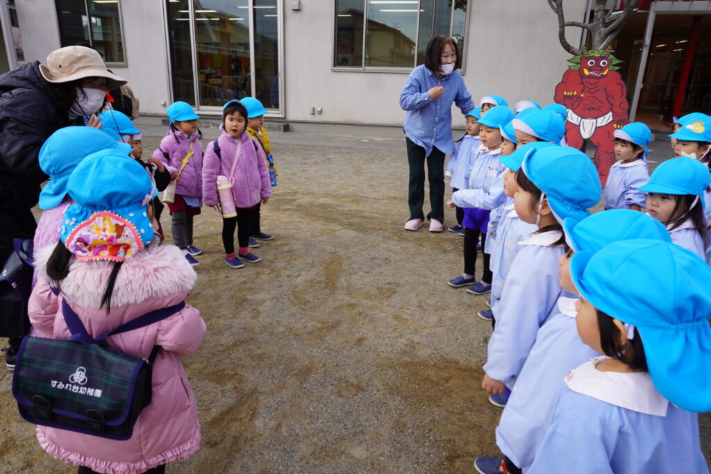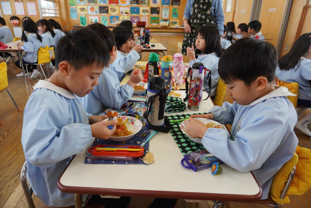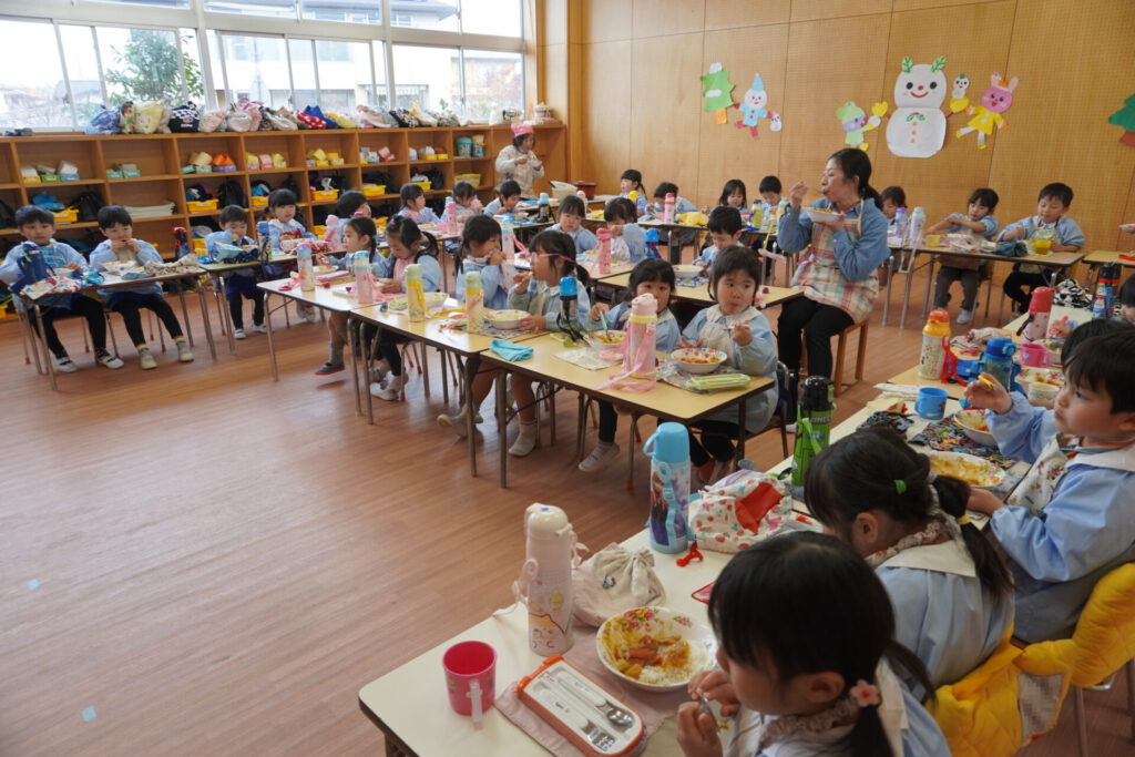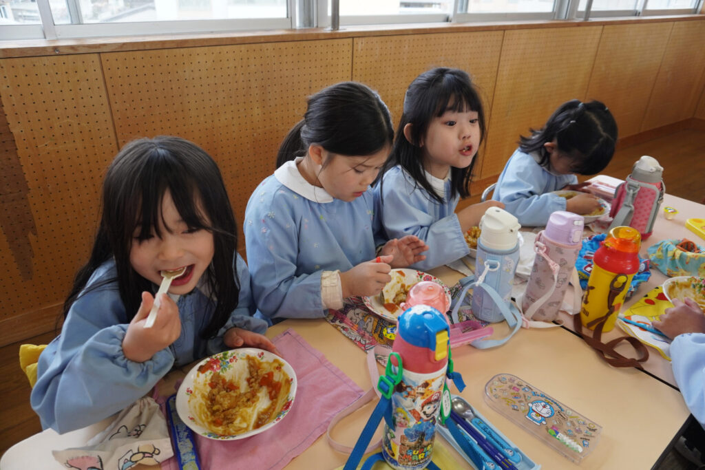 お昼は一緒に楽しみにしていたカレーです。まどかっこ・すみれっこで楽しく話をしながらのひとときでした。 楽しい時間はあっという間です。「楽しかったね」「また遊ぼうね」と約束を交わし、すみれっこを見送りました。