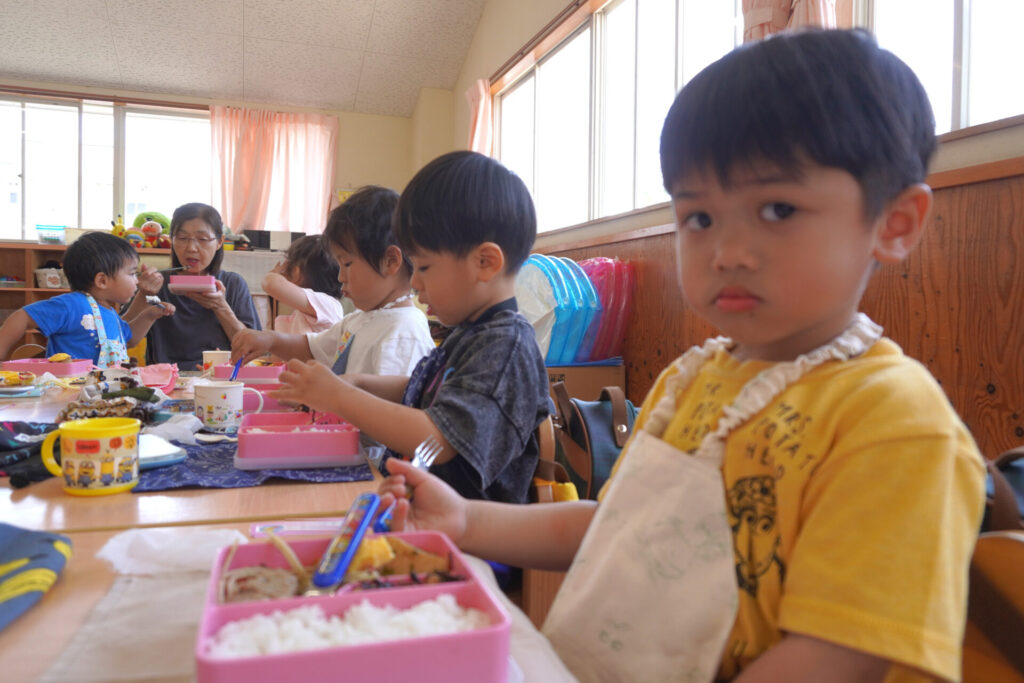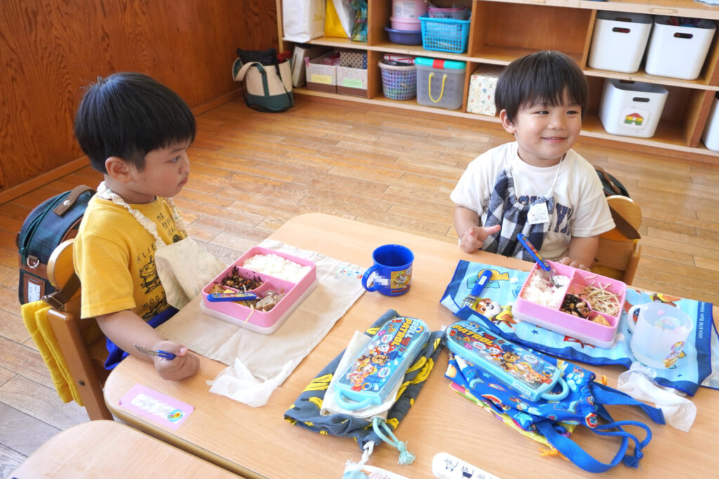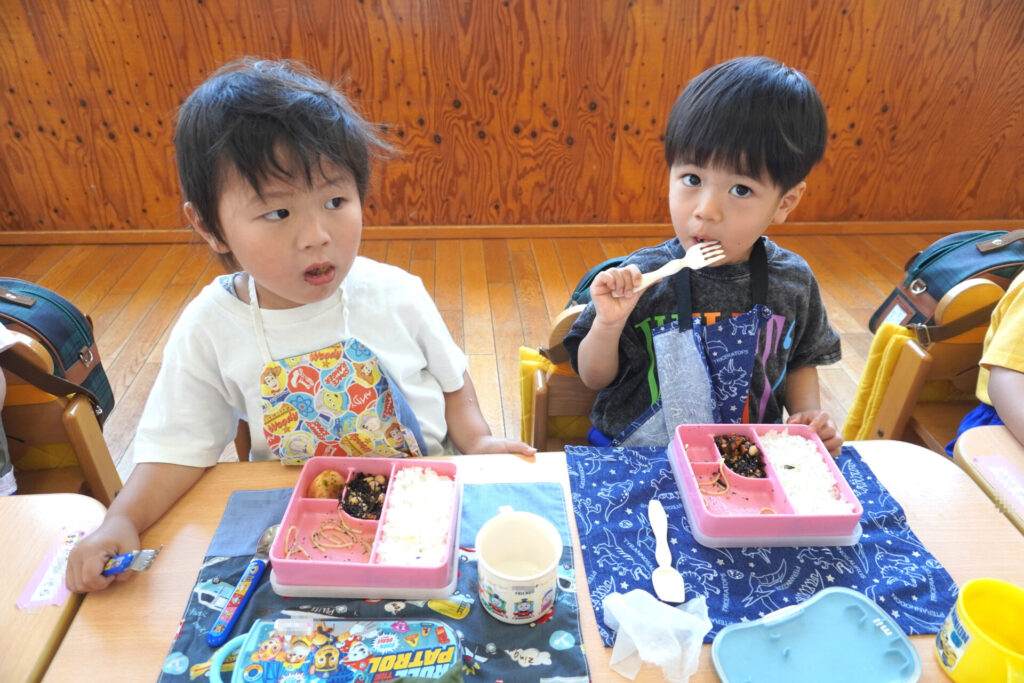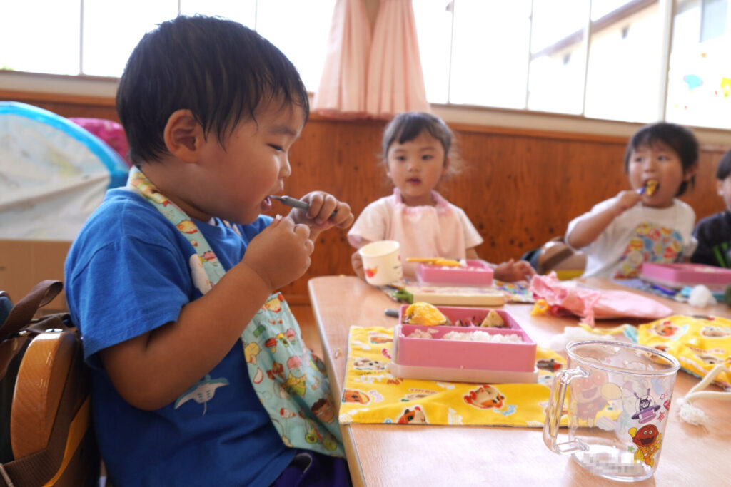 給食もよく食べます。「早く食べたい!」と毎日楽しみにしています。食事の時間は座って食べられるように励ましています。