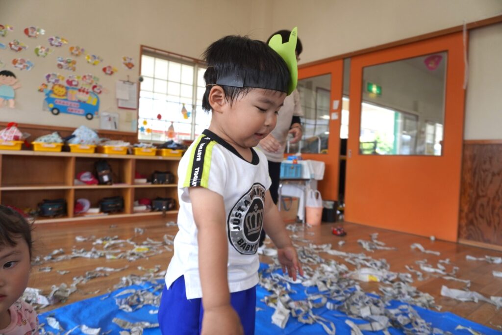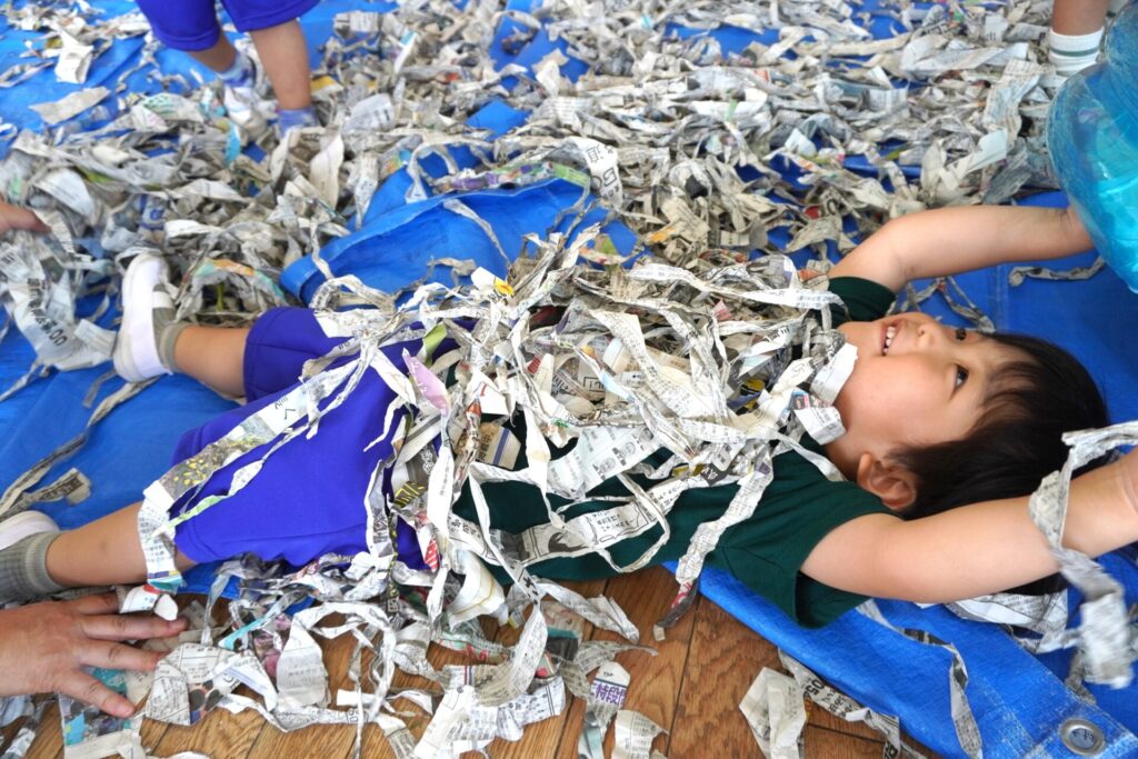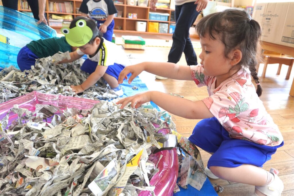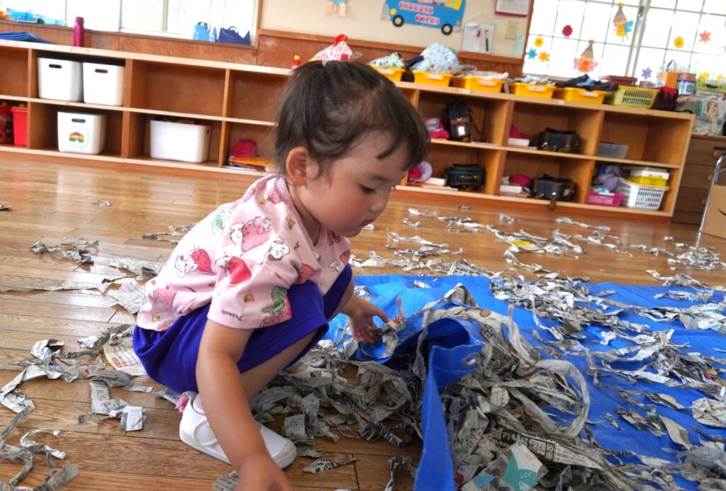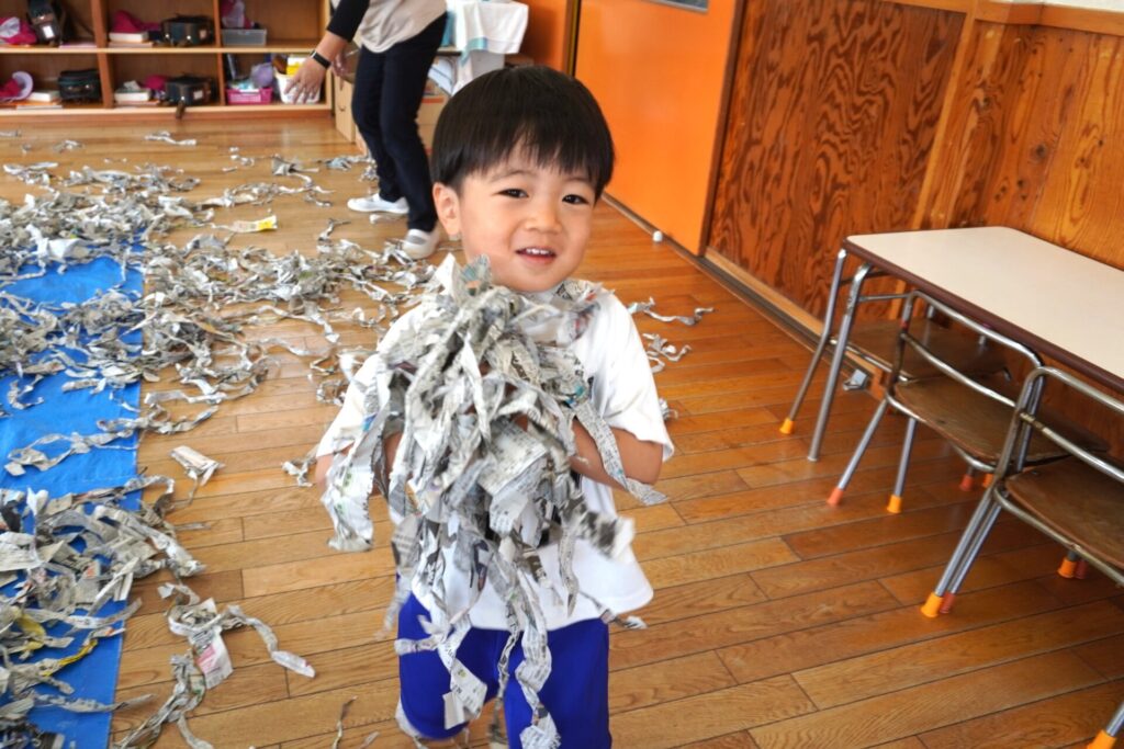 食後は新聞紙遊びをしました。パラパラ雨を降らせて、集めて、また降らせて…それがとてもおもしろくて、何回も何回も遊んでいました。