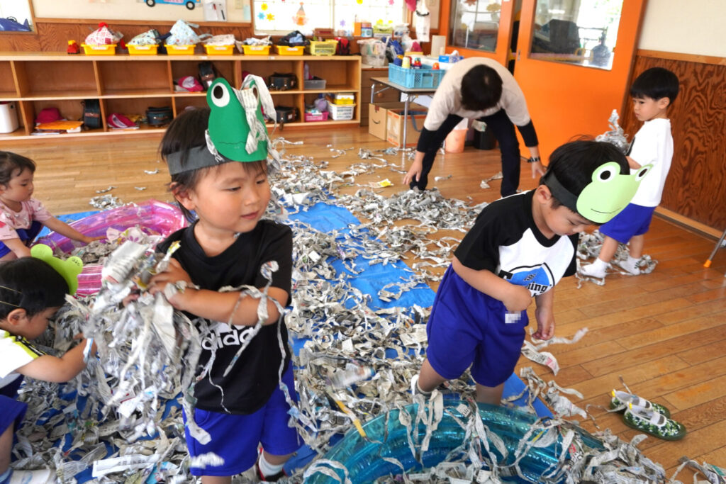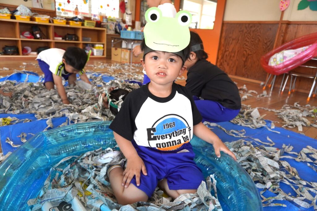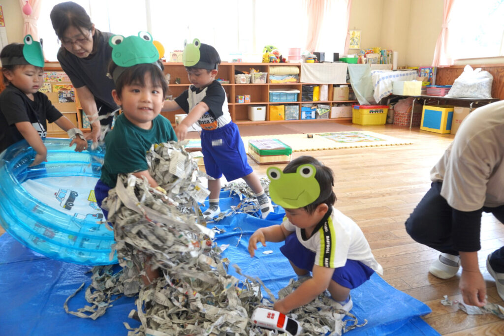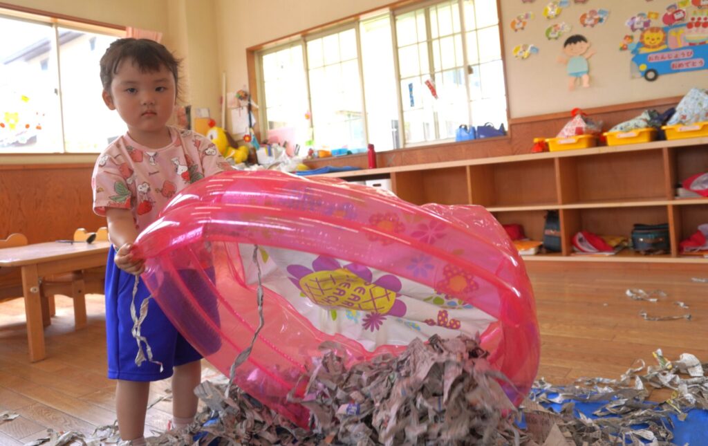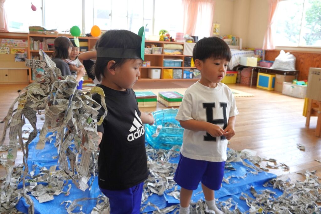 食後は新聞紙遊びをしました。パラパラ雨を降らせて、集めて、また降らせて…それがとてもおもしろくて、何回も何回も遊んでいました。