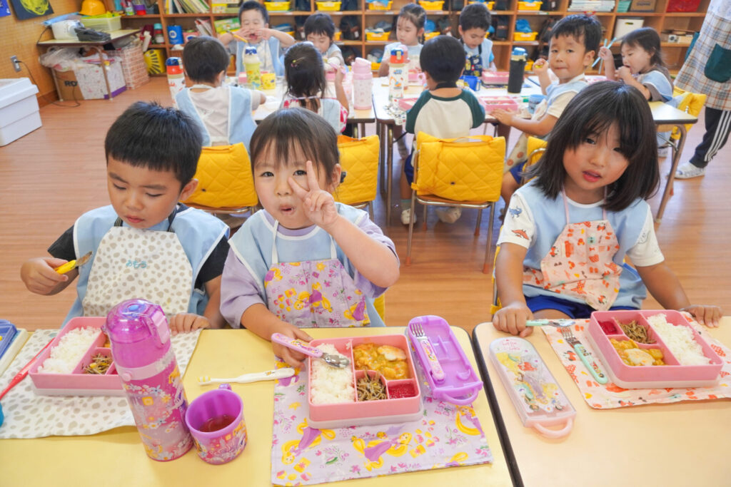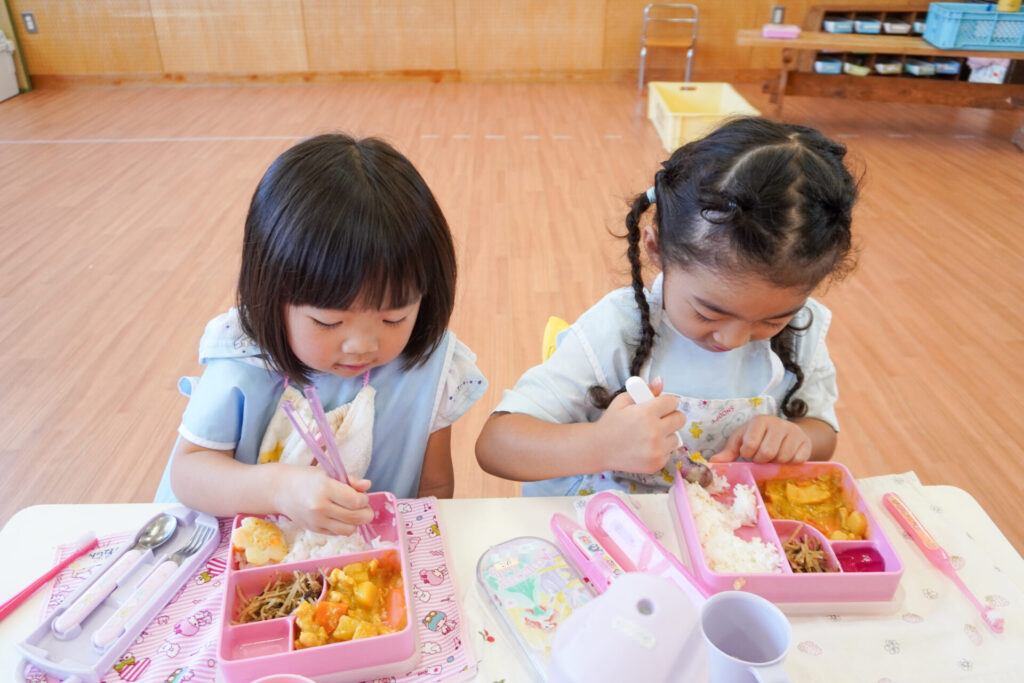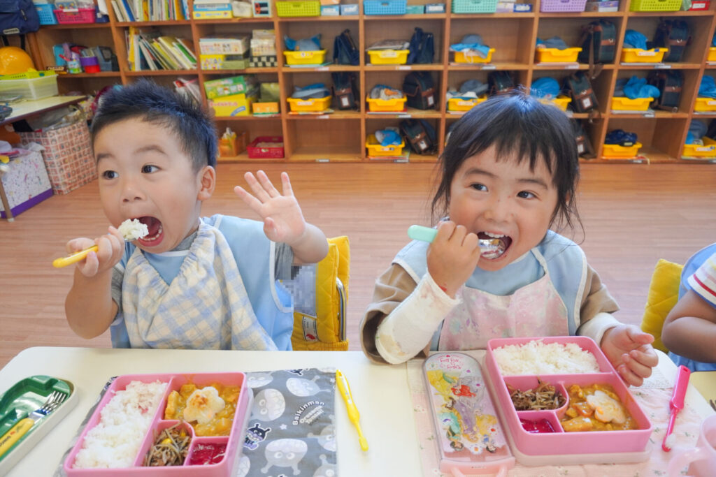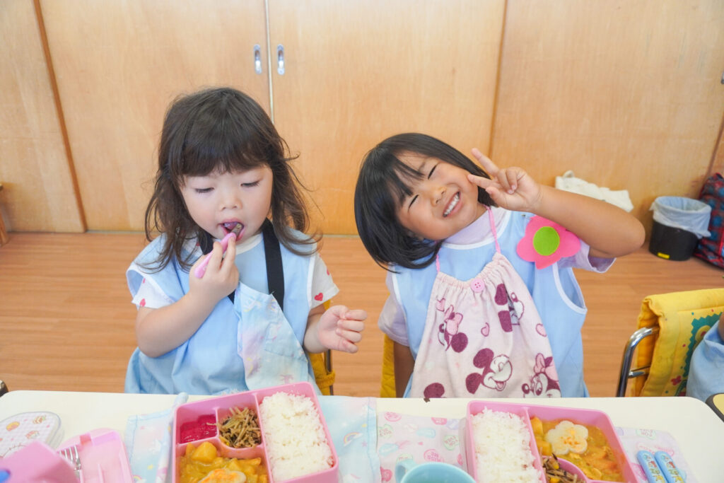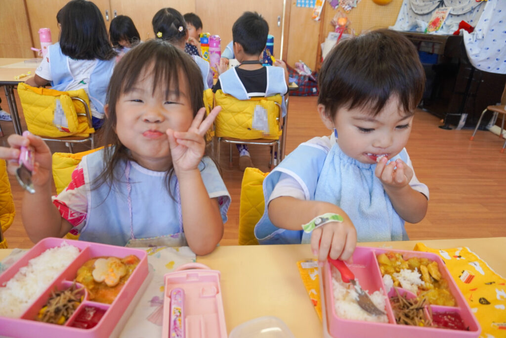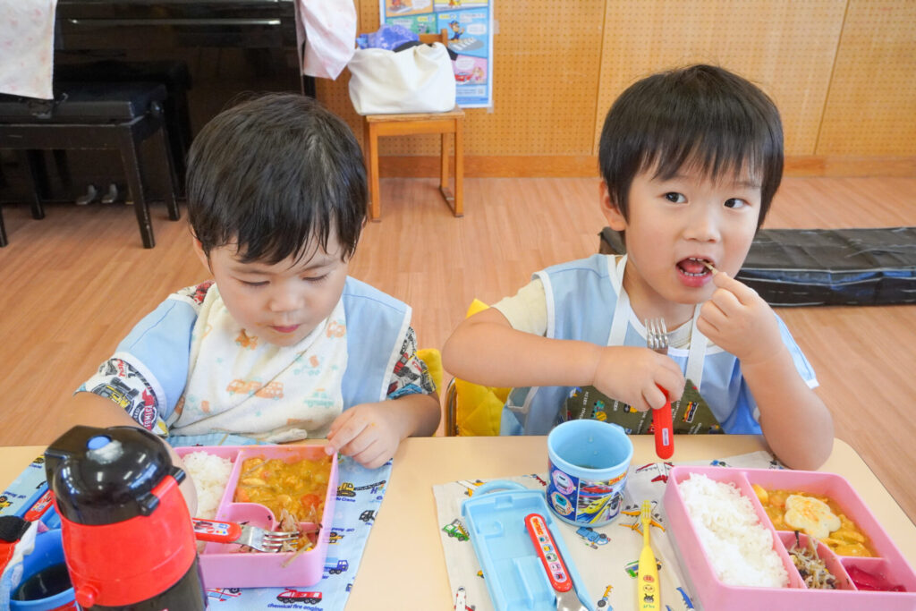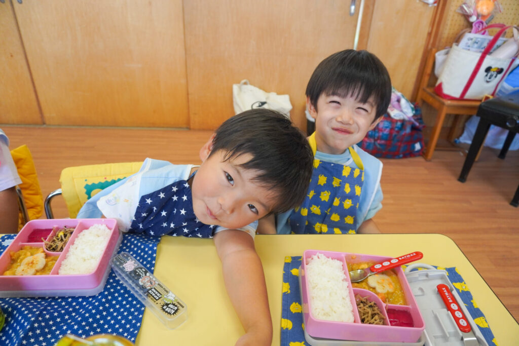 園での様子 給食(年少) madokahp 2025年9月9日 毎日楽しい昼食時間を過ごしています。年少ゆり組・ばら組は配膳の支度が身についてきて、自分できることが増えました。 今日の給食は「カレー」、そしてデザートは「グレープゼリー」でした。友だちとも「おいしいね」と会話が弾みます。食事中は出歩かずに座って過ごせるようになり、成長を感じています。 9月になっても暑い日が続いていて、どうしても食欲が落ちてしまいますが、毎日3食、栄養を摂って、幼稚園では元気いっぱい遊んで過ごしてほしいと願っています。 「早寝早起き朝ごはん」を合言葉に、規則正しい生活のもと、明日も元気に登園してくださいね。