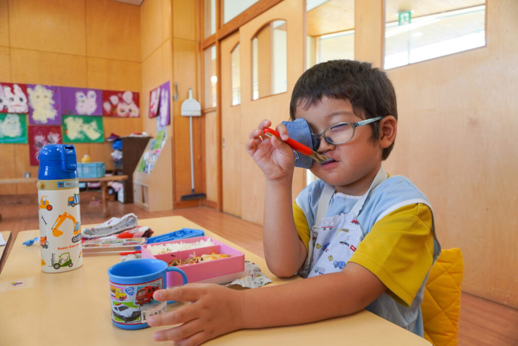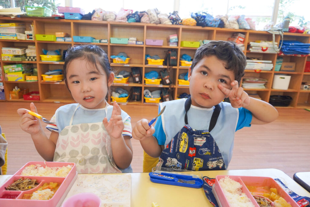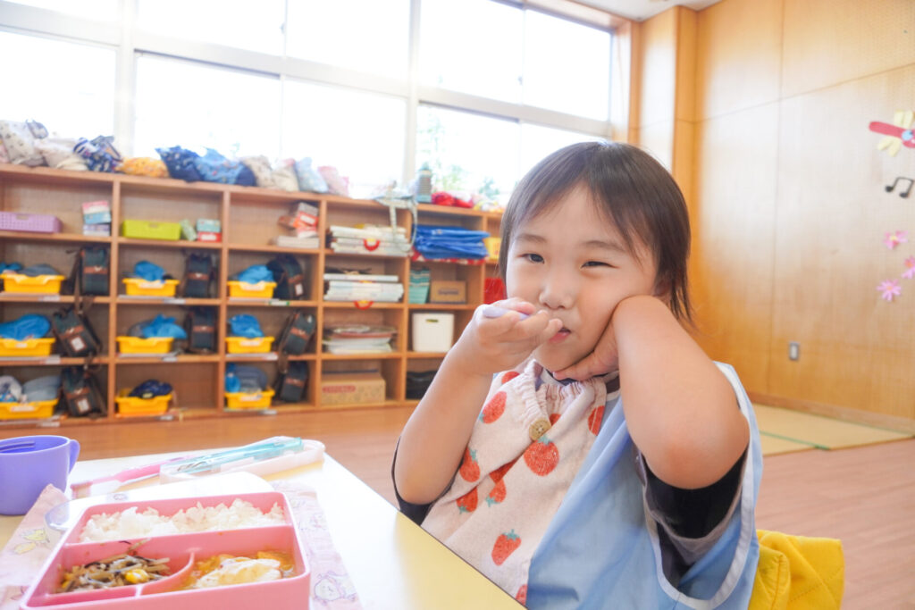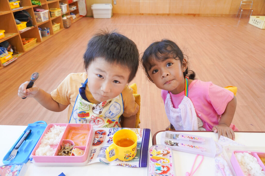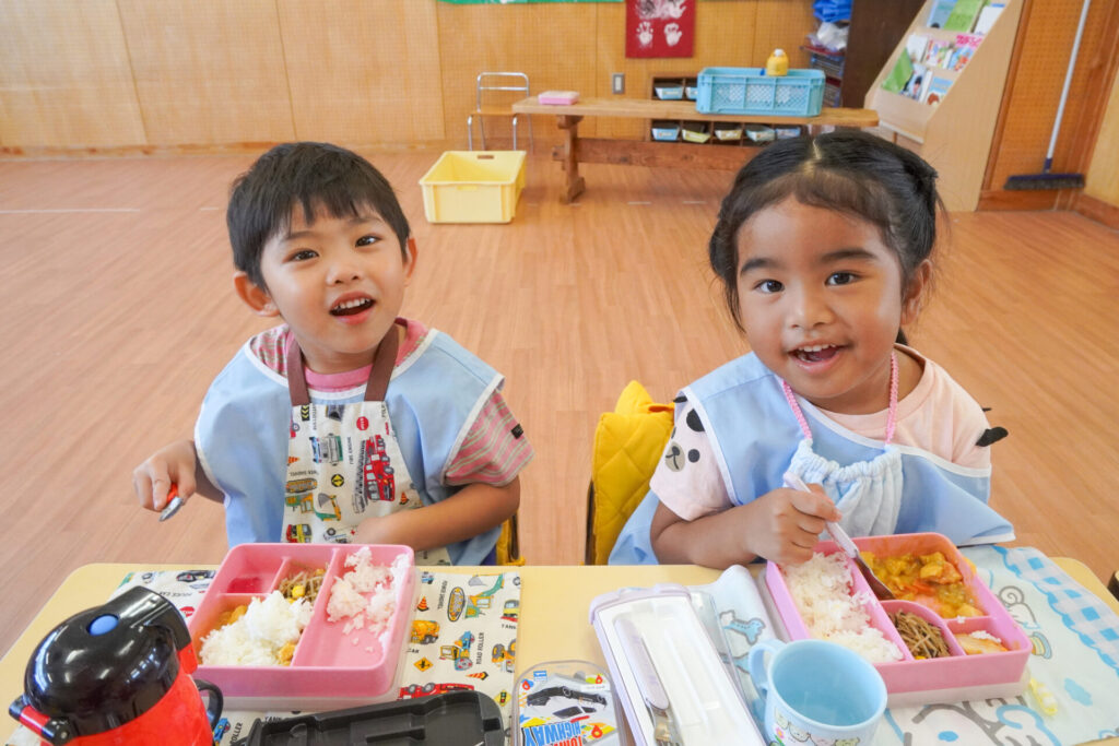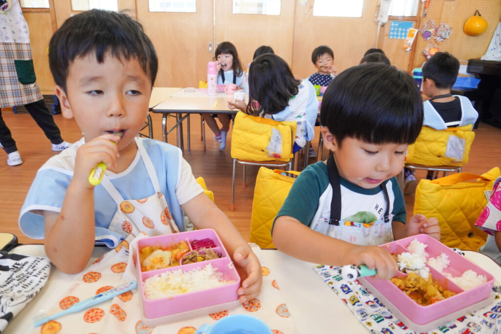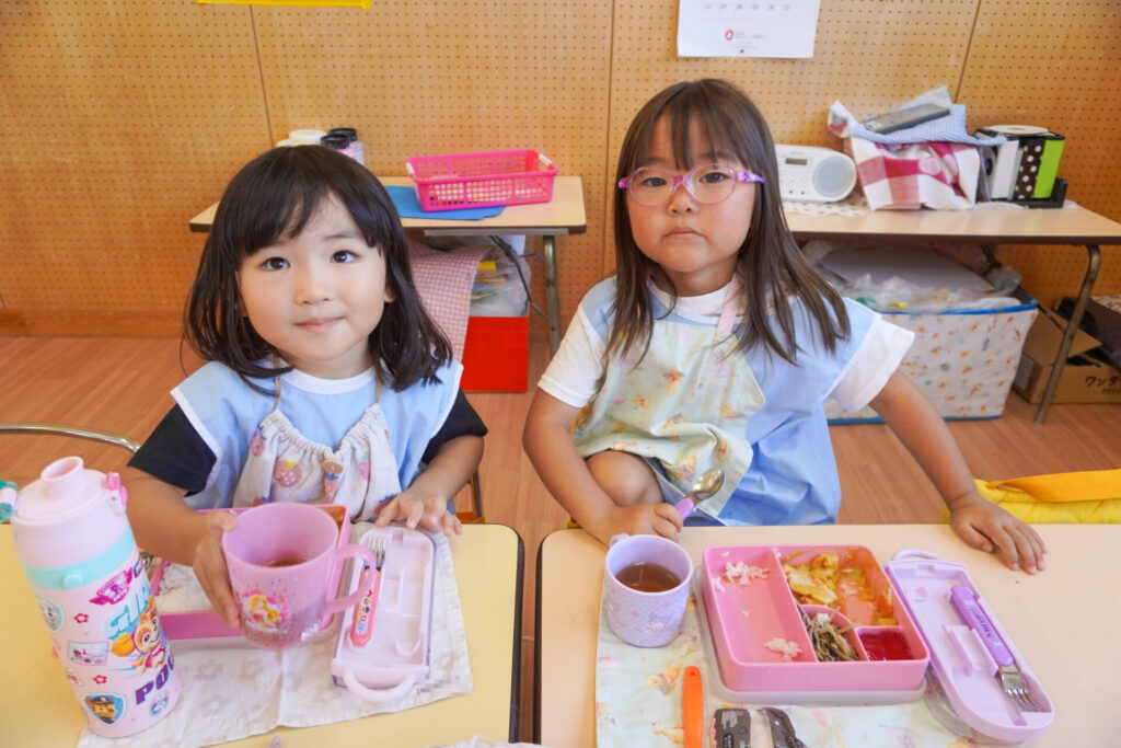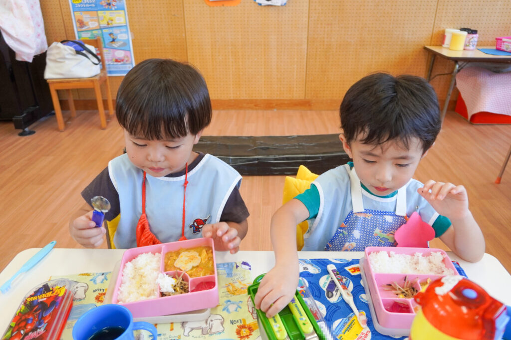 園での様子 給食(年少) madokahp 2025年9月9日 毎日楽しい昼食時間を過ごしています。年少ゆり組・ばら組は配膳の支度が身についてきて、自分できることが増えました。 今日の給食は「カレー」、そしてデザートは「グレープゼリー」でした。友だちとも「おいしいね」と会話が弾みます。食事中は出歩かずに座って過ごせるようになり、成長を感じています。 9月になっても暑い日が続いていて、どうしても食欲が落ちてしまいますが、毎日3食、栄養を摂って、幼稚園では元気いっぱい遊んで過ごしてほしいと願っています。 「早寝早起き朝ごはん」を合言葉に、規則正しい生活のもと、明日も元気に登園してくださいね。