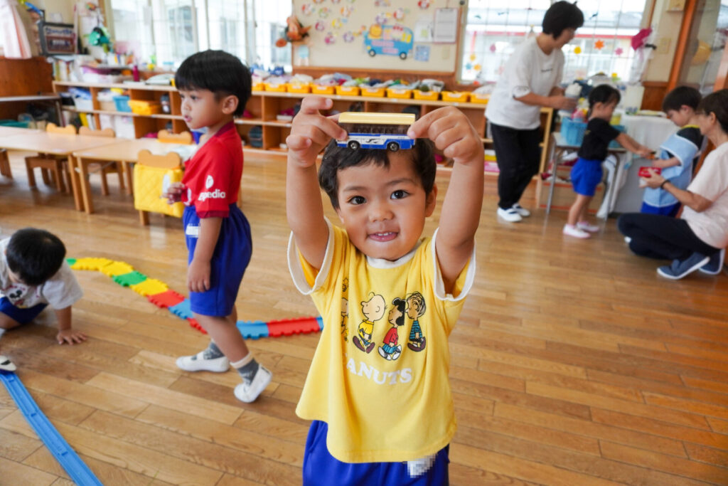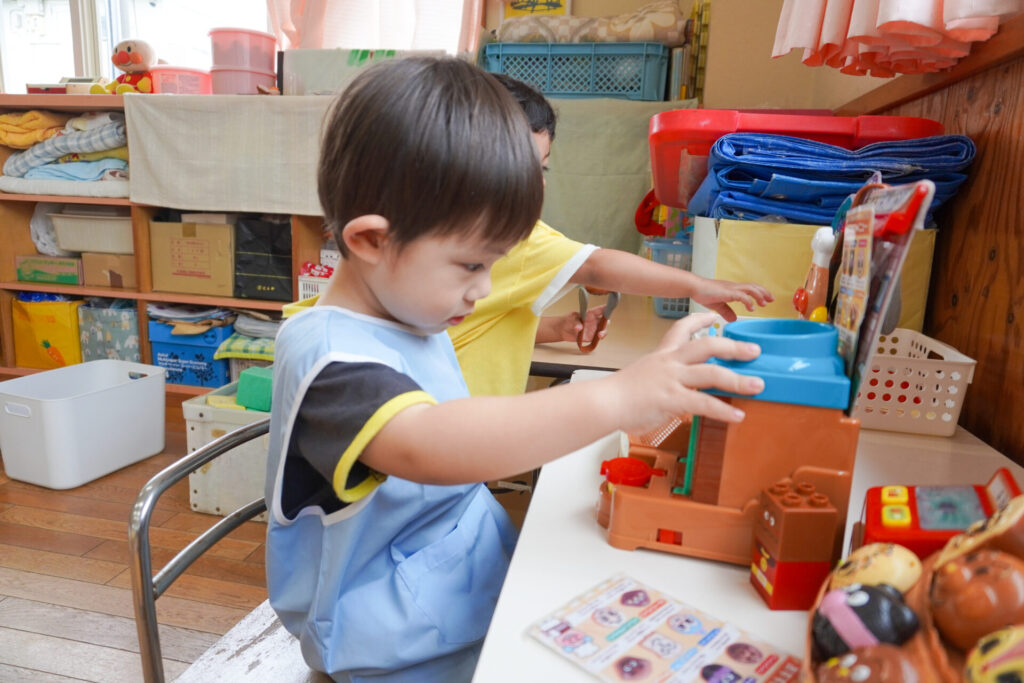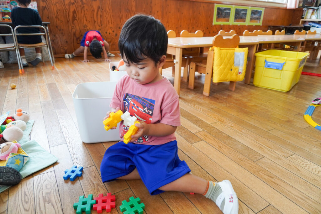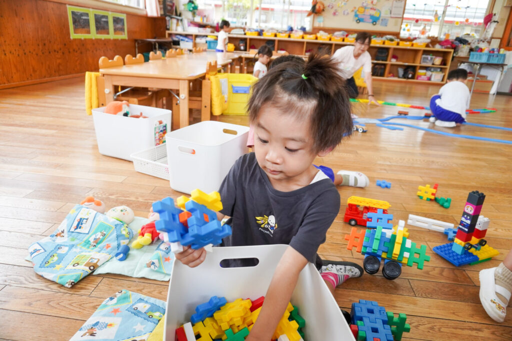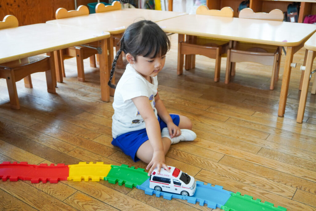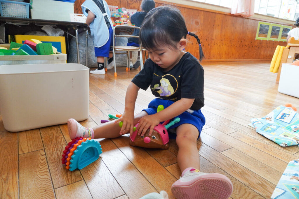 登園初日から、元気いっぱいです。「行ってきます!」と元気に挨拶ができ、バンビ組保育室へ入室ができました。朝は不安で泣いてしまった子もバンビ組保育室のおもちゃを見ると、手に取って遊び始めました。ブロックや電車も大好きです!