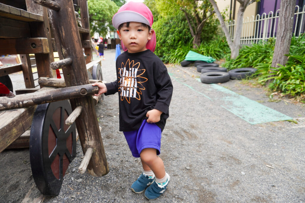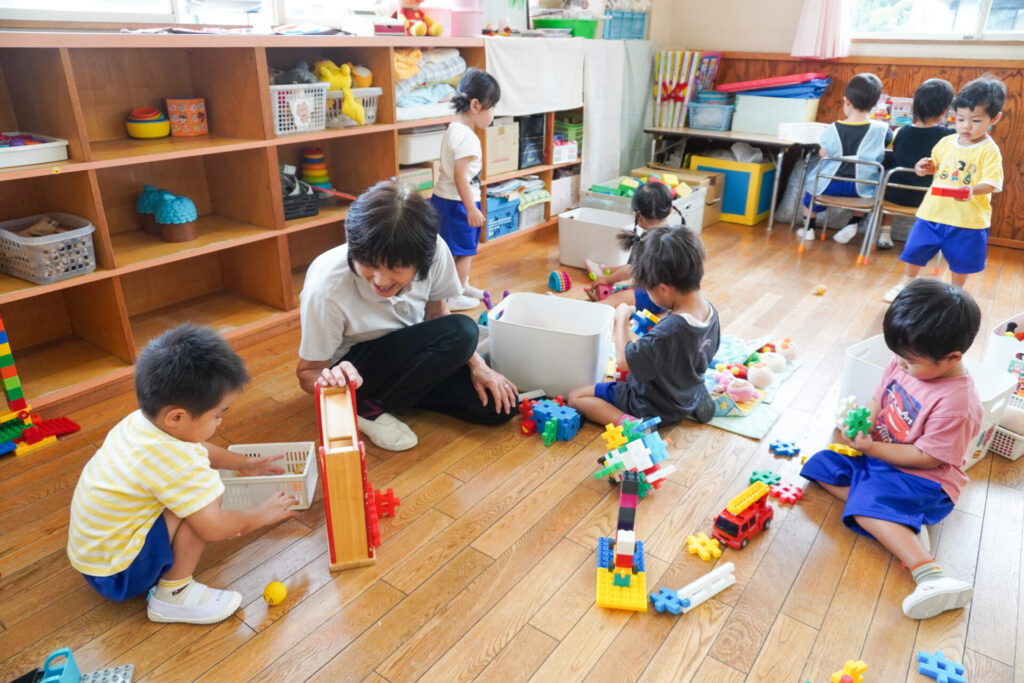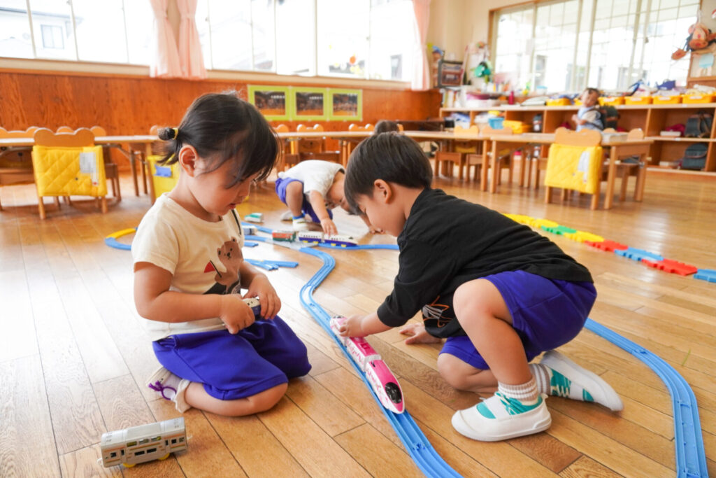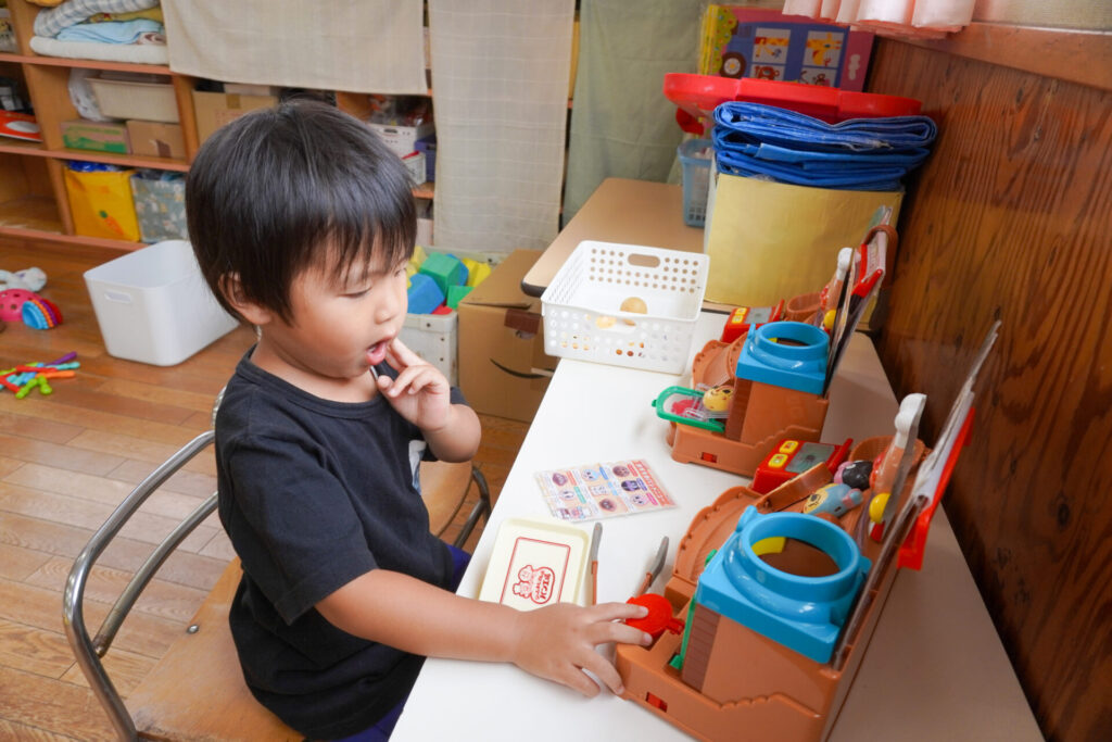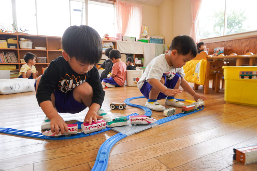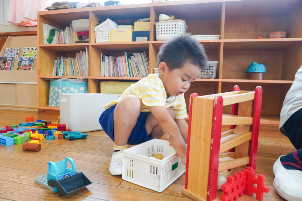 登園初日から、元気いっぱいです。「行ってきます!」と元気に挨拶ができ、バンビ組保育室へ入室ができました。朝は不安で泣いてしまった子もバンビ組保育室のおもちゃを見ると、手に取って遊び始めました。ブロックや電車も大好きです!
