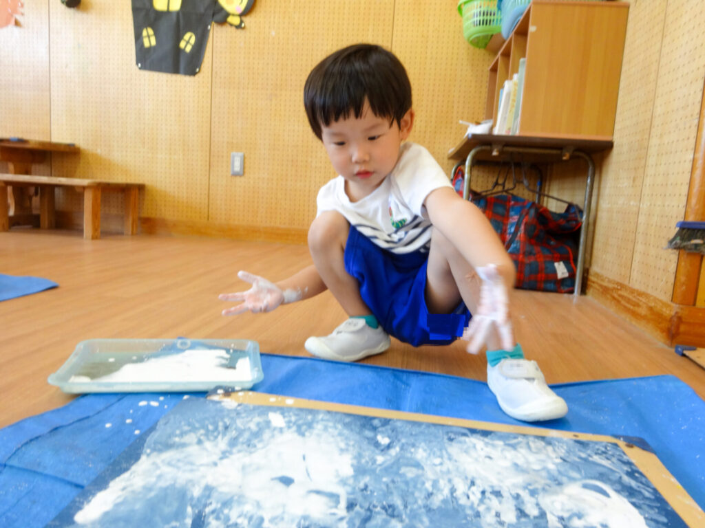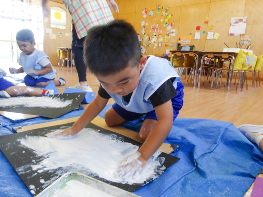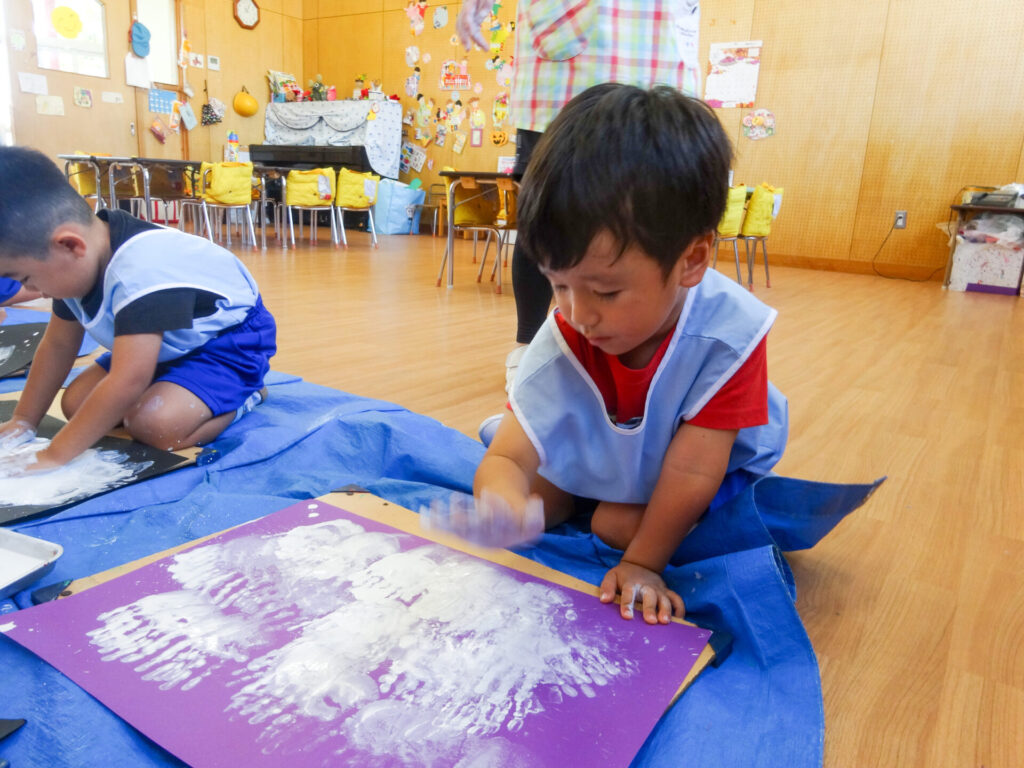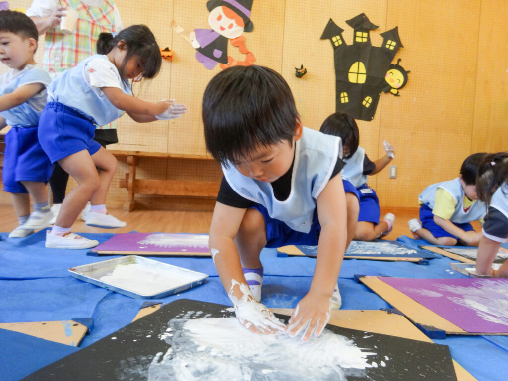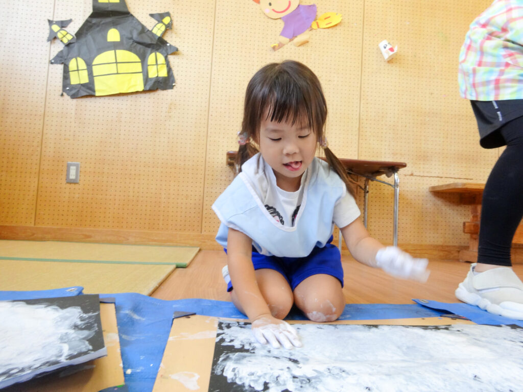 両手に真っ白な絵の具を付けて、さぁ、画用紙へ!グルグルグル…ペタペタペタペタ…「おばけだぞー!」と言いながら力強いく表現していきます。少々の汚れは気にしません。絵の具の感触も楽しみながら、画用紙いっぱいに表現できました。