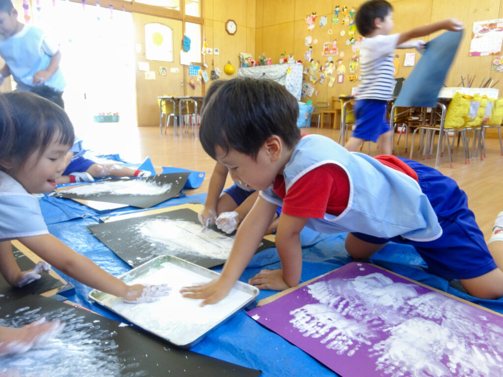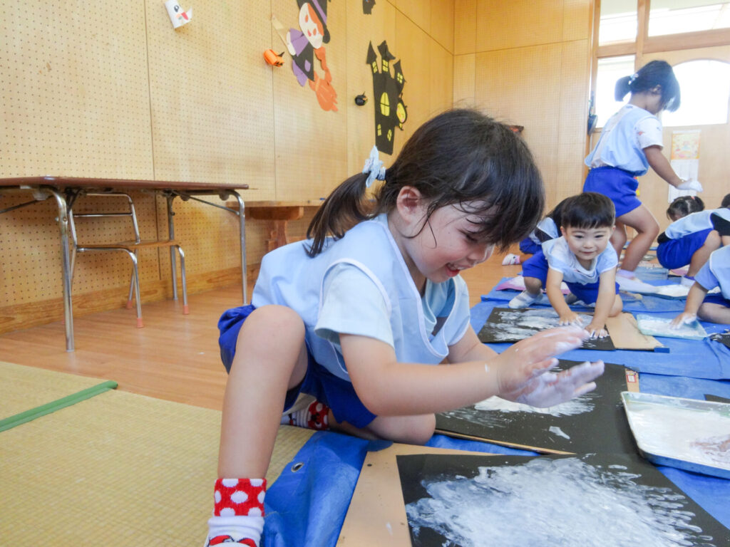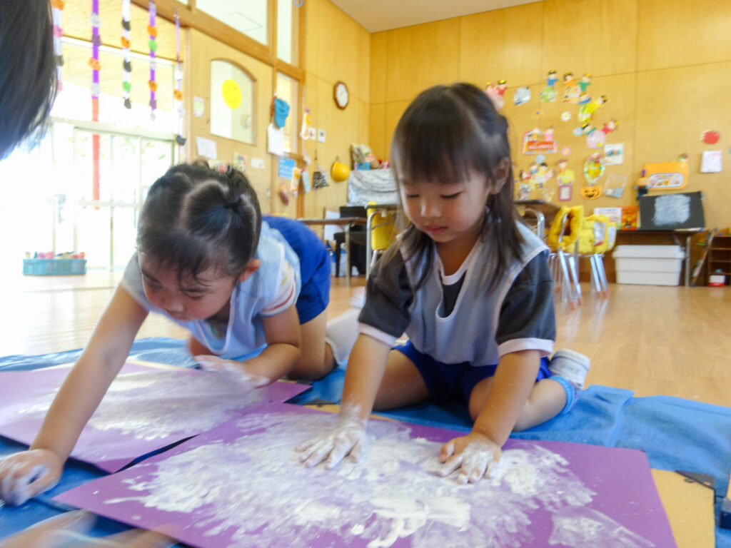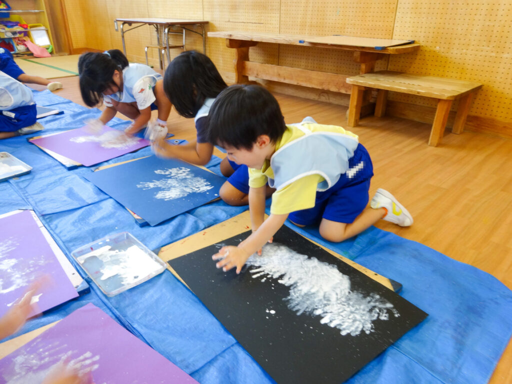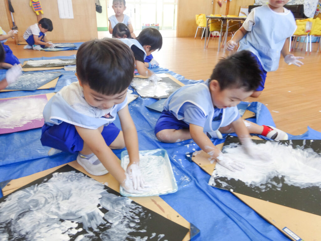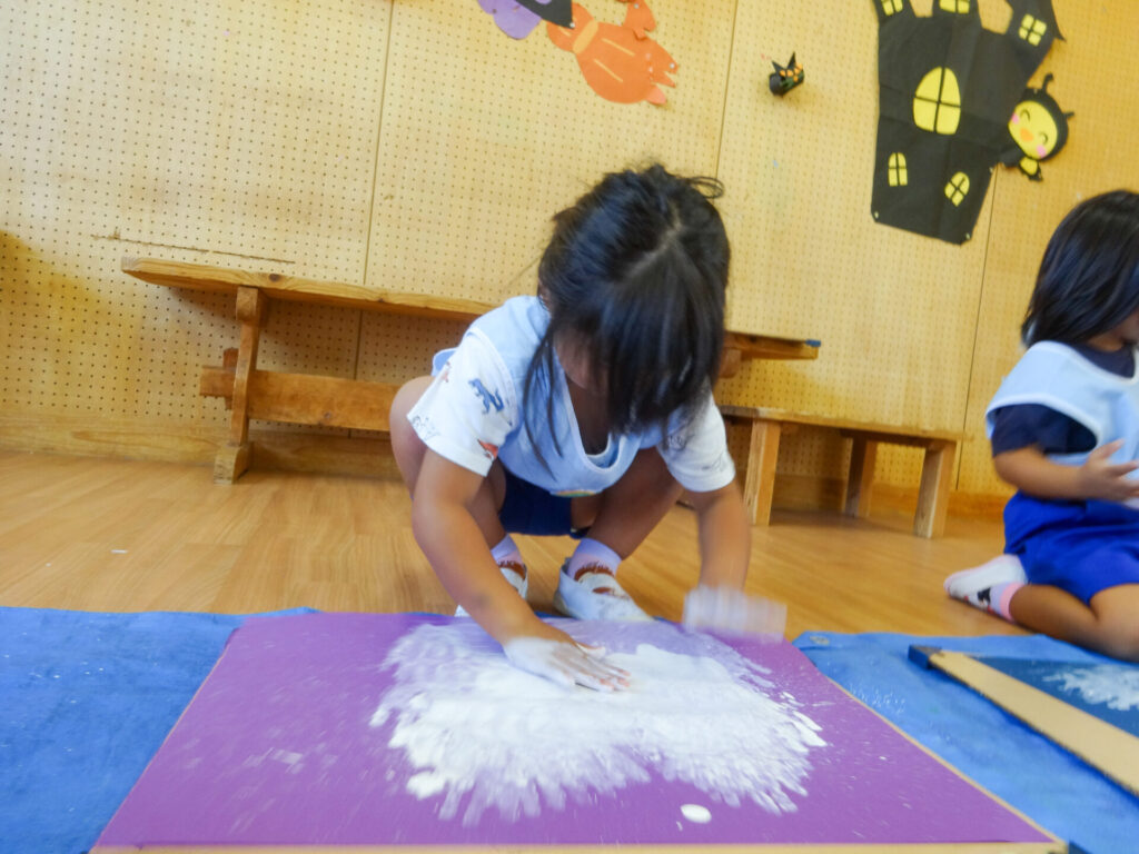 両手に真っ白な絵の具を付けて、さぁ、画用紙へ!グルグルグル…ペタペタペタペタ…「おばけだぞー!」と言いながら力強いく表現していきます。少々の汚れは気にしません。絵の具の感触も楽しみながら、画用紙いっぱいに表現できました。