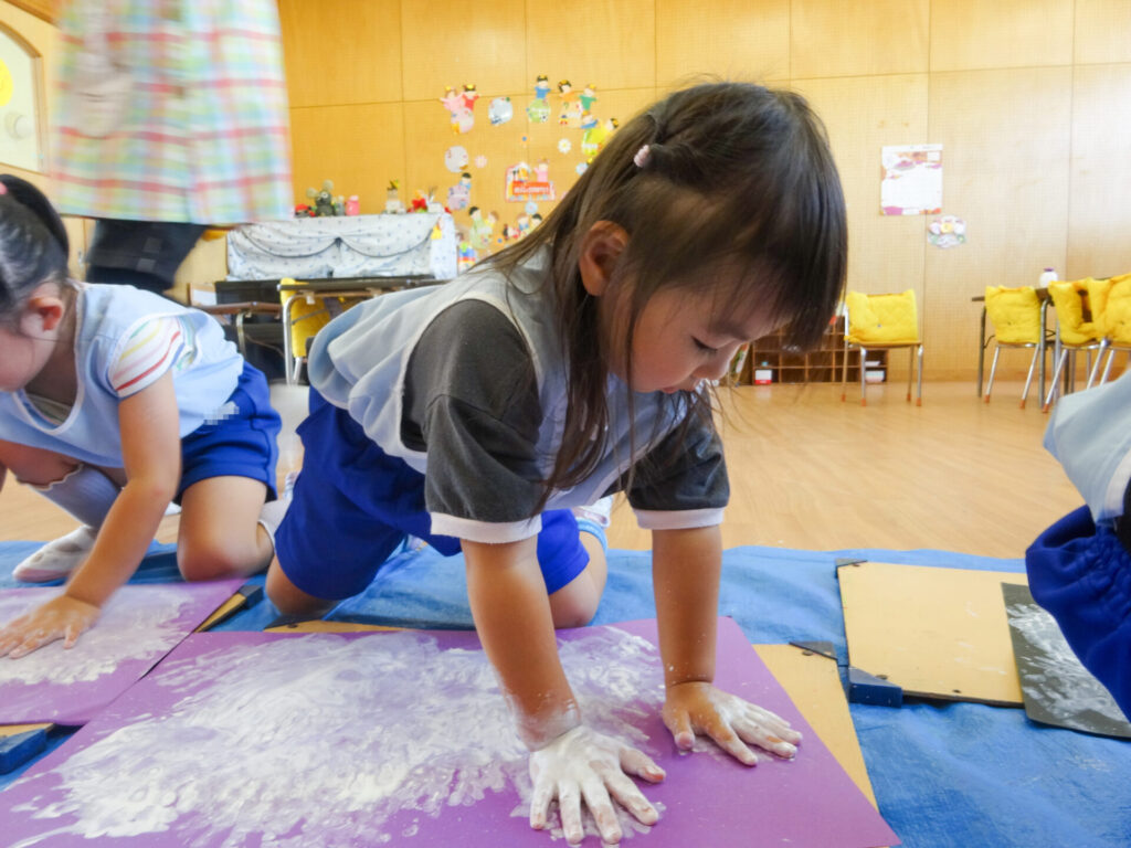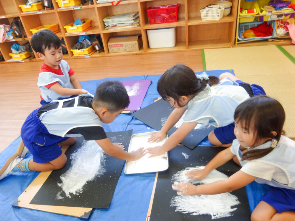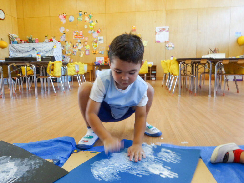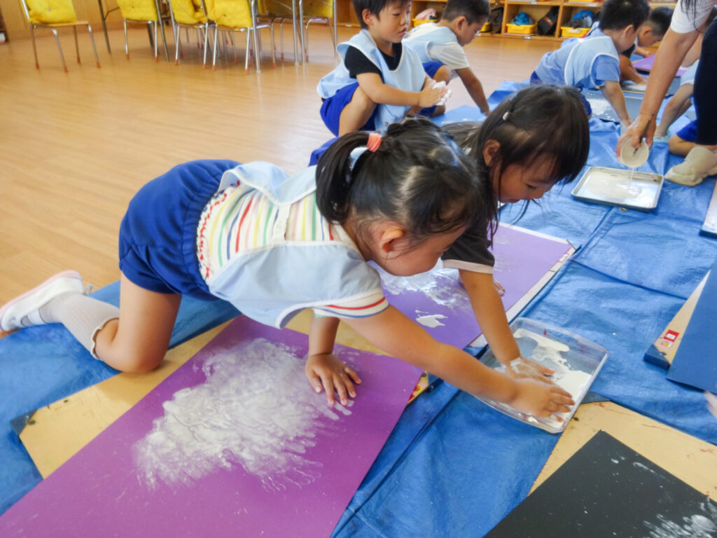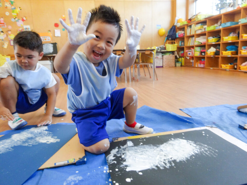 両手に真っ白な絵の具を付けて、さぁ、画用紙へ!グルグルグル…ペタペタペタペタ…「おばけだぞー!」と言いながら力強いく表現していきます。少々の汚れは気にしません。絵の具の感触も楽しみながら、画用紙いっぱいに表現できました。