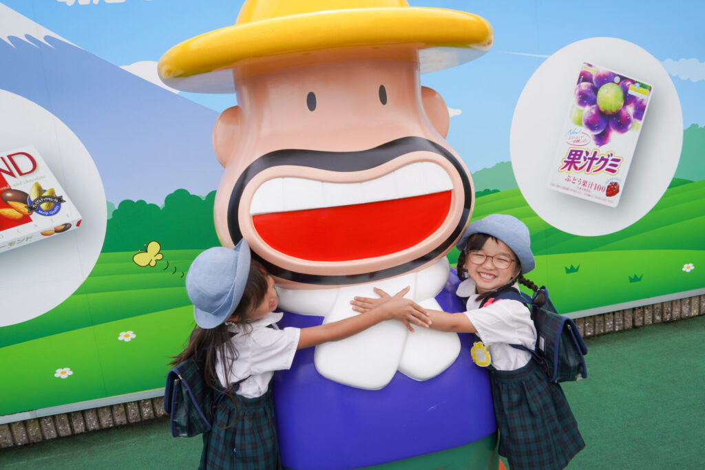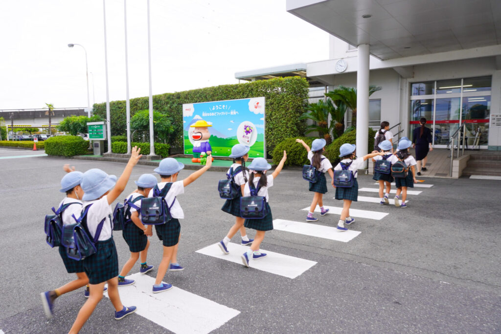 年長つき組がスクールバスで藤枝市の「明治なるほどファクトリー東海」へ見学に行ってきました。入口では「カールおじさん」がつき組をにこやかに出迎えてくれました。
