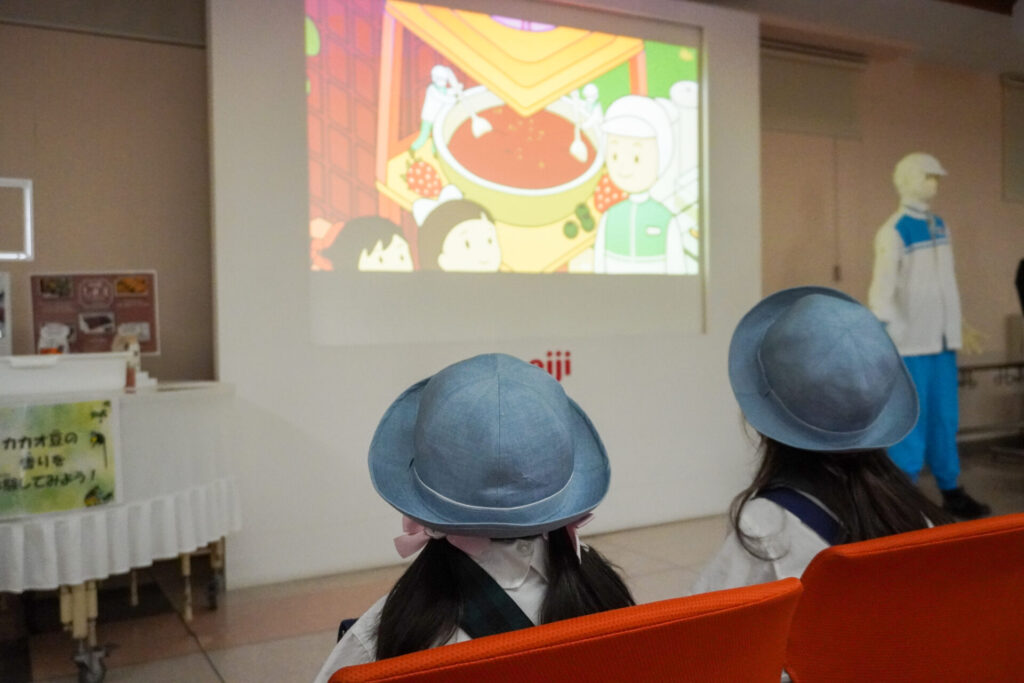 まずは、映像にて、生乳やカカオなどの原料、乳酸菌やチョコレートなどの様々な研究開発、品質管理などにおける、安全・安心なモノづくりへの「こだわり」について、見て知ることができました。映像をよく見て時に頷いたり、びっくりしたり、知らないことを知ることができてまたひとつ知識が増えました。