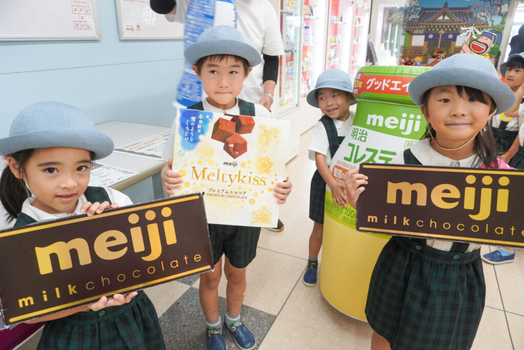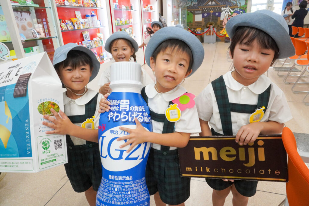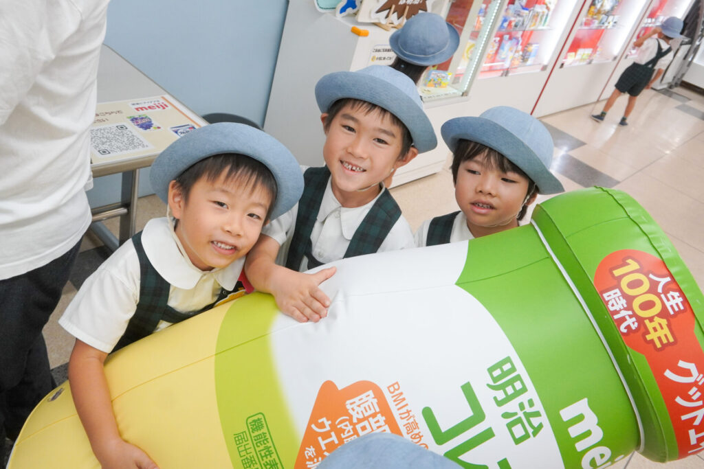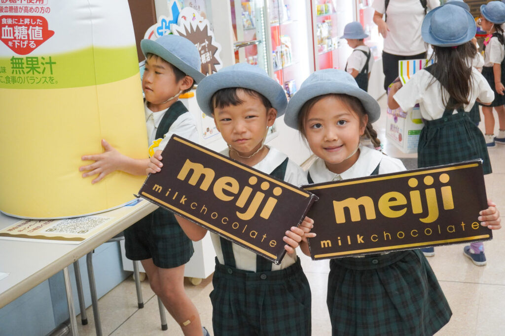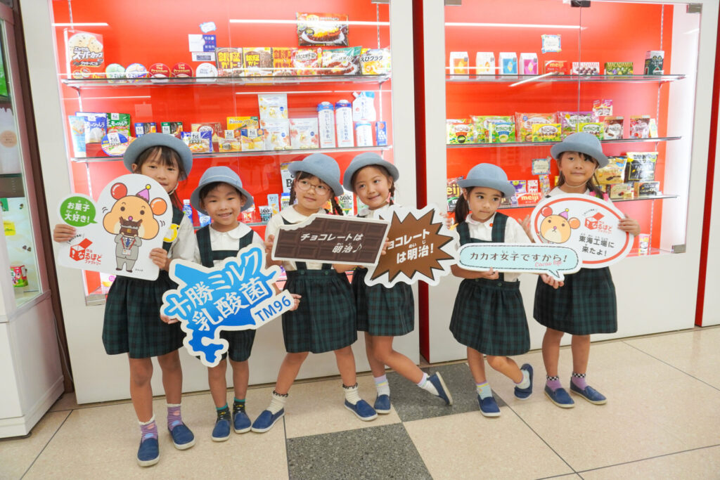 あっという間の見学でしたが、実際に目で見て聞いて、実体験もできて、更に興味も広がりました。普段目にしたり口にしている大好きな「meiji」のお菓子の大きなパネルを抱えたり、持ったり…「これ、飲んだことあるよ」「このお菓子、おいしいね」と、どれも知っている食品ばかりでした。