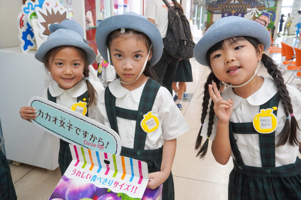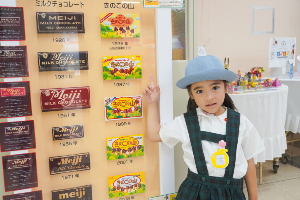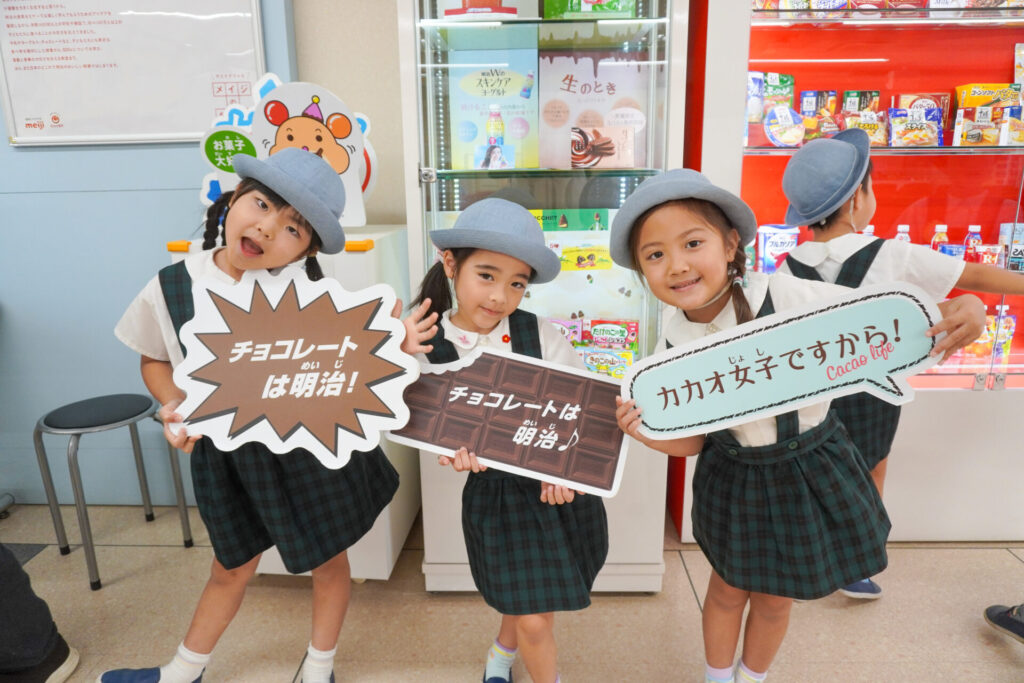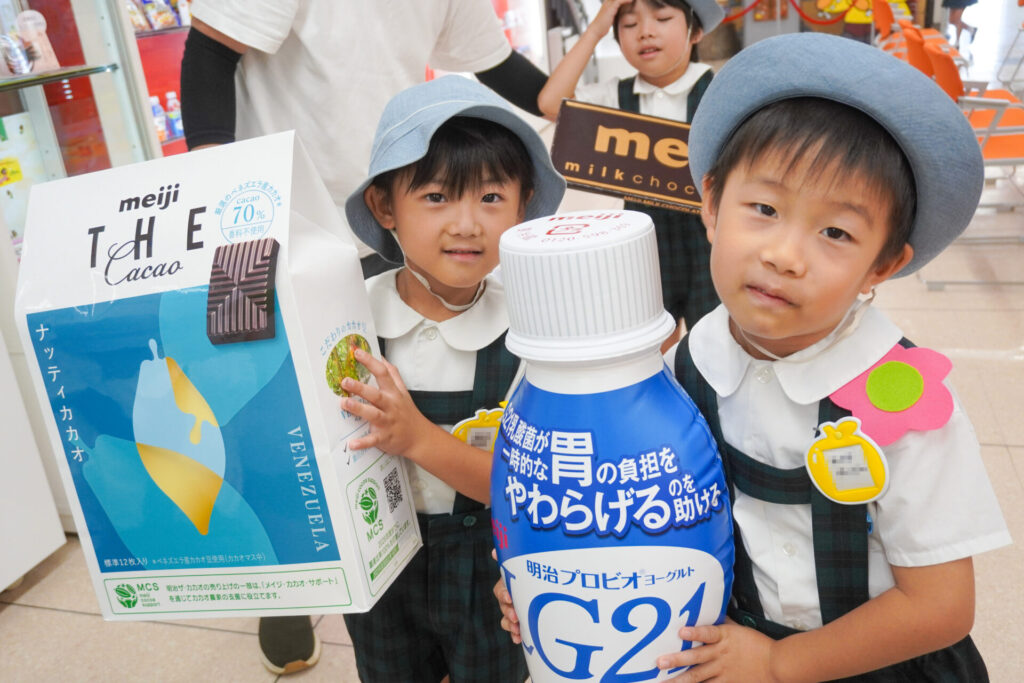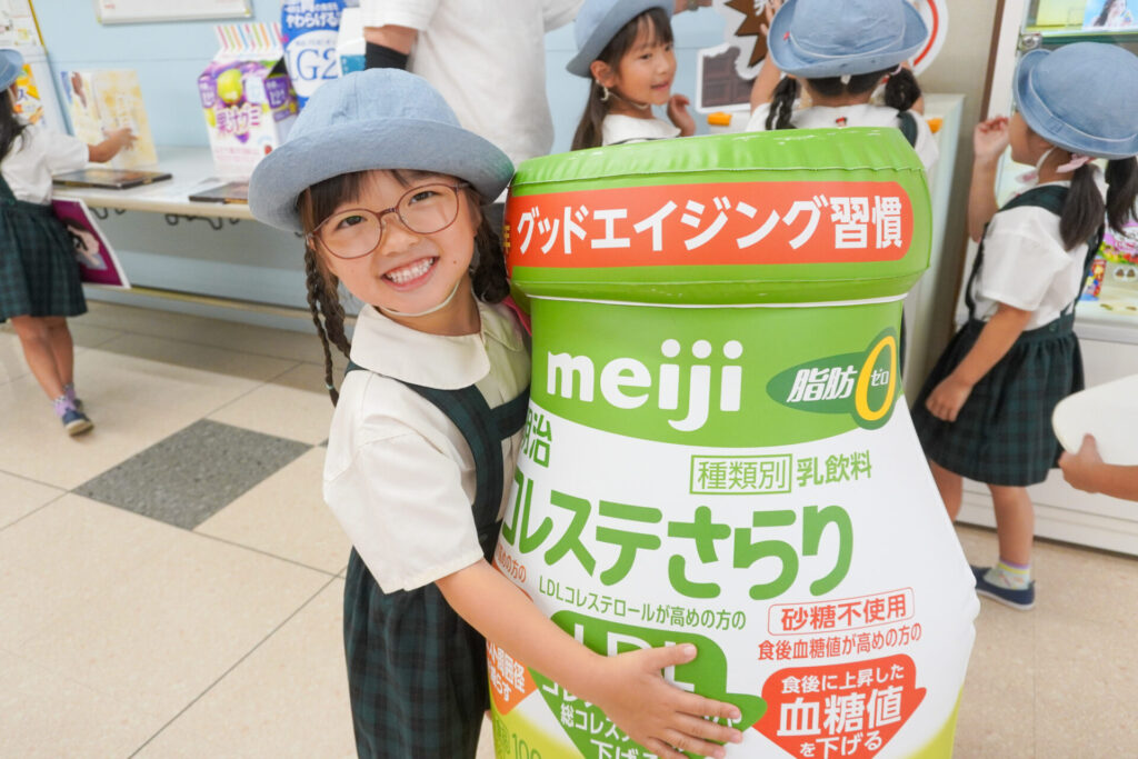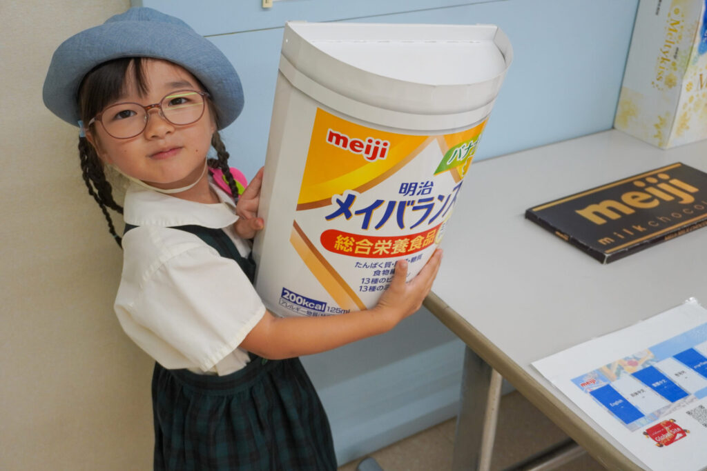 あっという間の見学でしたが、実際に目で見て聞いて、実体験もできて、更に興味も広がりました。普段目にしたり口にしている大好きな「meiji」のお菓子の大きなパネルを抱えたり、持ったり…「これ、飲んだことあるよ」「このお菓子、おいしいね」と、どれも知っている食品ばかりでした。