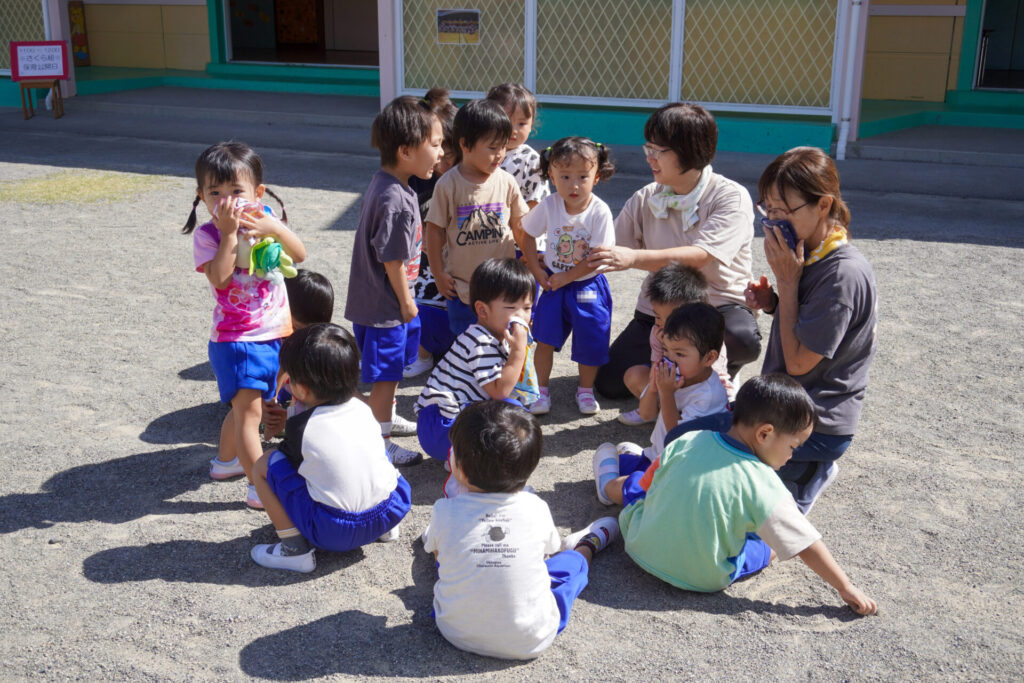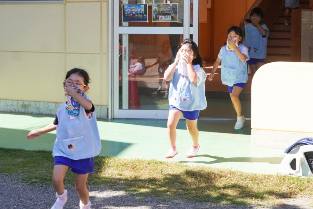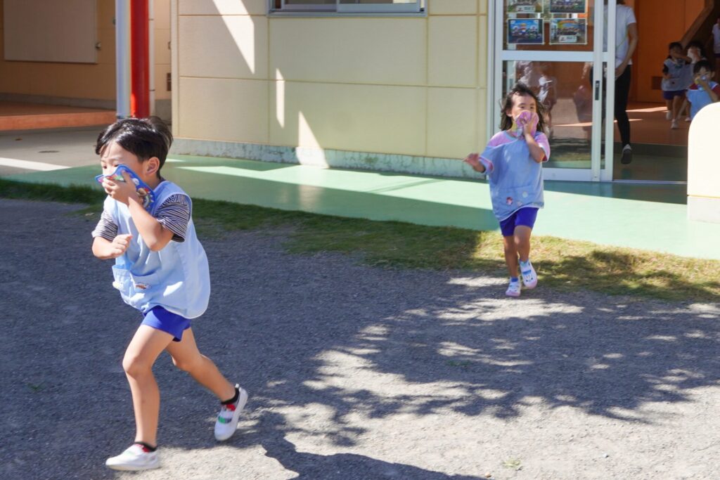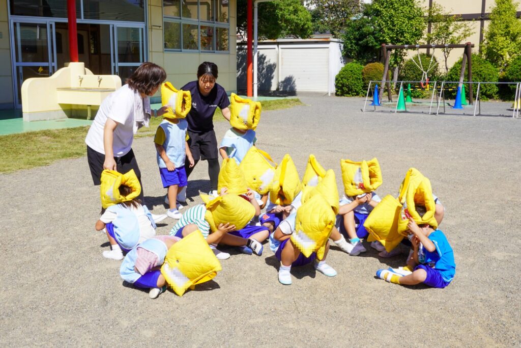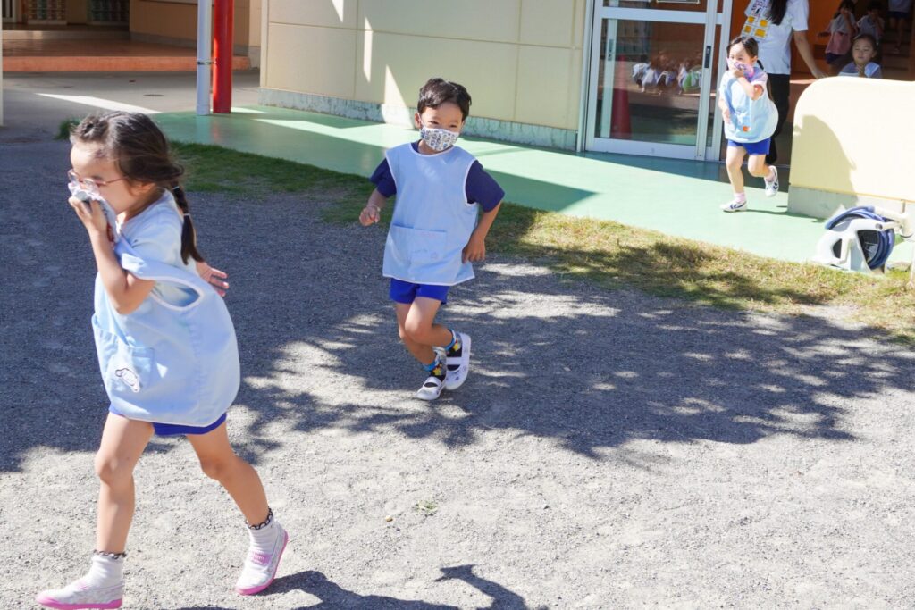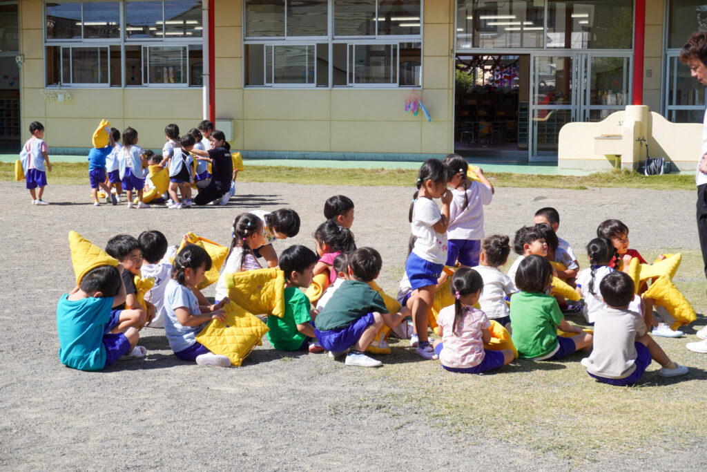 年長つき組と年中さくら組は、すぐにポケットからハンカチを取り出し、口と鼻に当てていて、これまでの訓練が身についたことを感じました。