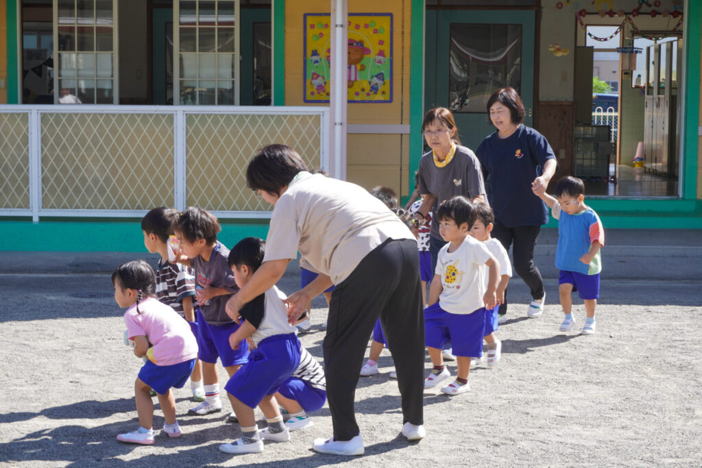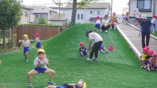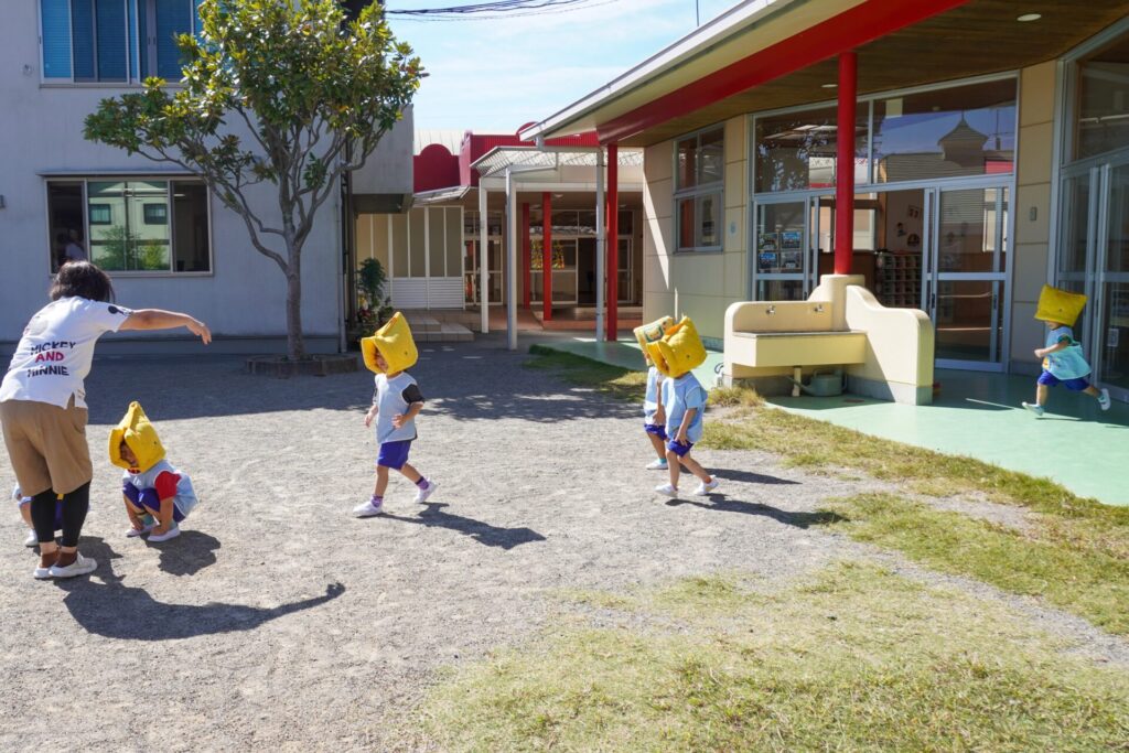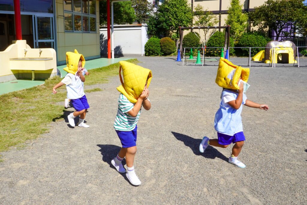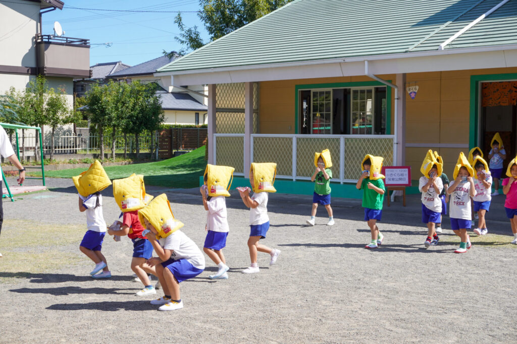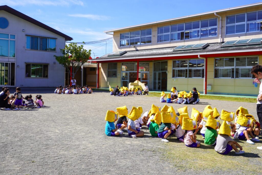 年長つき組と年中さくら組は、すぐにポケットからハンカチを取り出し、口と鼻に当てていて、これまでの訓練が身についたことを感じました。