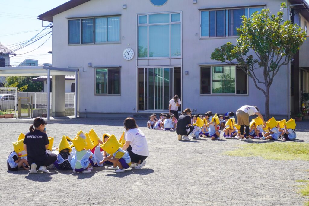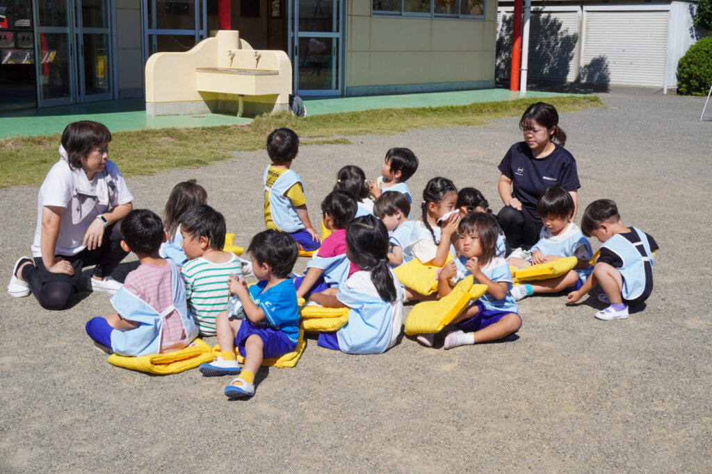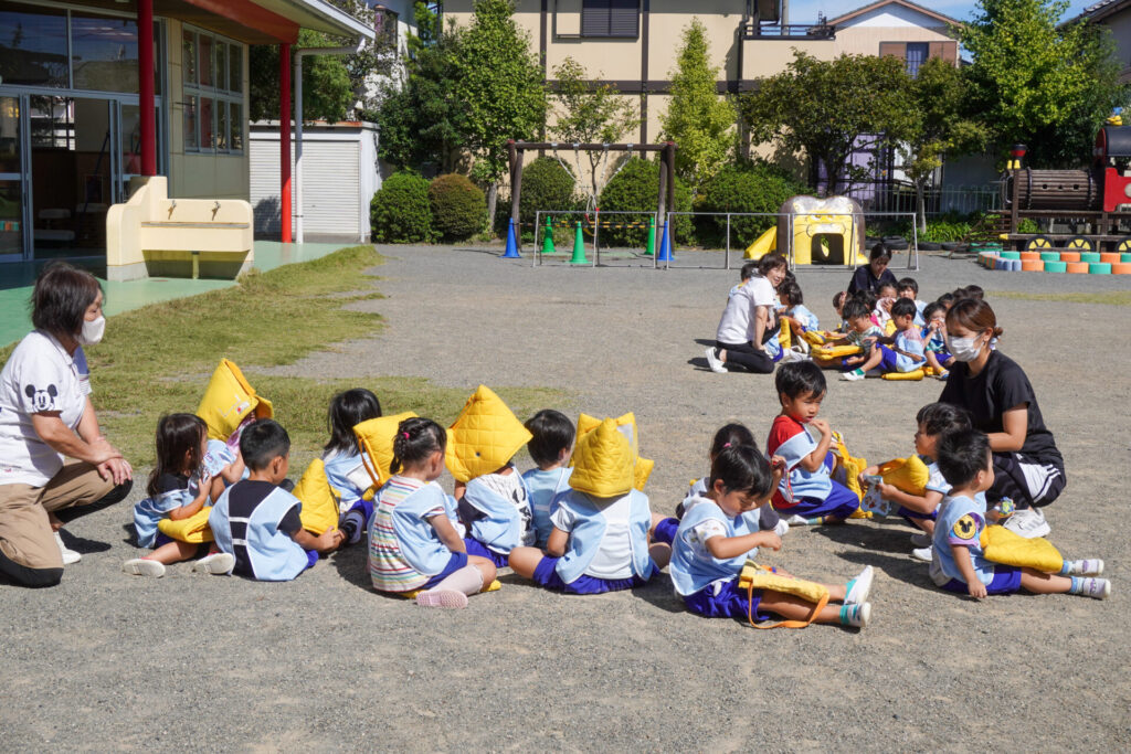年少ゆり組・ばら組、満3歳児バンビ組は、びっくりした子もいましたが、保育者の話を聞いて、「ハンカチマスク」を覚えました。また、ハンカチが手元にない場合は、手で口や鼻を抑えて、できるだけ煙を吸わないように話をしました。マニュアルはもちろん大切ですが、いつ、どこで、何が起きるか分からないことも合わせて、子どもたちに分かりやすく伝えるようにしています。