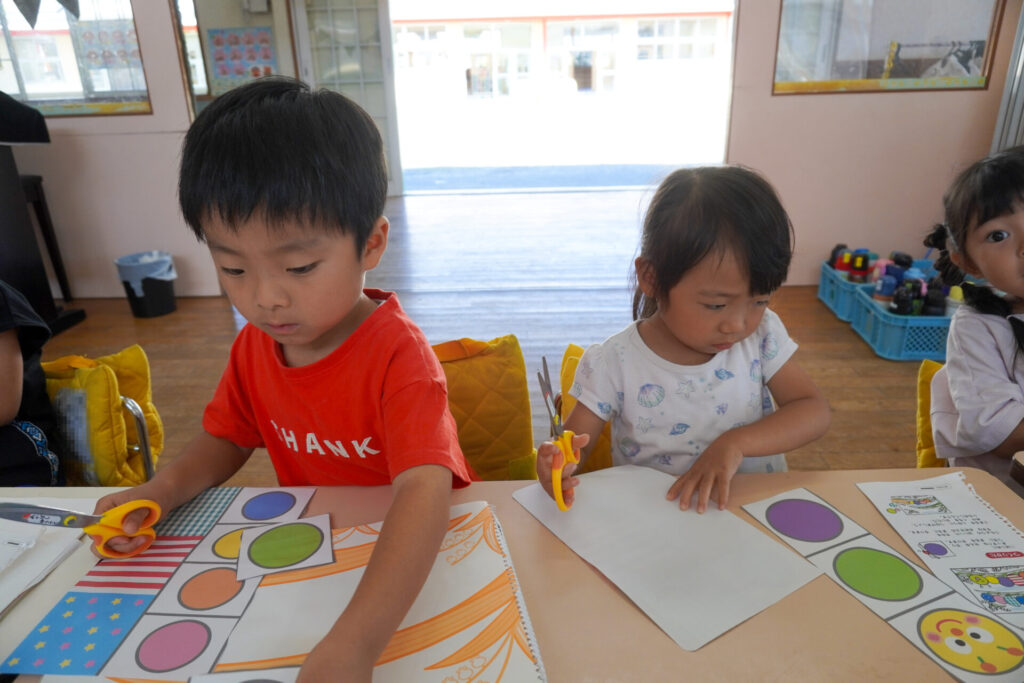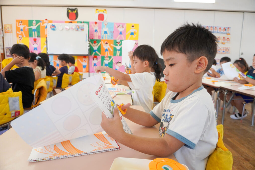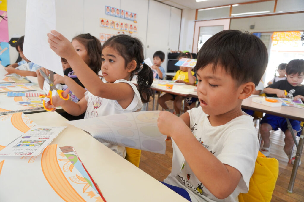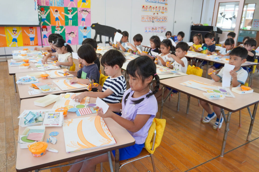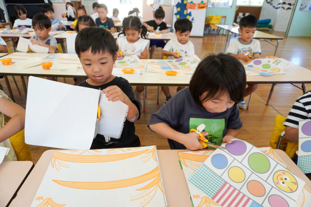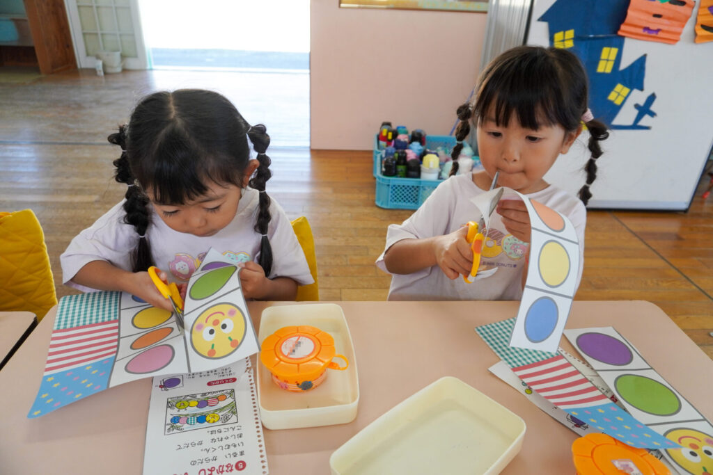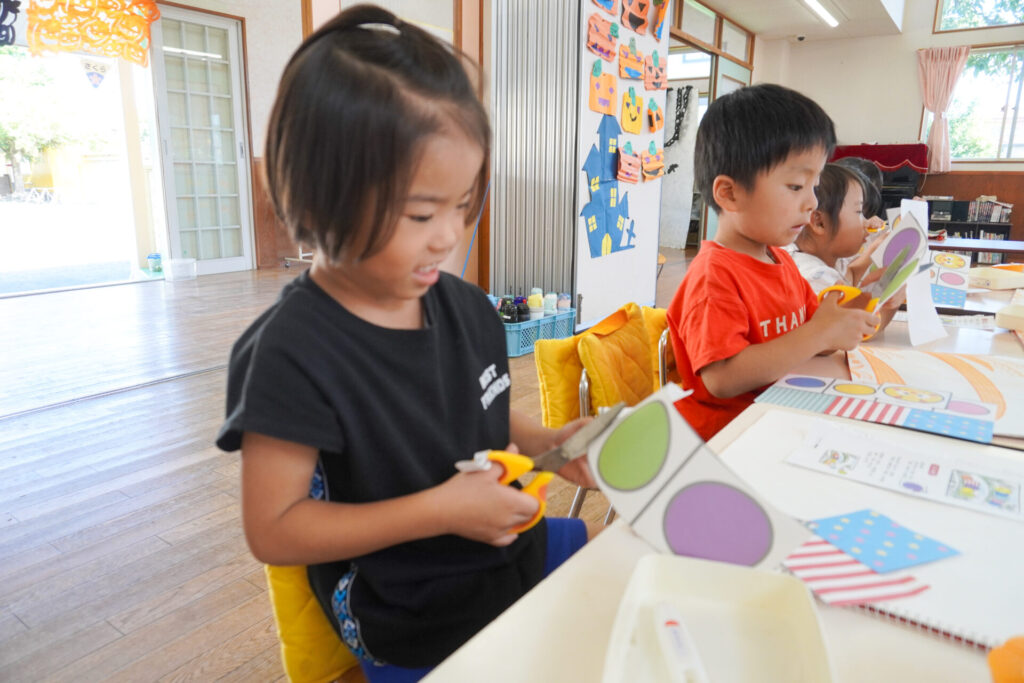 制作が大好きな年中さくら組です。はさみの扱いが上手になり、まっすぐに切れるようになりました。はさみの刃は上に向けること、切る時は紙を回すことを約束して、切り紙遊びを行いました。