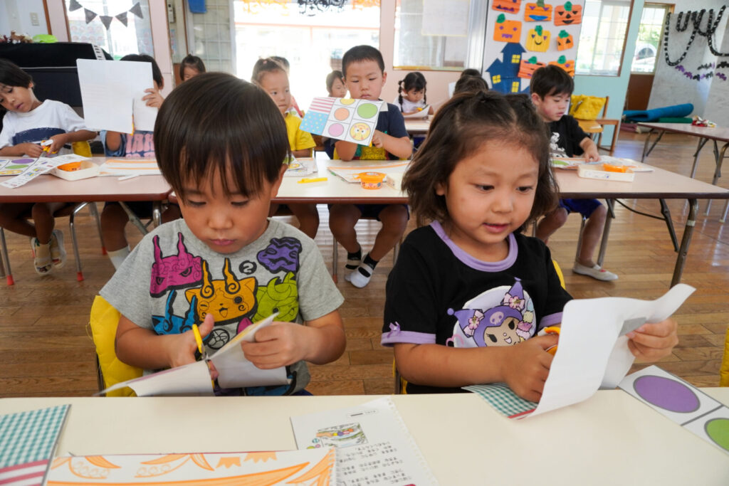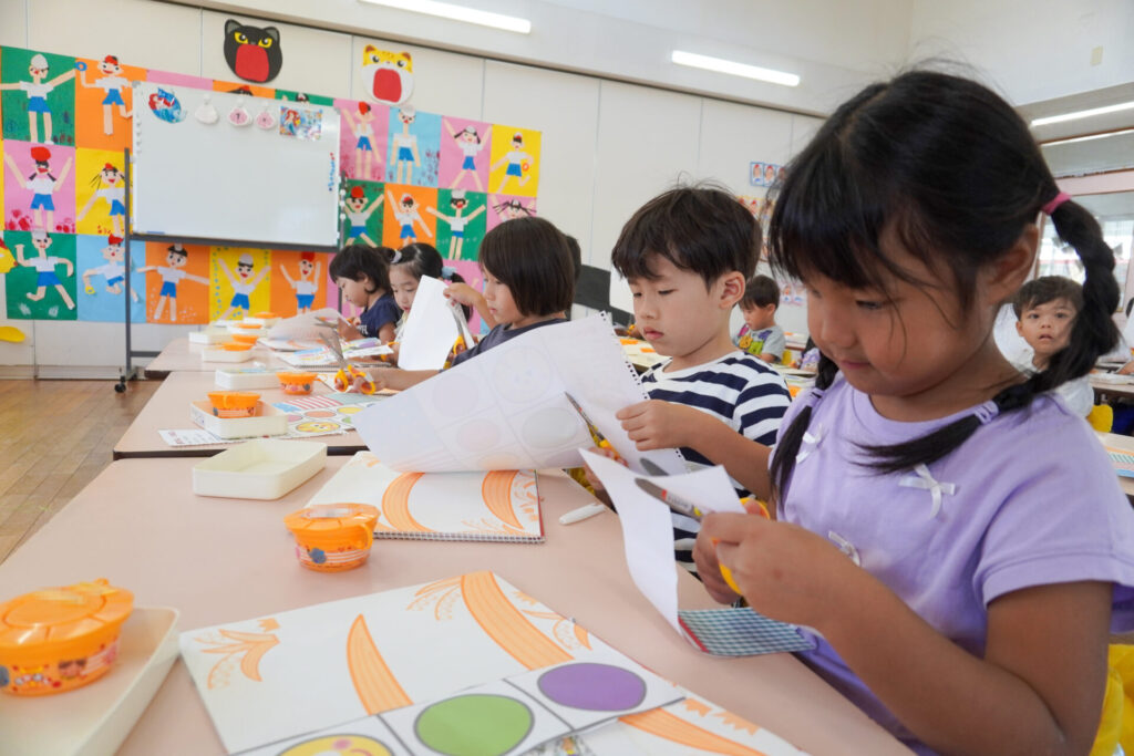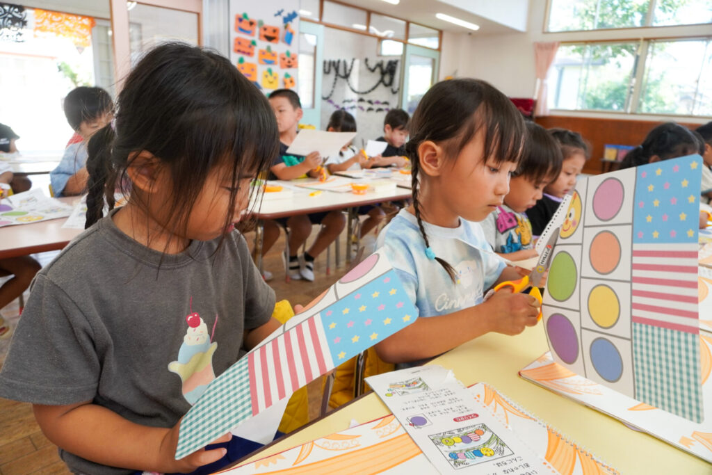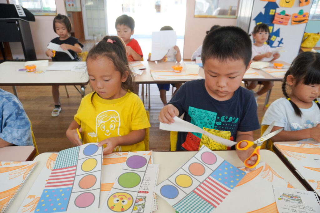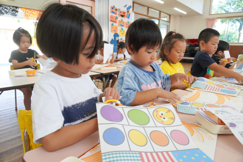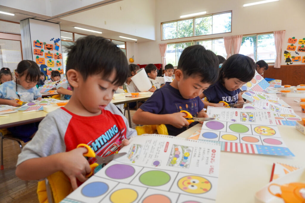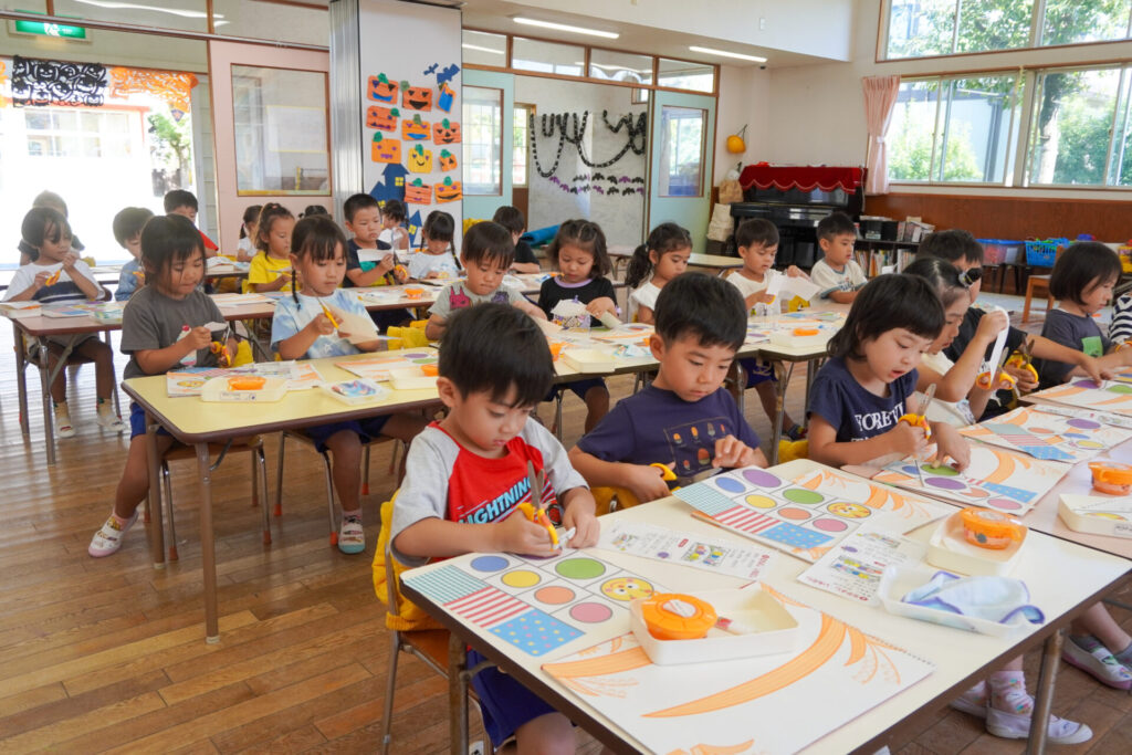 制作が大好きな年中さくら組です。はさみの扱いが上手になり、まっすぐに切れるようになりました。はさみの刃は上に向けること、切る時は紙を回すことを約束して、切り紙遊びを行いました。