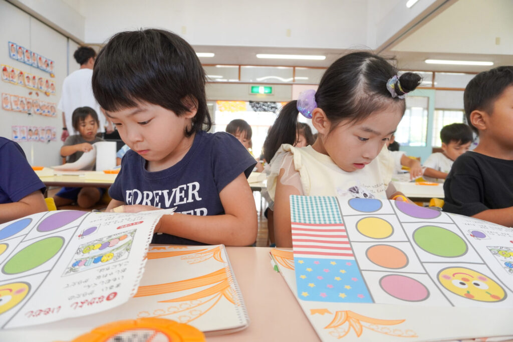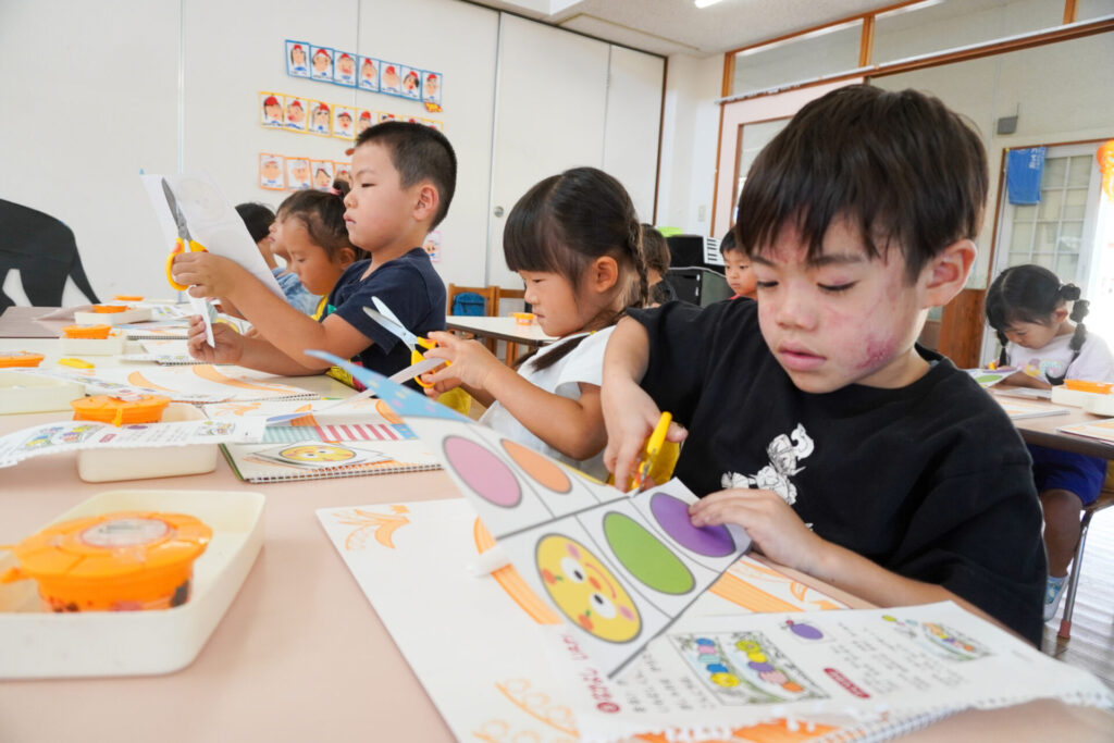 今日の題材は「なかよしあおむし」です。顔と体の丸を切っていきます。紙を回しながら切ると、上手に滑らかに切ることができます。10個の丸を切り終え、顔と体をつないで貼っていくと、かわいい「あおむし」が完成します。