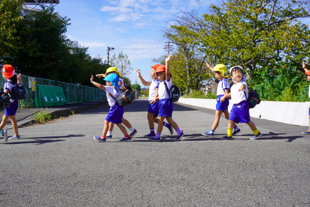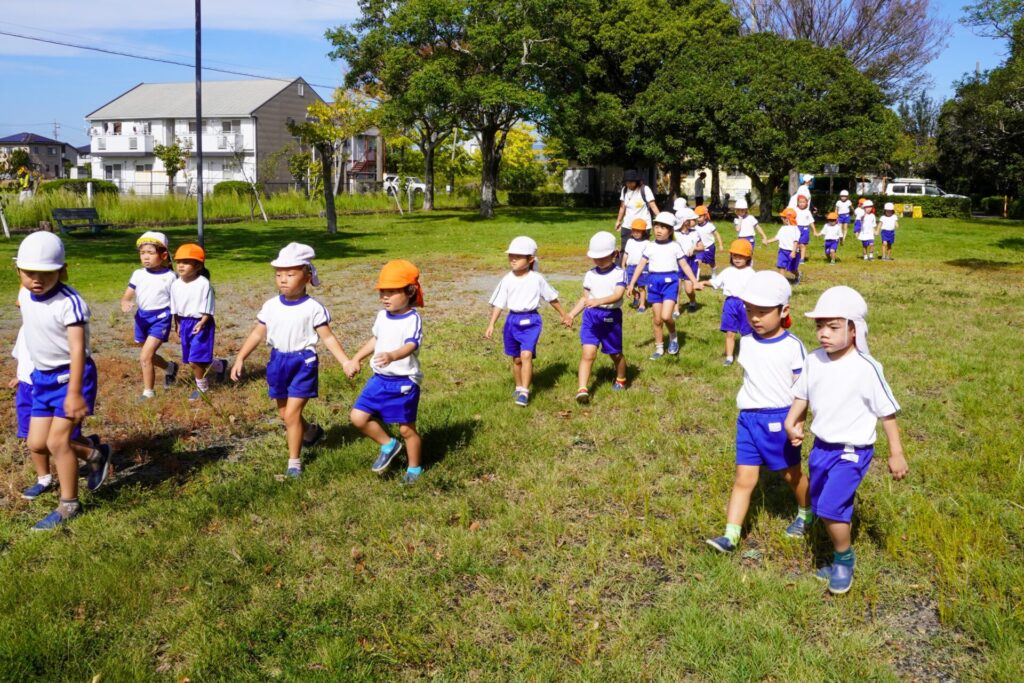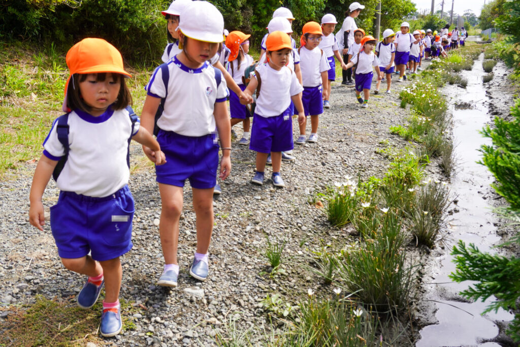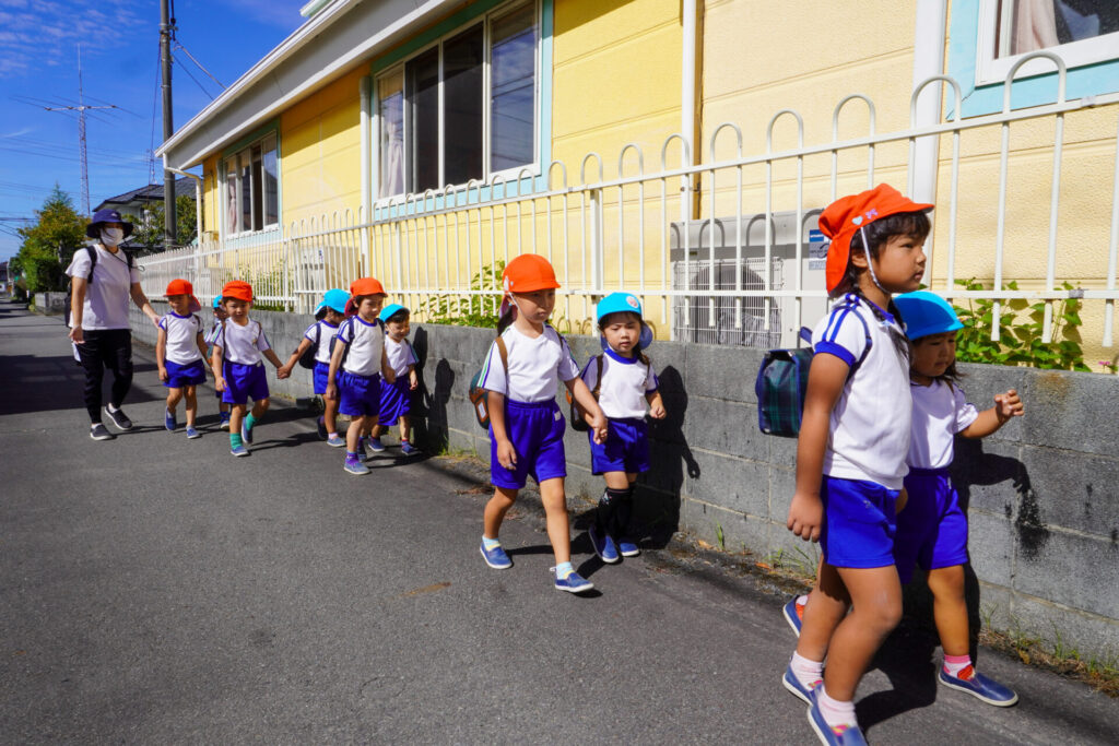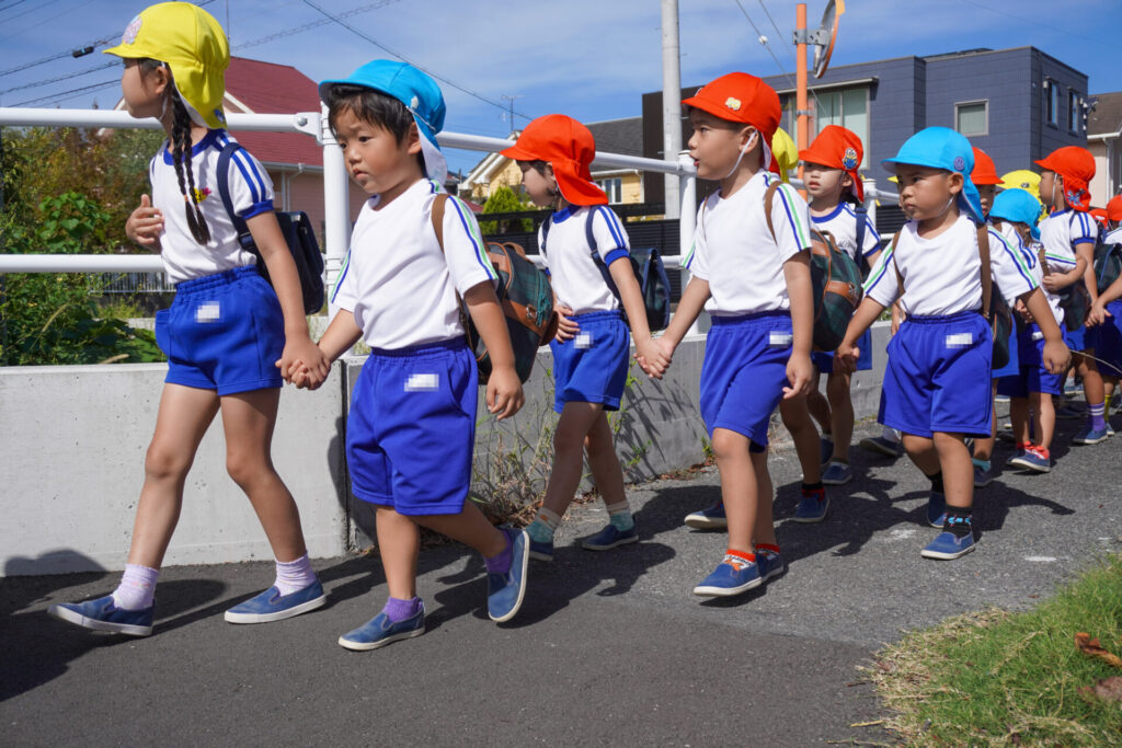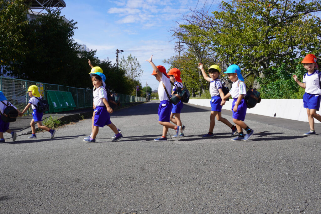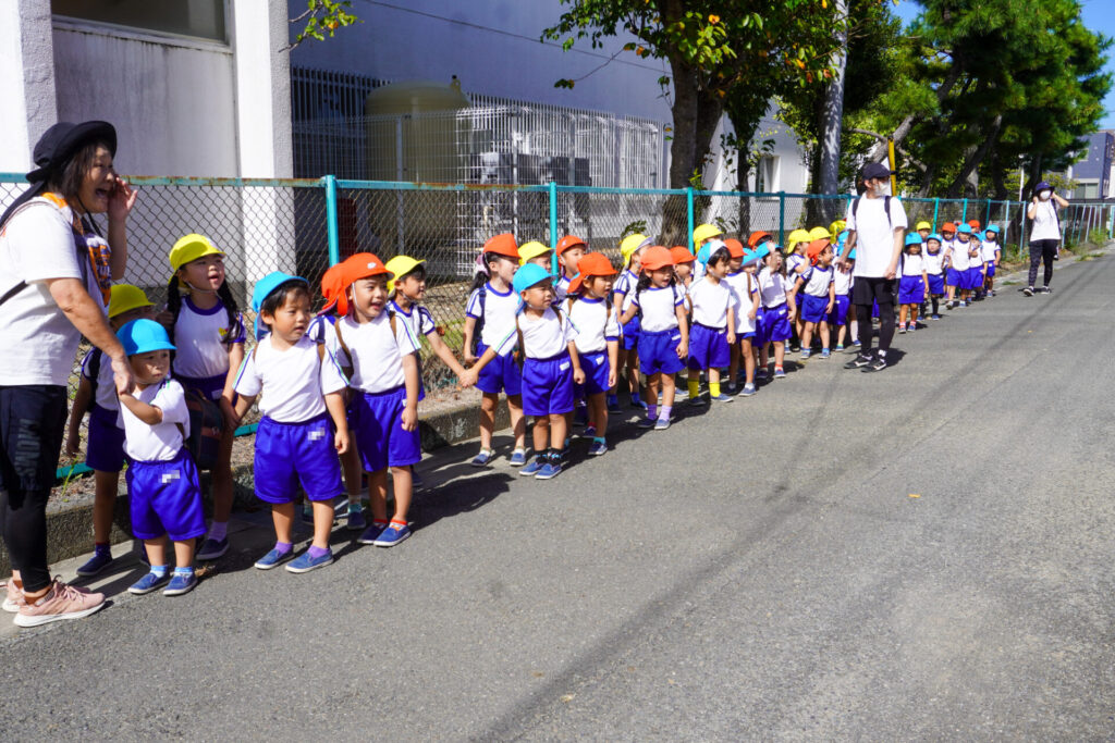 天気もよく、クラス帽子が青空に映えてとてもきれいでした。行きも帰りも、ペア同士で手をつないで歩きました。前の友だちについて並んで歩けるようになり、成長を感じました。