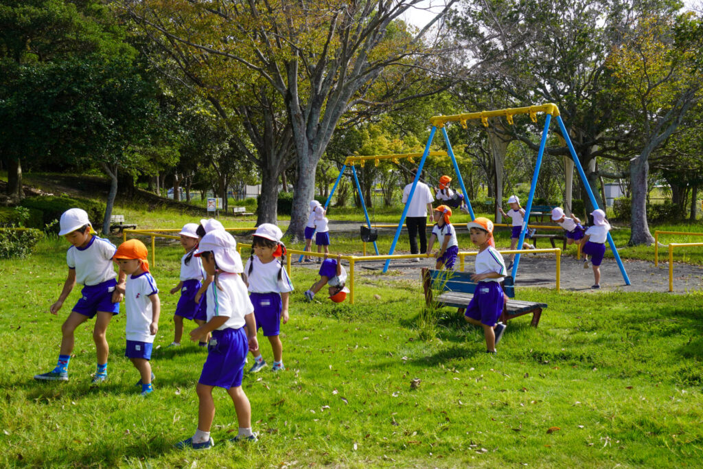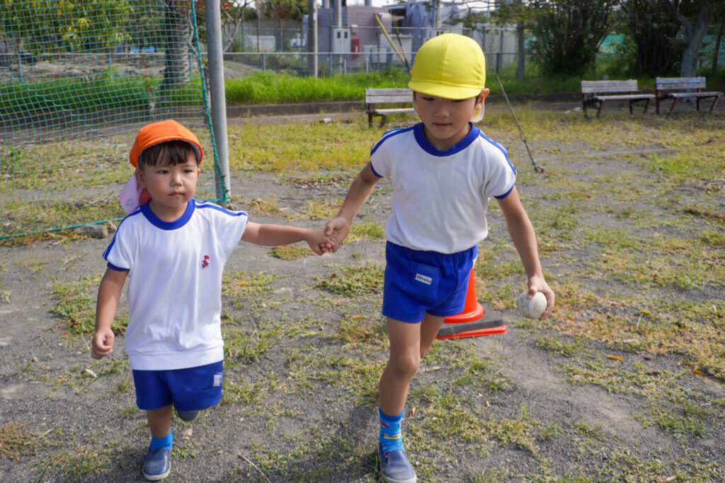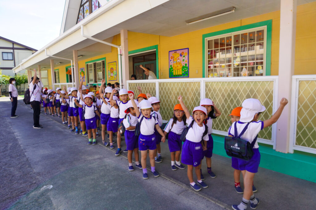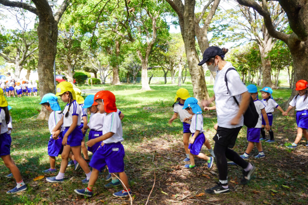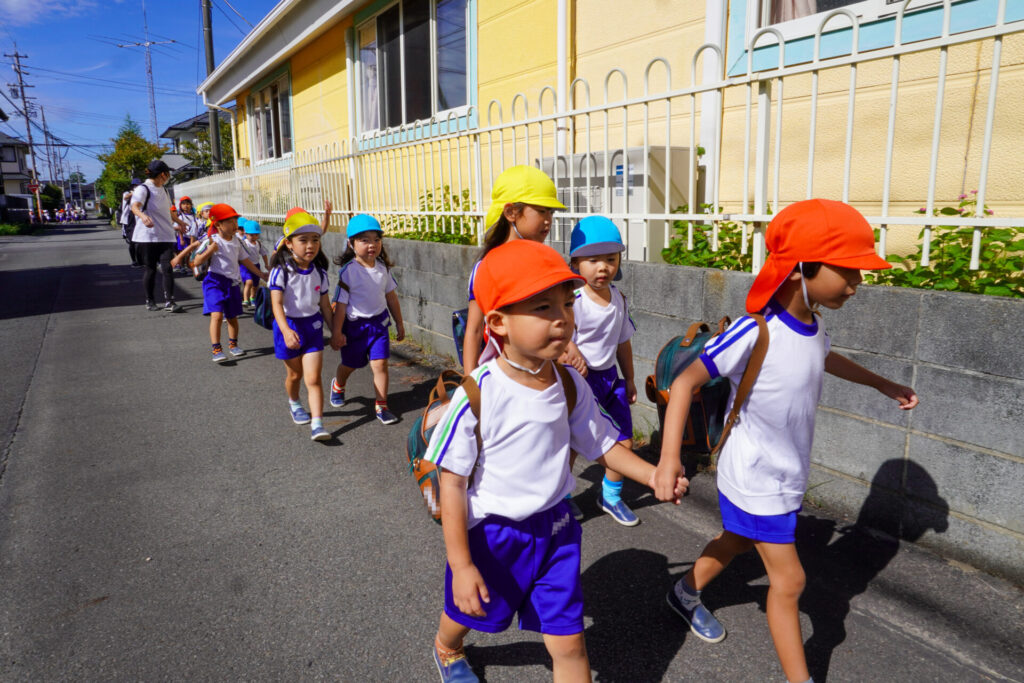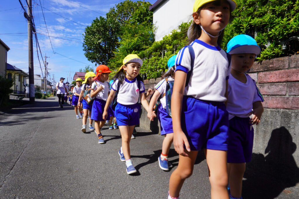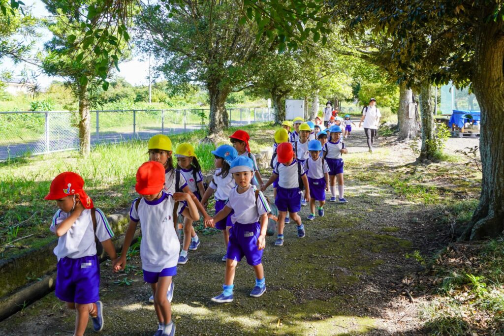 天気もよく、クラス帽子が青空に映えてとてもきれいでした。行きも帰りも、ペア同士で手をつないで歩きました。前の友だちについて並んで歩けるようになり、成長を感じました。