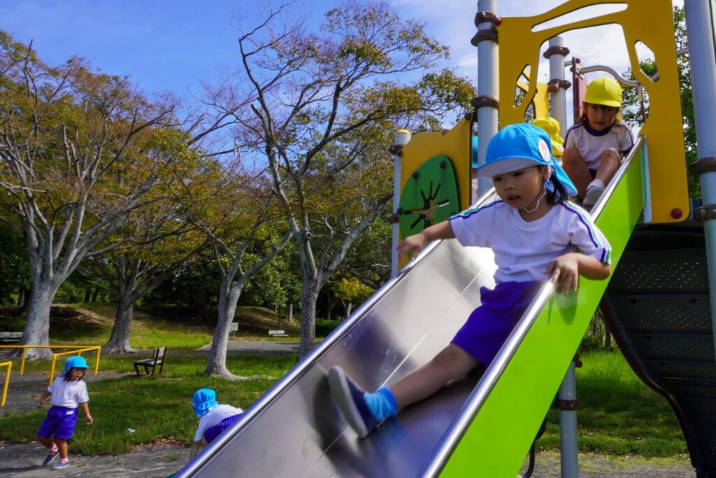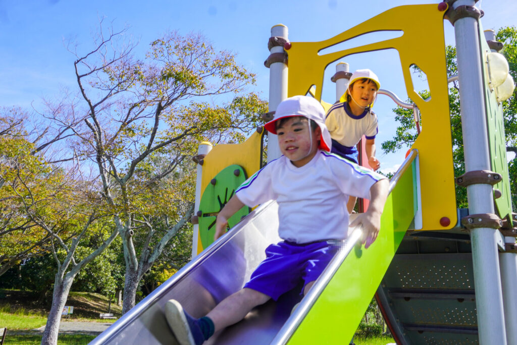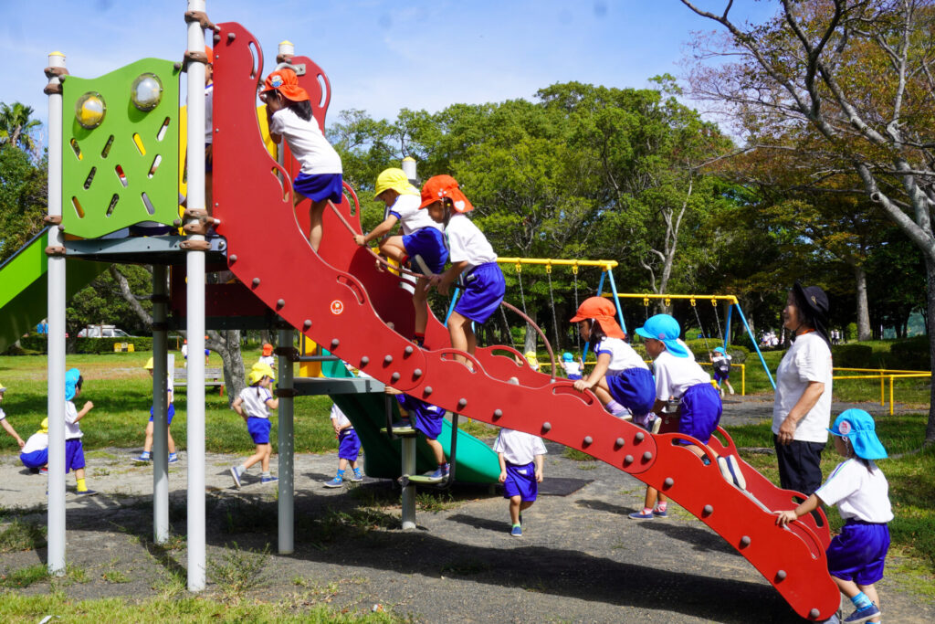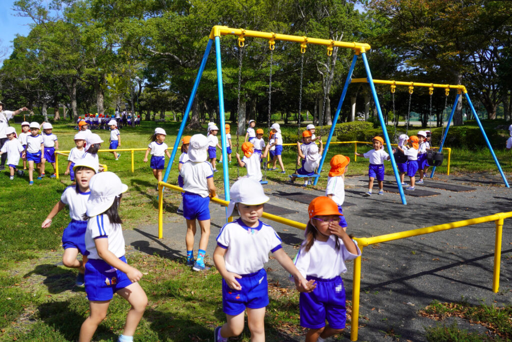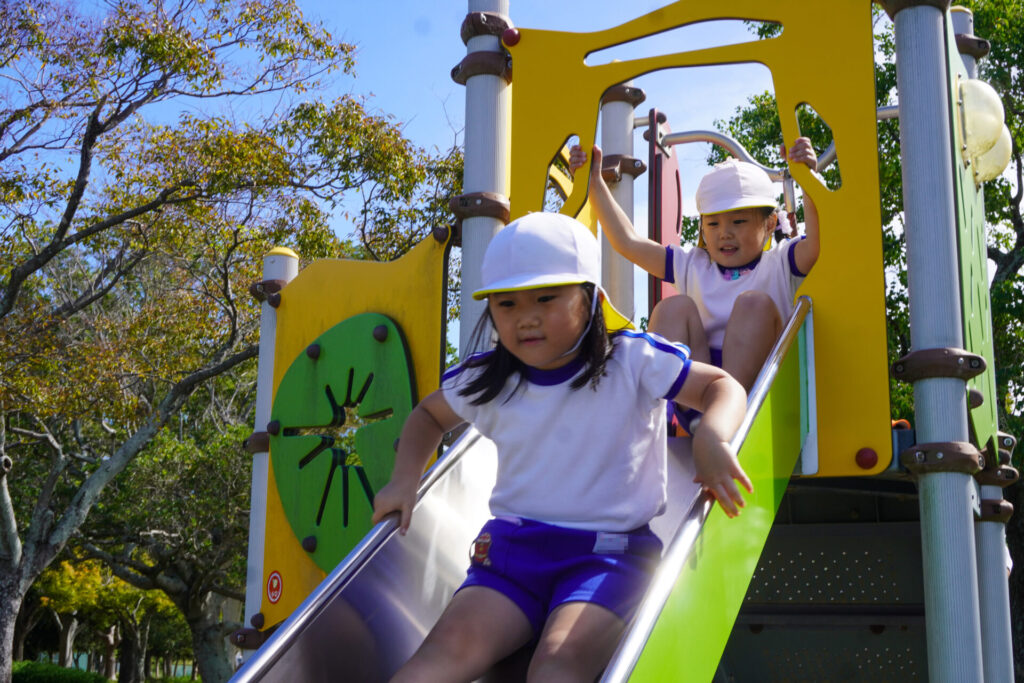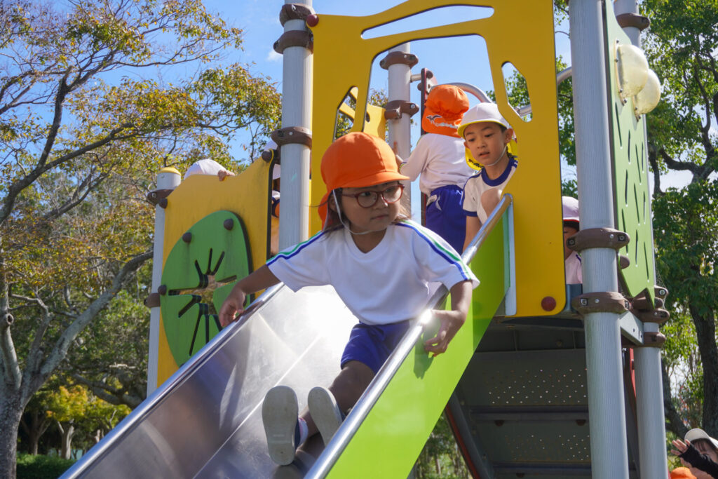 ブランコ、滑り台の遊具で遊んだり、虫探しをしたり、広場ではかけっこ競走や鬼ごっこをしたり、めいっぱい体を動かして遊びました。