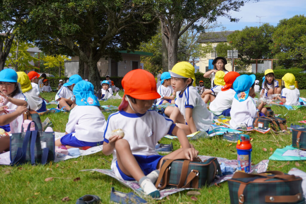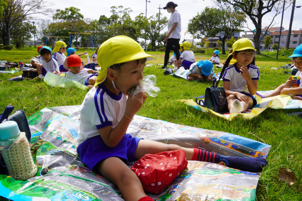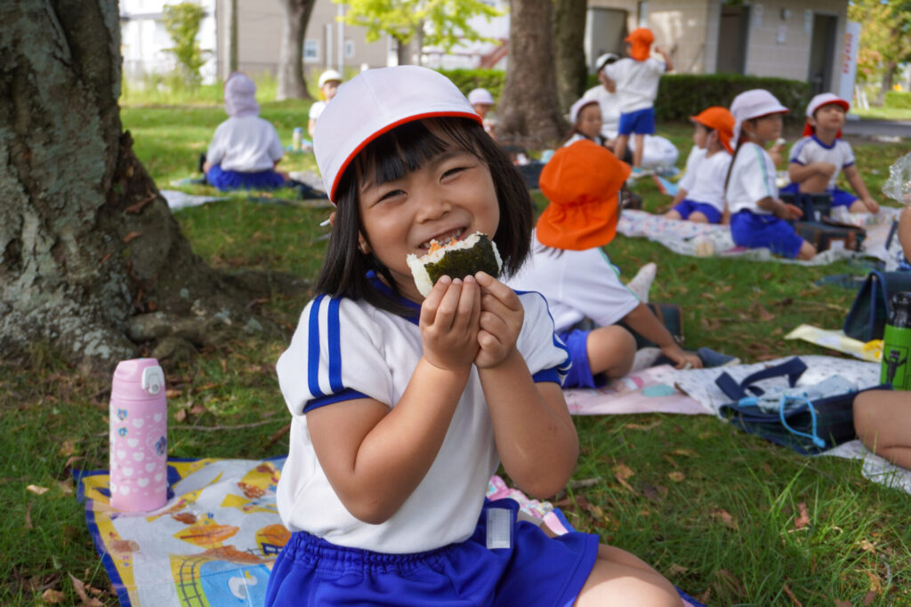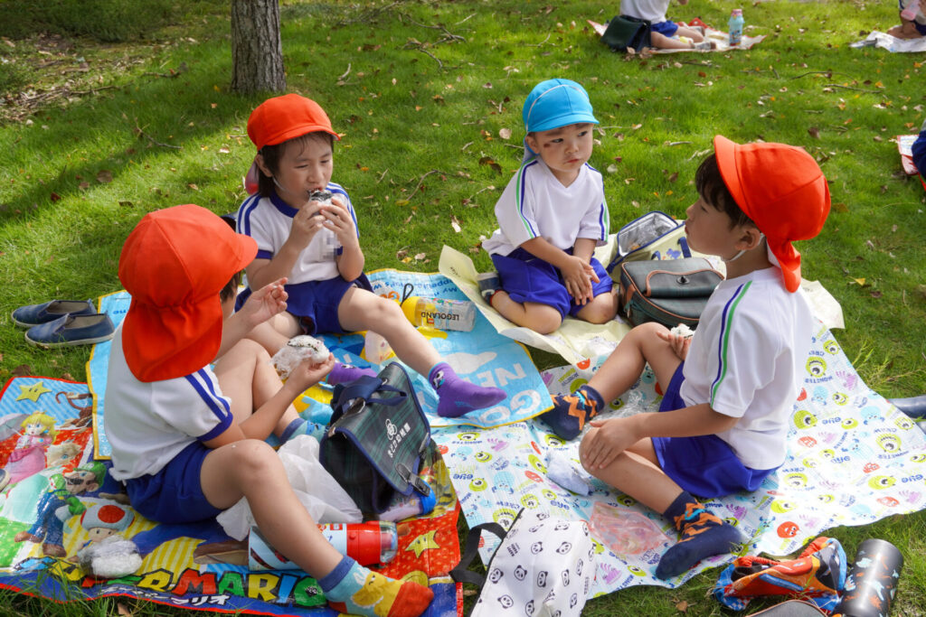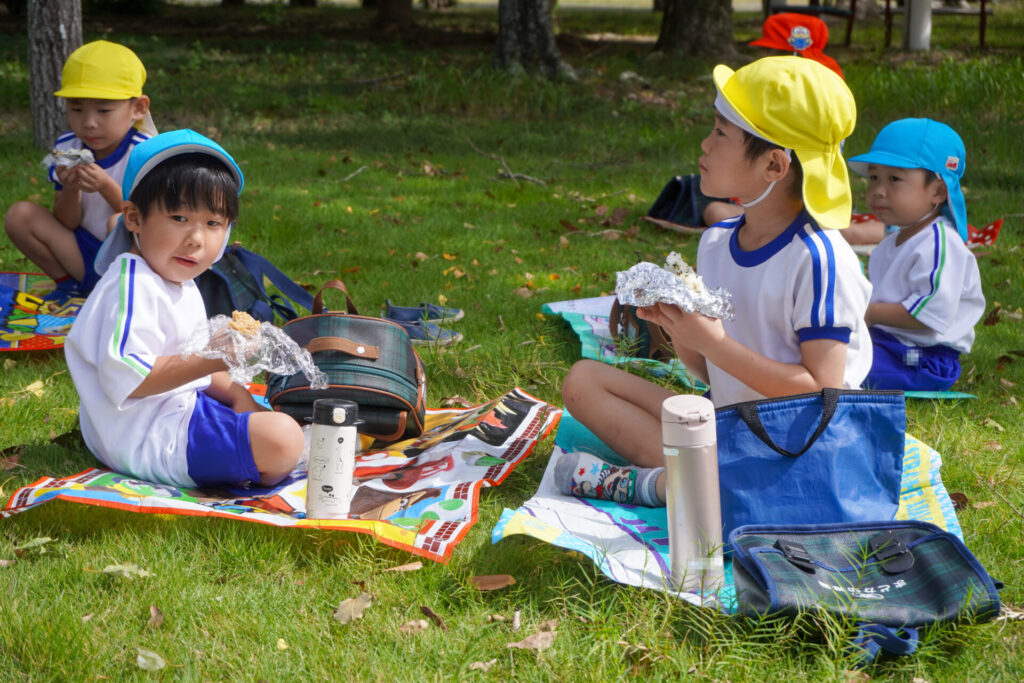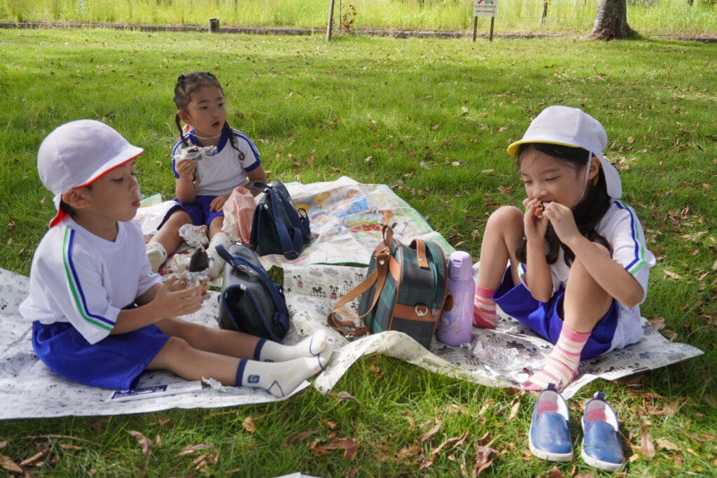 昼食はおうちの方が用意してくれた「おにぎり」を食べました。自分でシートを広げて身支度をして、心地よい風を受けながら「いただきます」をして、食べ始めました。公園で食べる「おにぎり」は格別ですね。