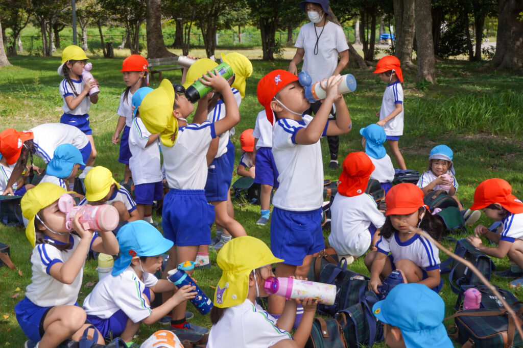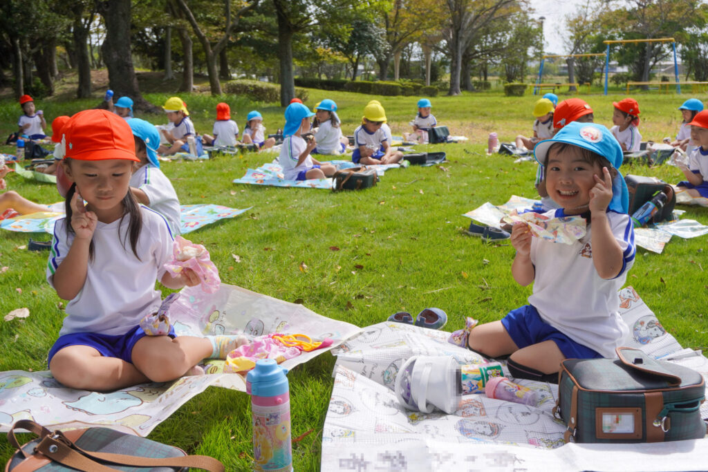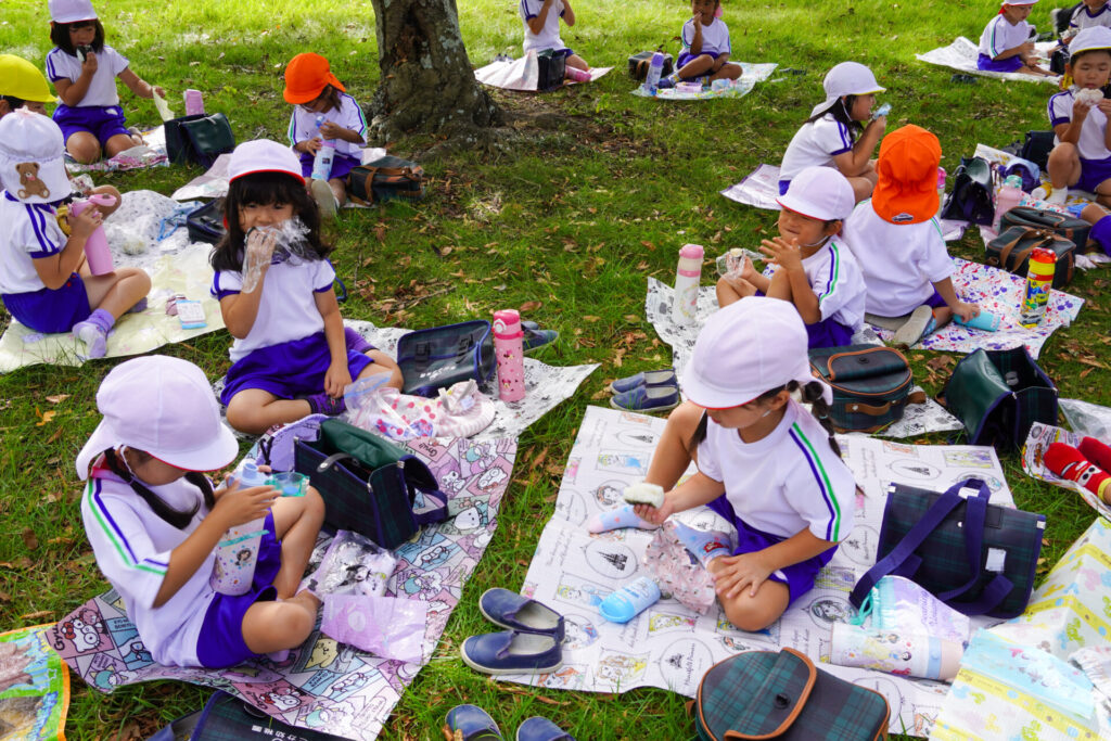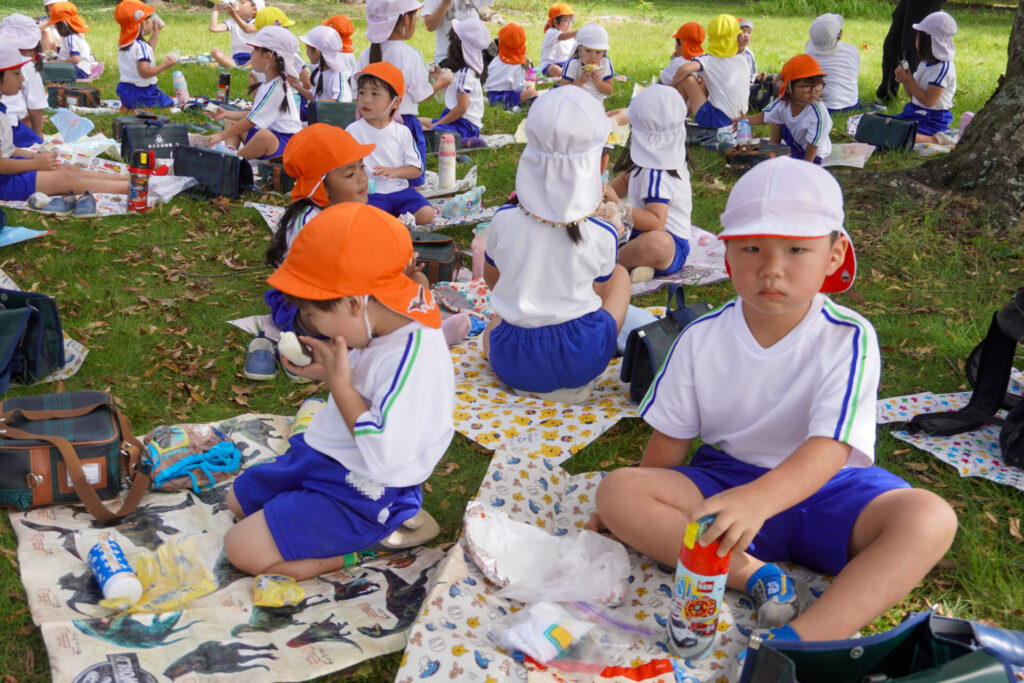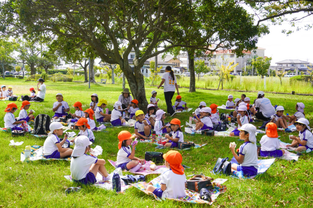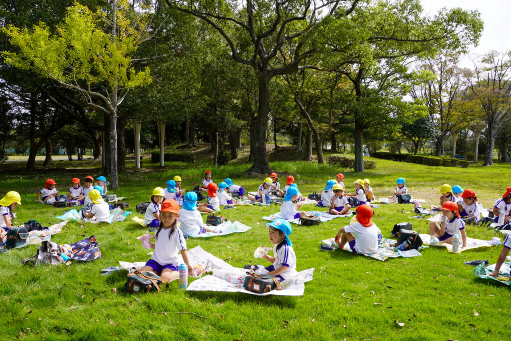 昼食はおうちの方が用意してくれた「おにぎり」を食べました。自分でシートを広げて身支度をして、心地よい風を受けながら「いただきます」をして、食べ始めました。公園で食べる「おにぎり」は格別ですね。