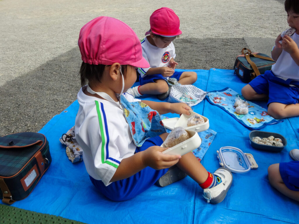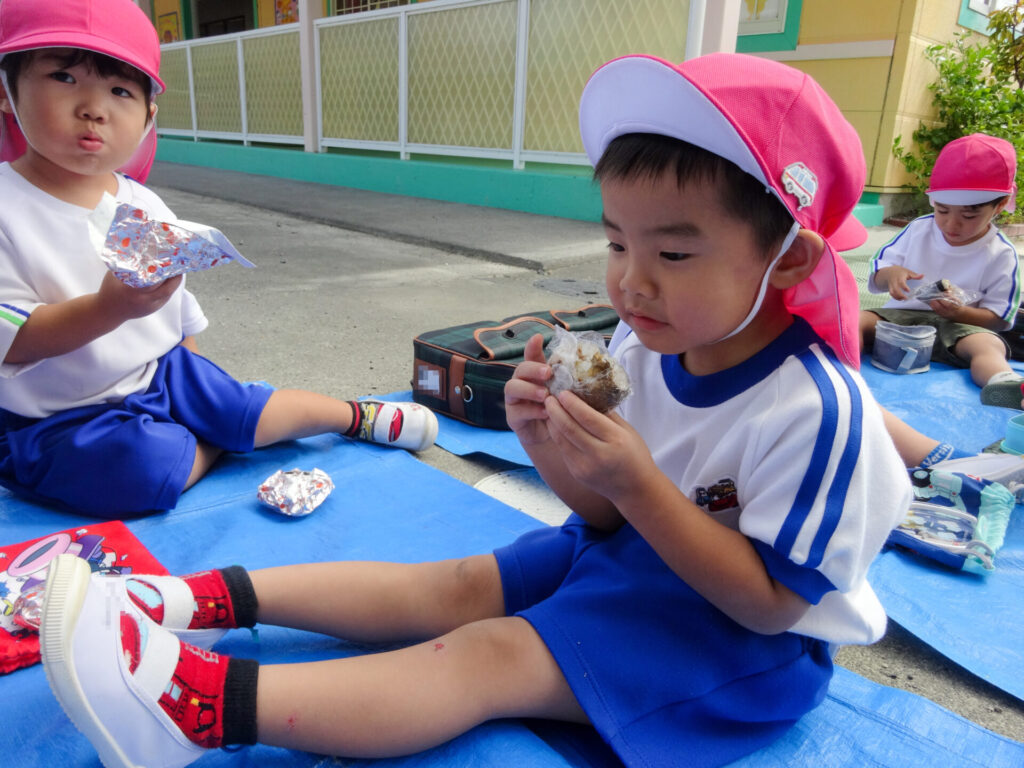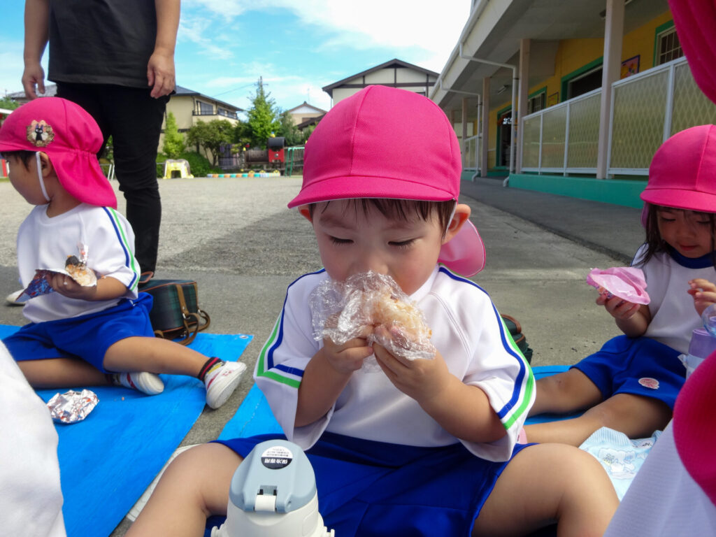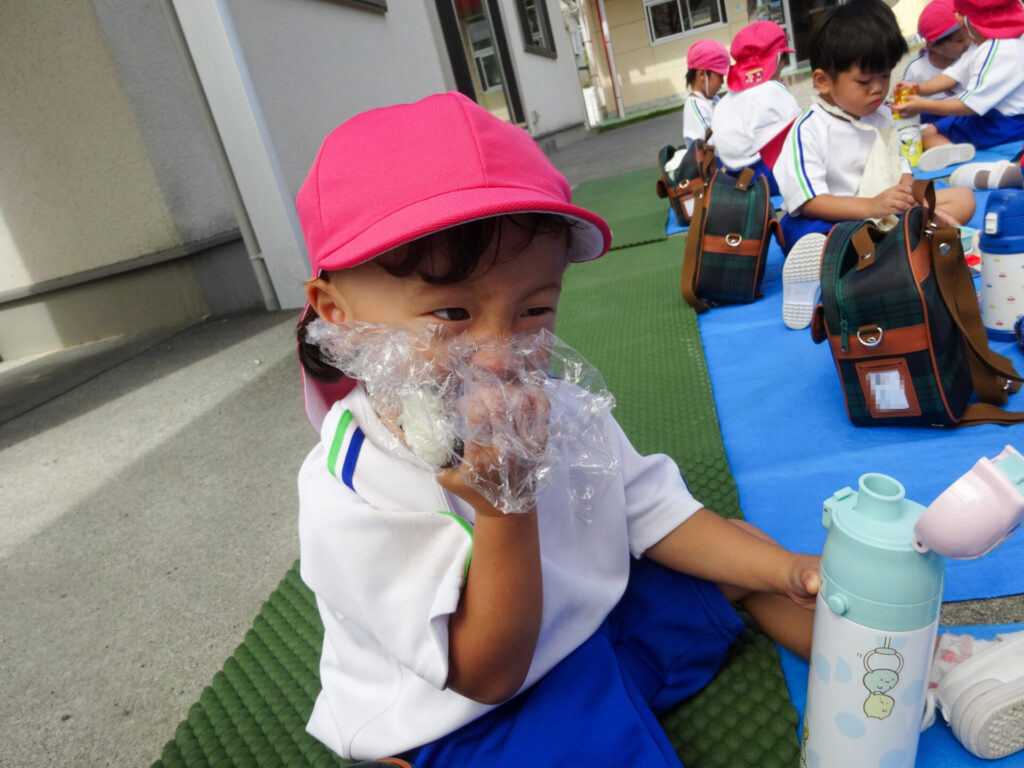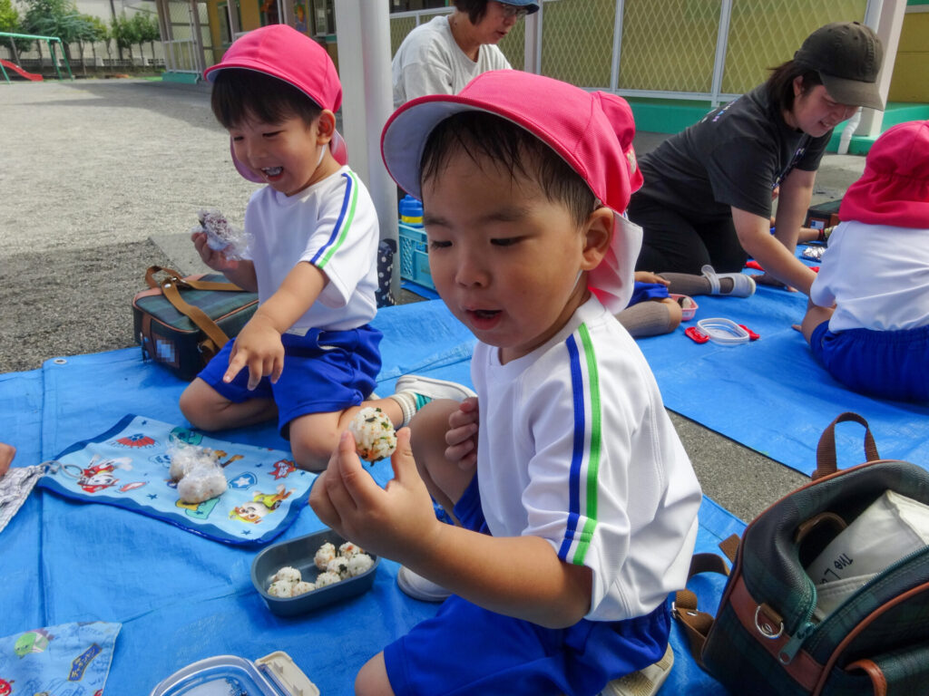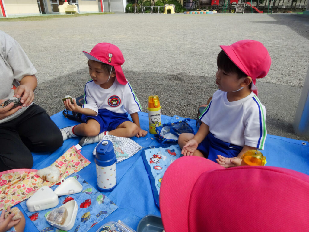 園での様子 ピクニック(満3歳) madokahp 2025年10月8日 幼稚園で一番小さい満3歳バンビ組はお兄さん・お姉さんがハイクに出かけるのを見送った後は、戸外でめいっぱい遊びました。遊具も安全に遊べるようになり、「ブランコ乗りたい!」「山へ行きたい!」と、やりたいことがはっきりとしてきました。 今日はバンビ組さんも「おにぎり」を用意していただきましたので、園庭でシートを広げて食べました。外で食べる「おにぎり」はおいしいですね。 10月入園の新入園児も少しずつ園生活に慣れてきました。明日も幼稚園で元気いっぱい遊びましょうね。