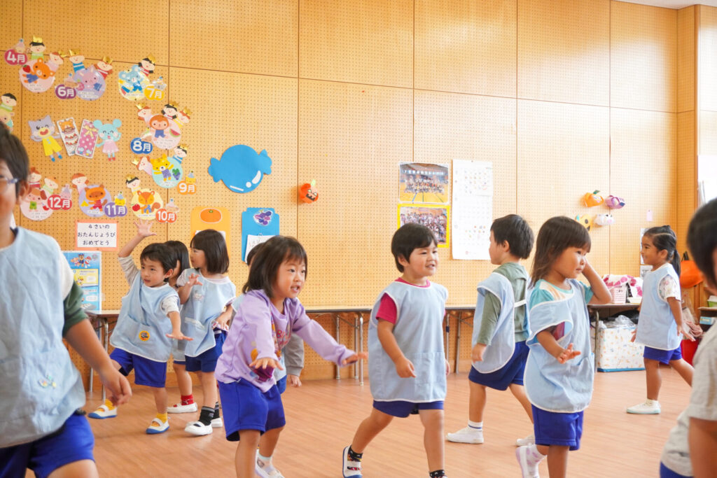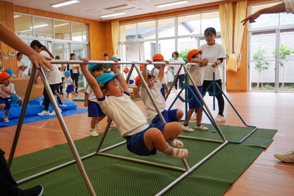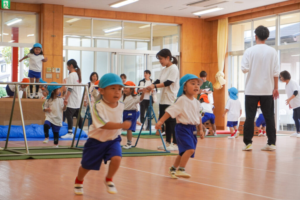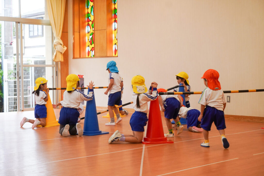 園歌を歌い、準備体操をした後は、サーキット遊びです。跳び箱、ボールパンチング、バーくぐり、大ジャンプ…回転よくサーキットができるようになり、挑戦しようとする気持ちも出てきました。