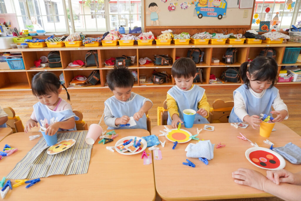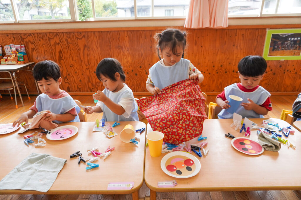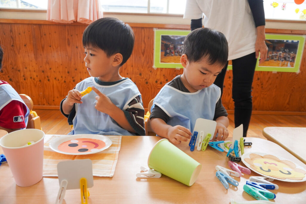 毎日元気いっぱいの幼稚園で一番小さい満3歳バンビ組さんです。少しずつ長い時間、椅子に座って活動できるようになりました。今日は「洗たくばさみ」で遊びました。つまんで開いて挟むと動物の耳になったり、ひげになったり…いろいろな「動物」に変身できましたね。