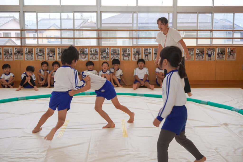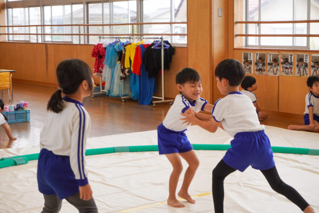 保育室に大きな土俵!つき組保育室に「ハッキヨイ!のこった!」と元気な声が響きました。押して、交わして、土俵際…負けて悔しい気持ちをぐっと押さえて、最後はきちんと「礼」をする姿に年長らしさを感じました。