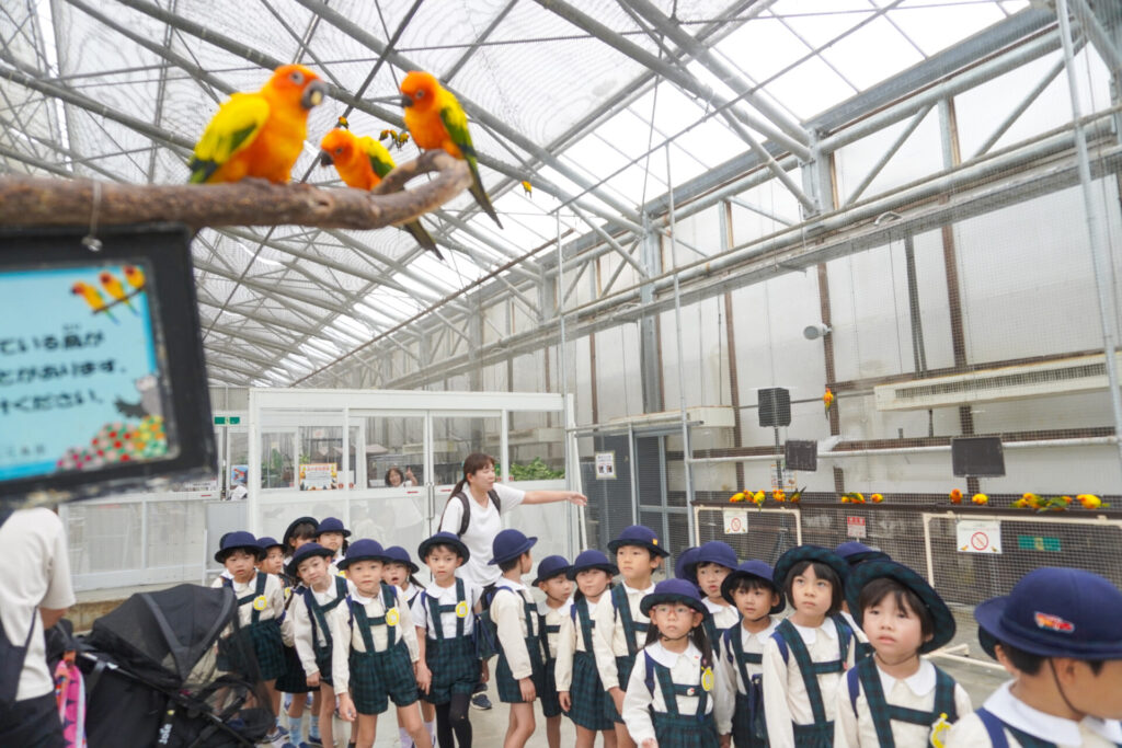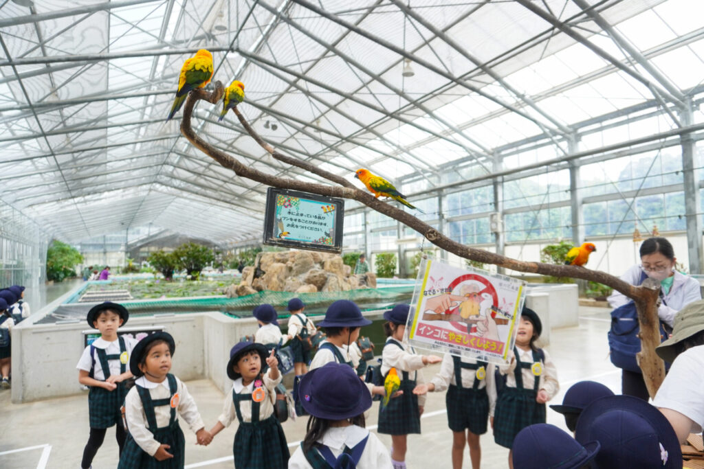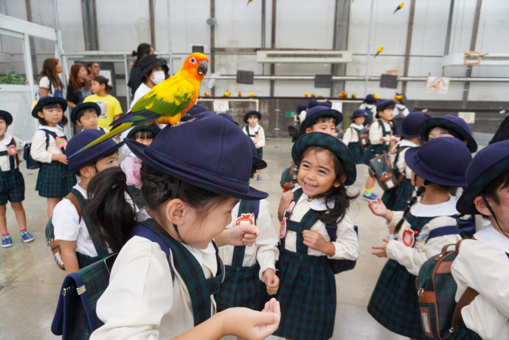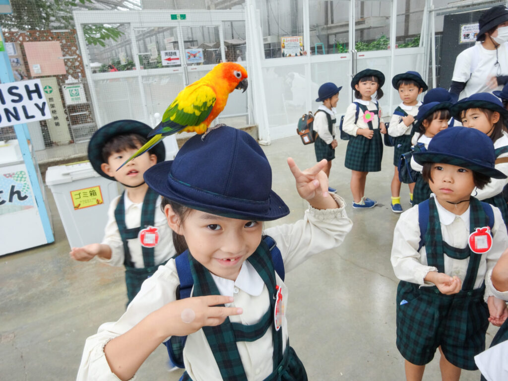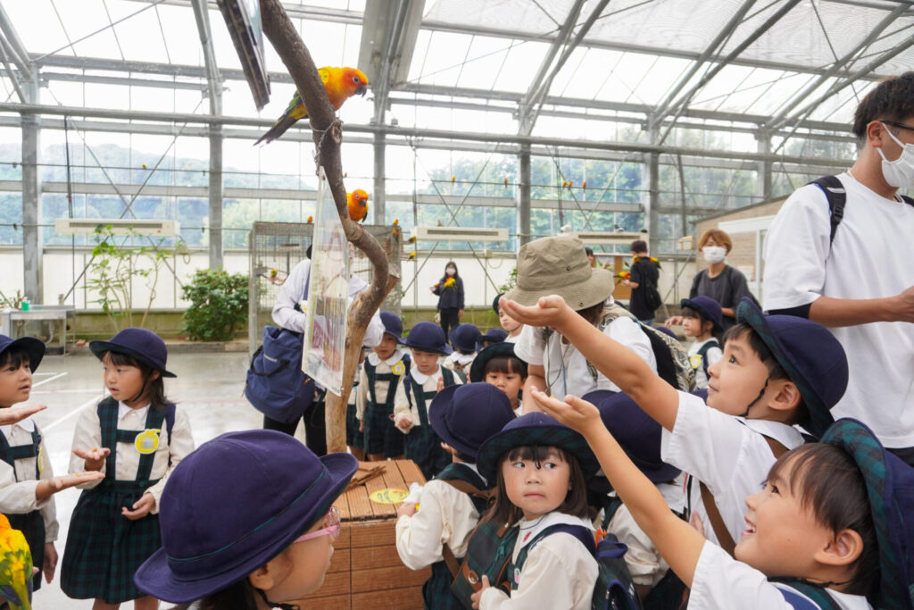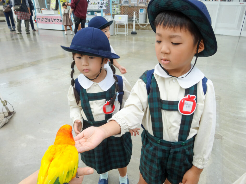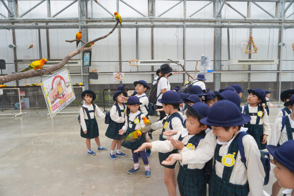 年長つき組、年中さくら組、年少ゆり組とばら組が姉妹園のすみれ台幼稚園全園児と大型バスに乗って、秋のバス遠足へ出かけました。行き先は「掛川花鳥園」です。