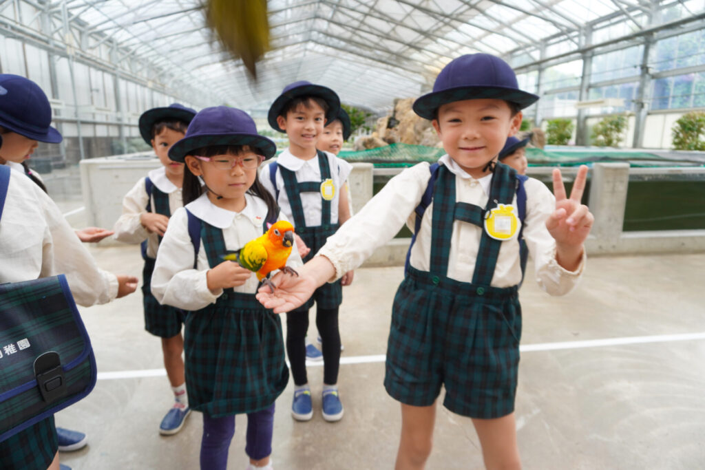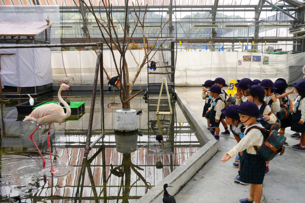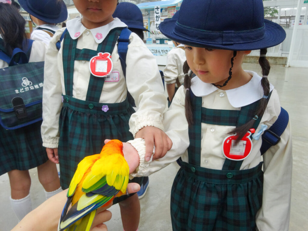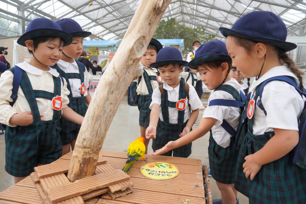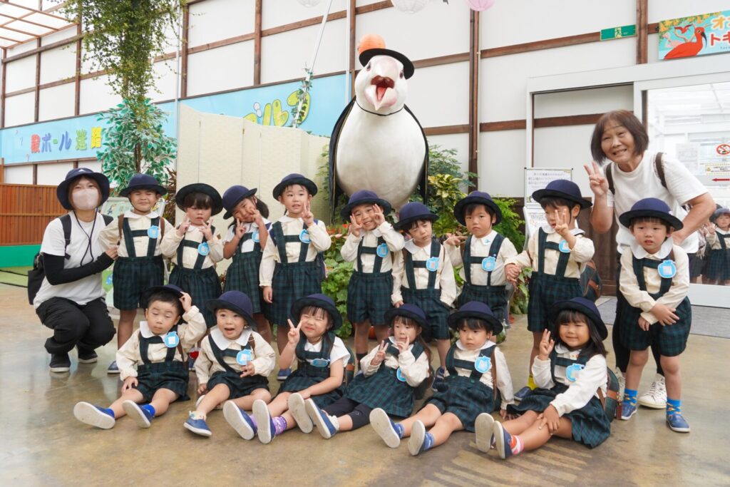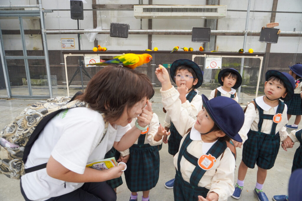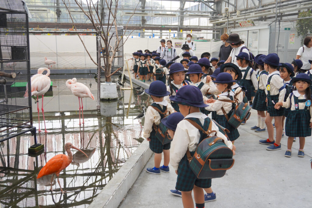 年長つき組、年中さくら組、年少ゆり組とばら組が姉妹園のすみれ台幼稚園全園児と大型バスに乗って、秋のバス遠足へ出かけました。行き先は「掛川花鳥園」です。