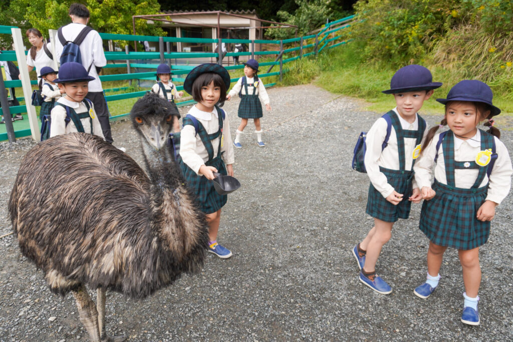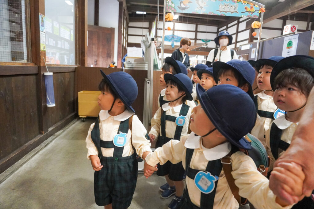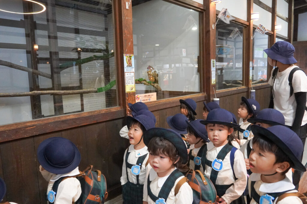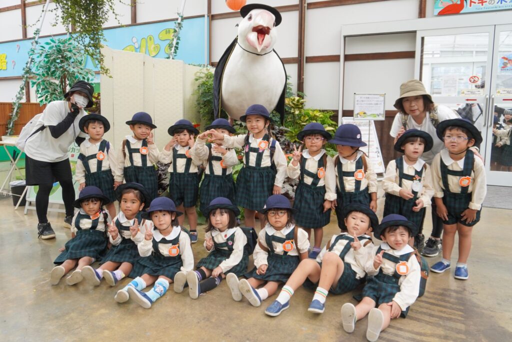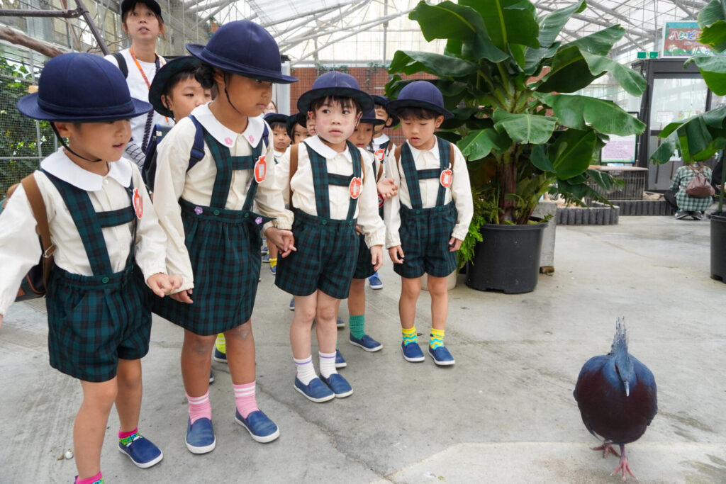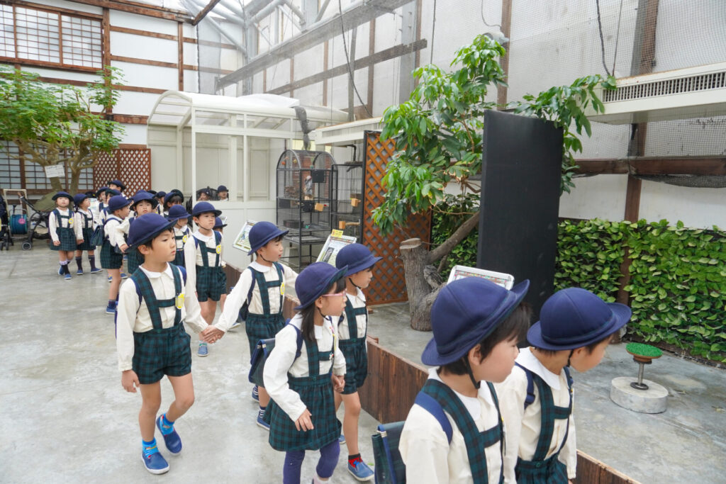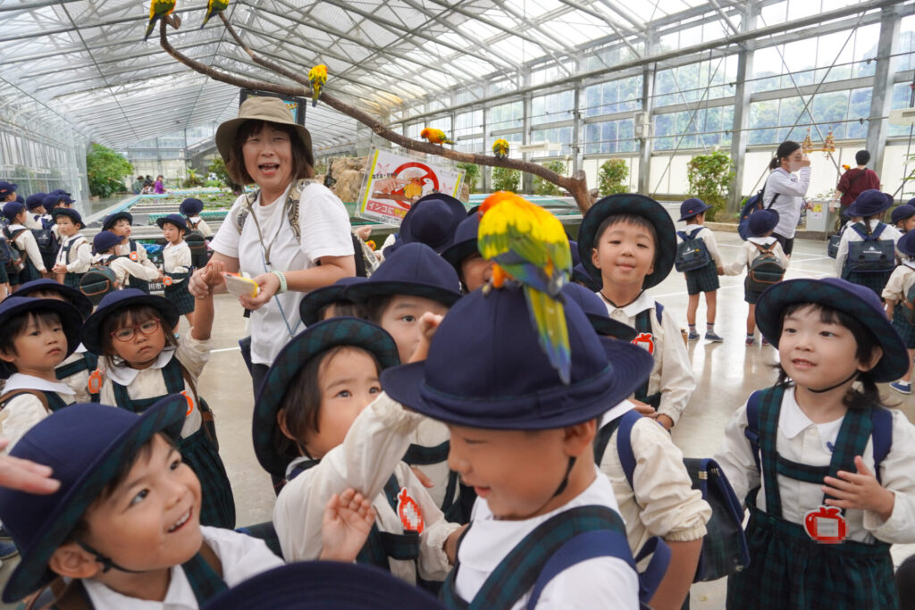 年長つき組、年中さくら組、年少ゆり組とばら組が姉妹園のすみれ台幼稚園全園児と大型バスに乗って、秋のバス遠足へ出かけました。行き先は「掛川花鳥園」です。