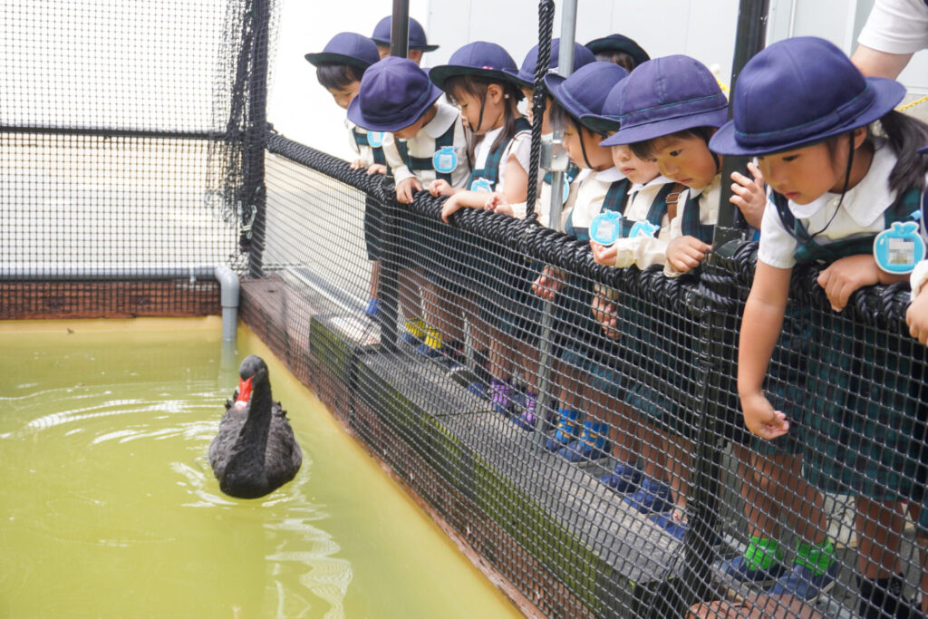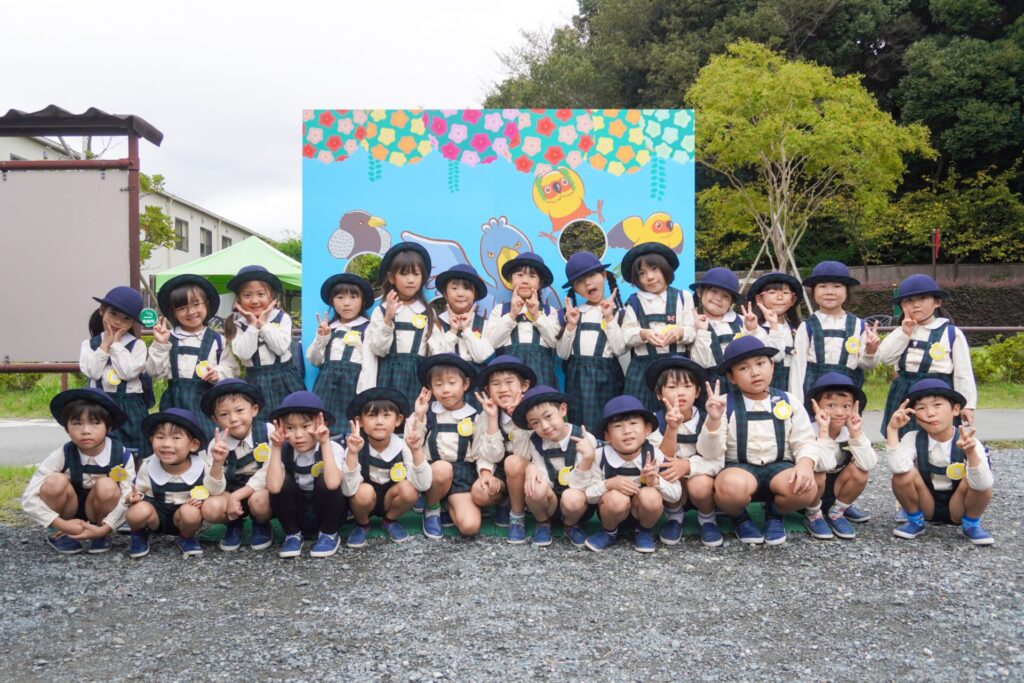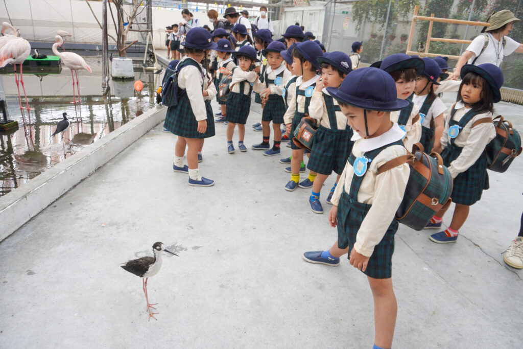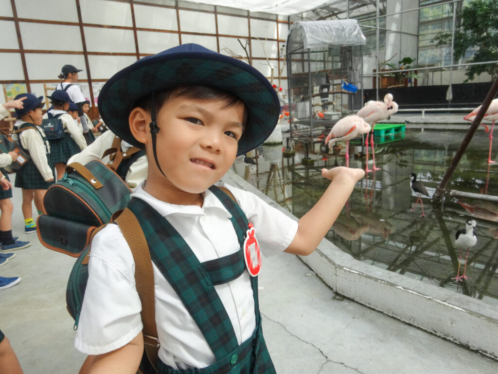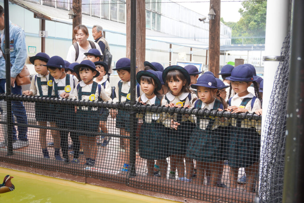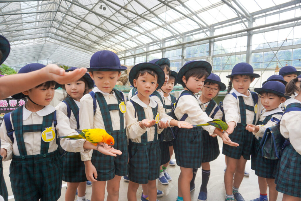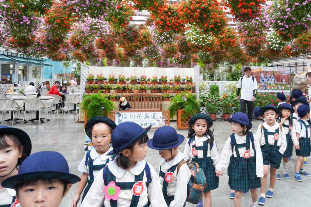 年長つき組、年中さくら組、年少ゆり組とばら組が姉妹園のすみれ台幼稚園全園児と大型バスに乗って、秋のバス遠足へ出かけました。行き先は「掛川花鳥園」です。