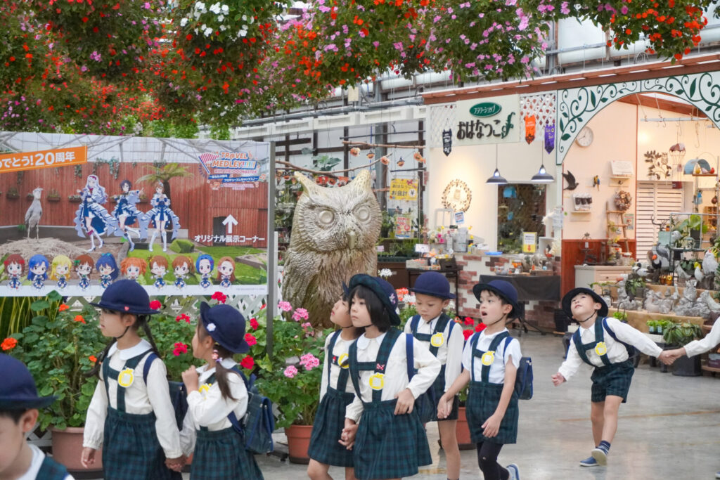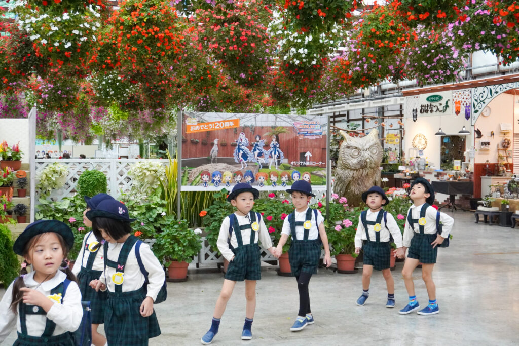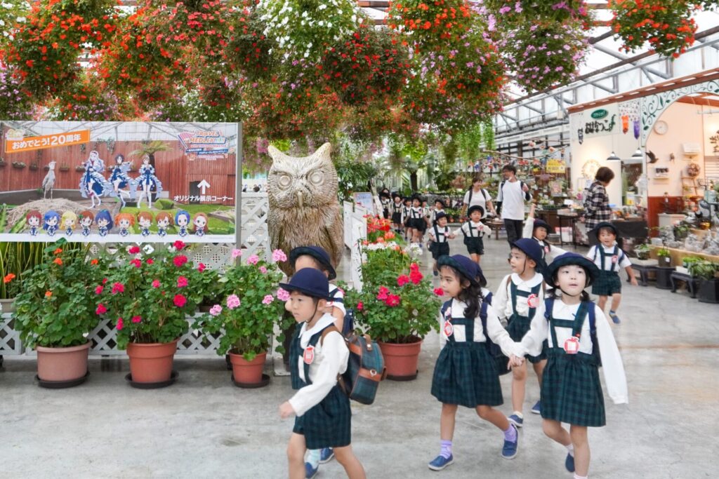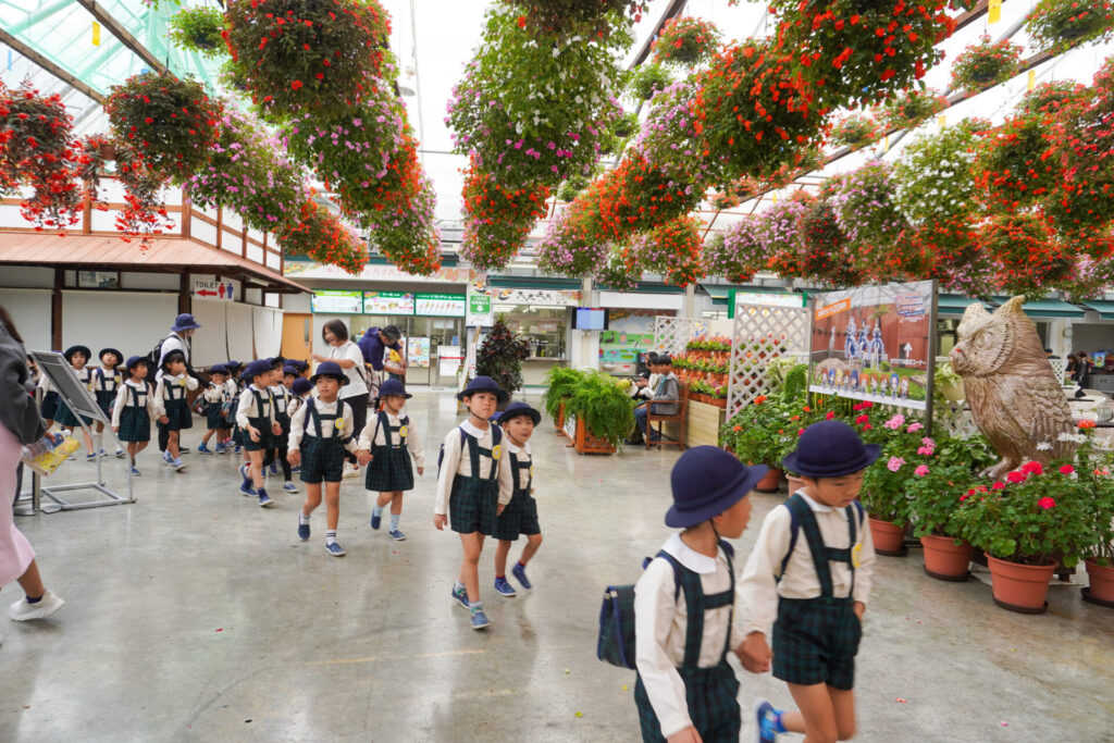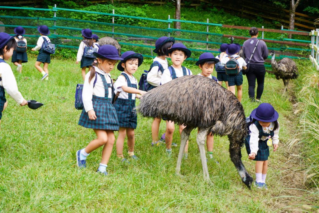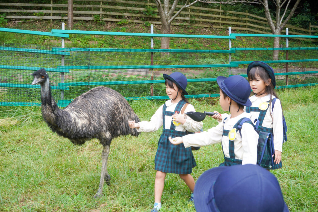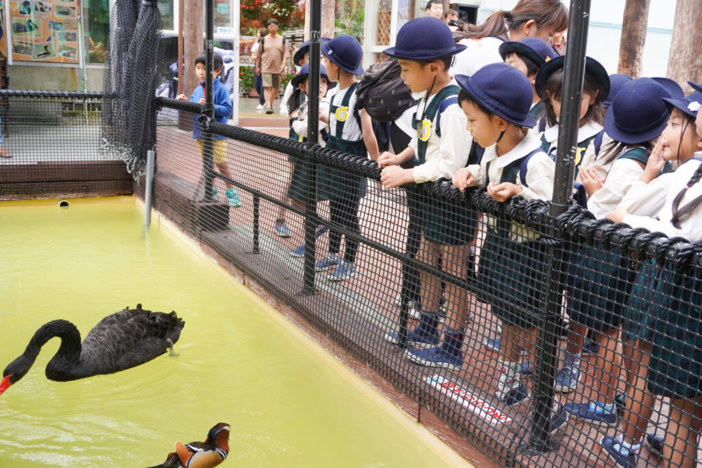 年長つき組、年中さくら組、年少ゆり組とばら組が姉妹園のすみれ台幼稚園全園児と大型バスに乗って、秋のバス遠足へ出かけました。行き先は「掛川花鳥園」です。