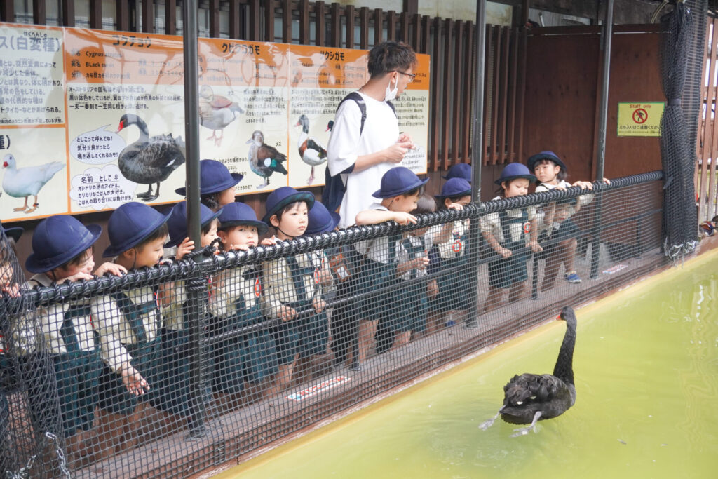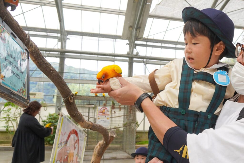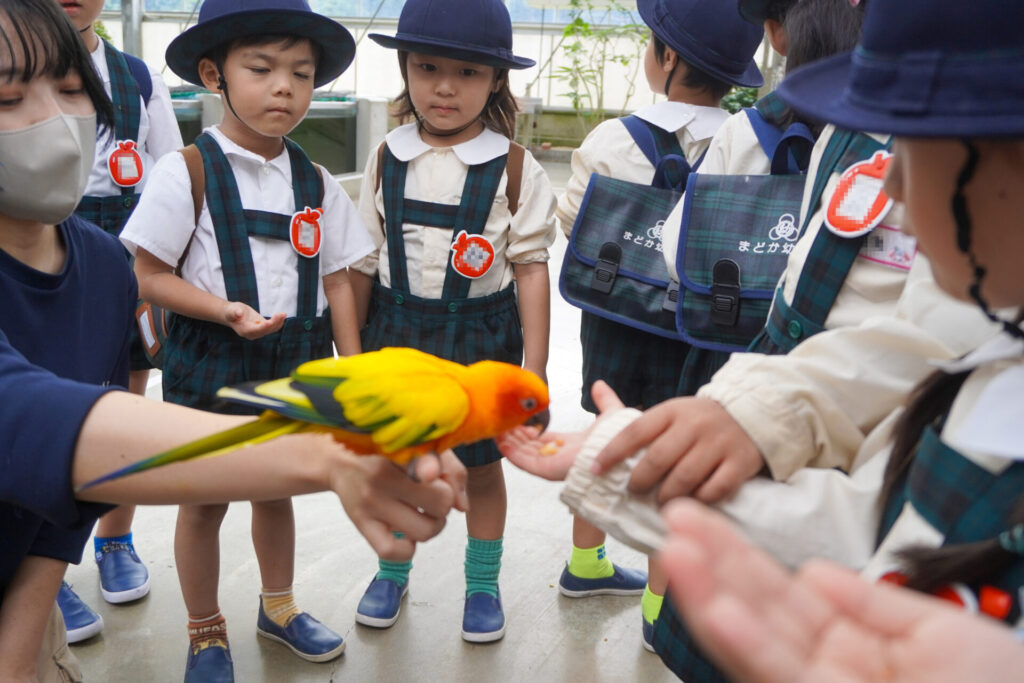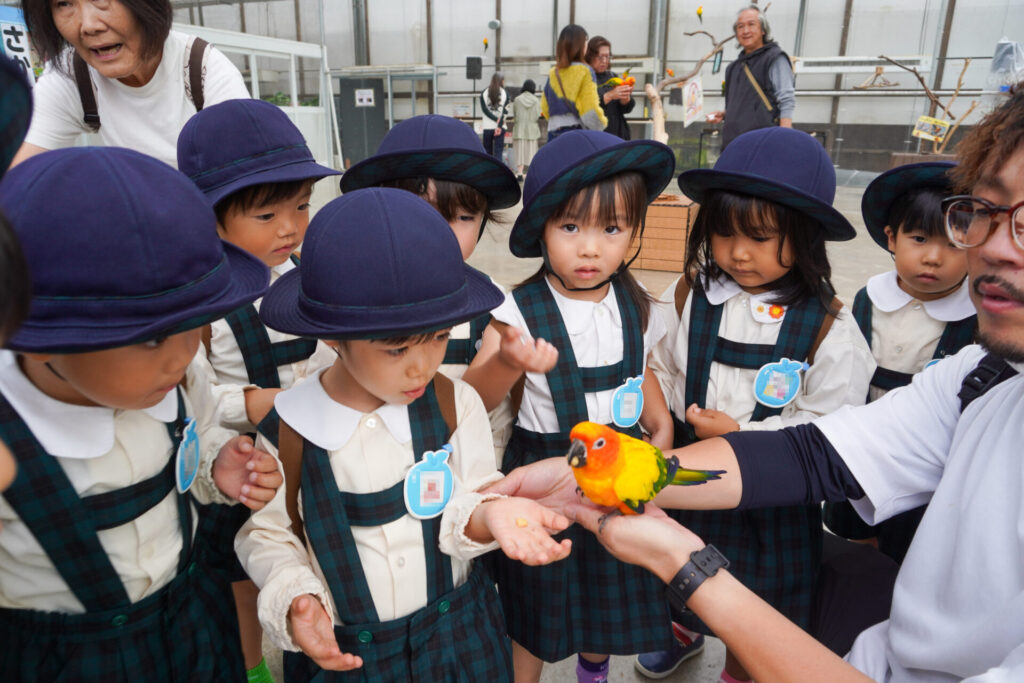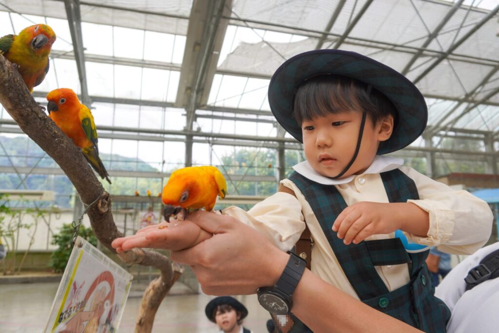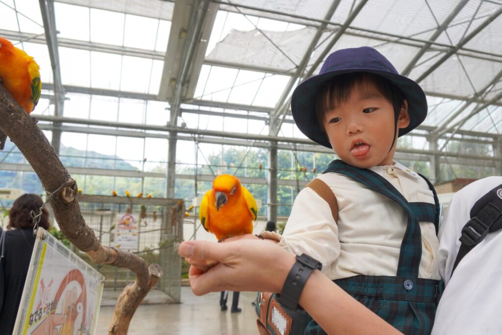 ドキドキしながらインコが飛び交う「インコのスイレンプール」へ…ここでは餌やり体験をしました。職員がインコに餌をあげるのを見るとすぐに「やりたい!」と言って、早速「おいでー!」と手に餌を乗せてあげている子もいました。帽子や手にインコが止まってくれた子もましたね。