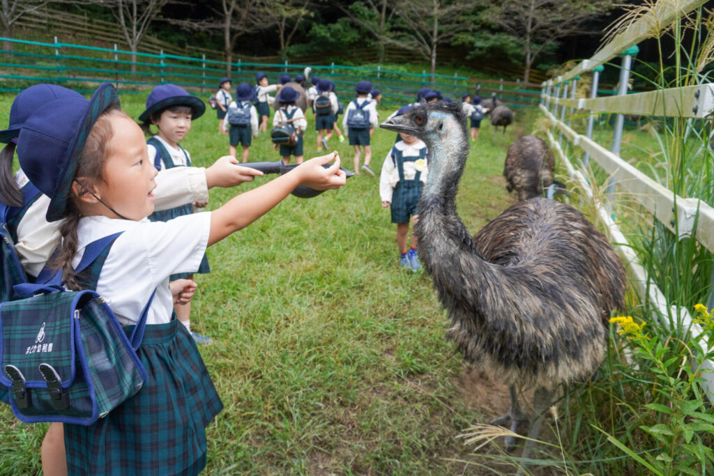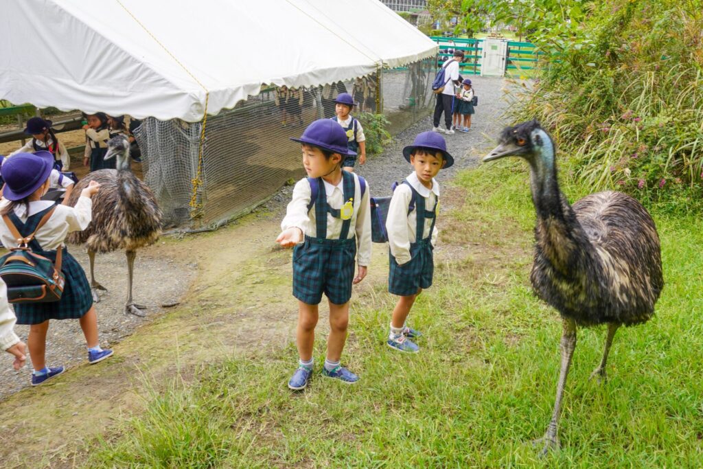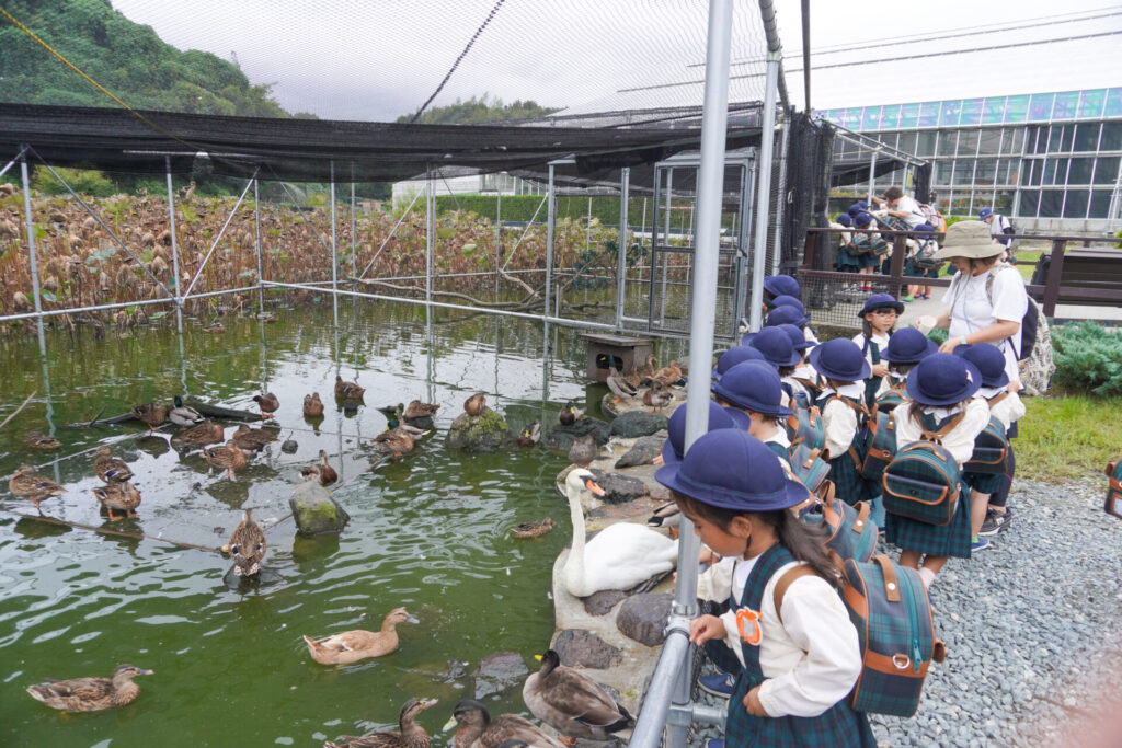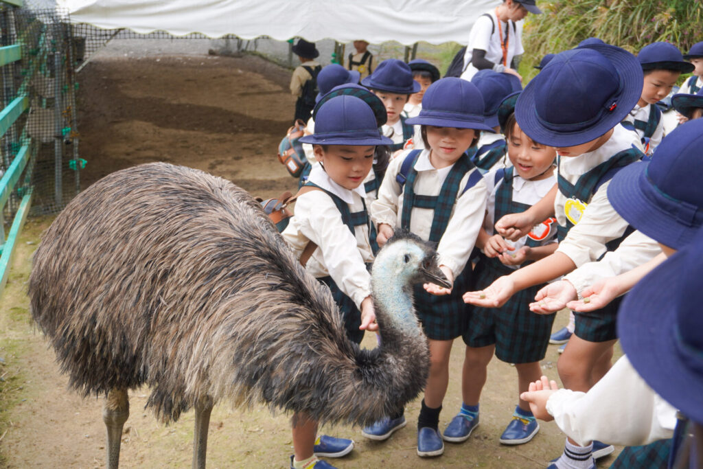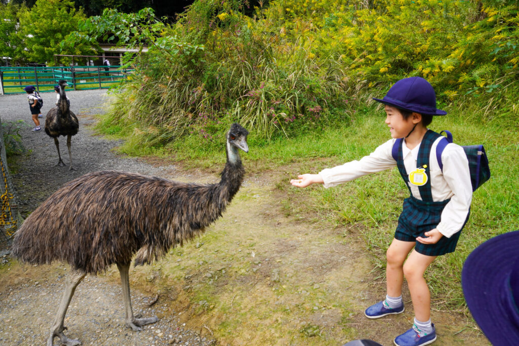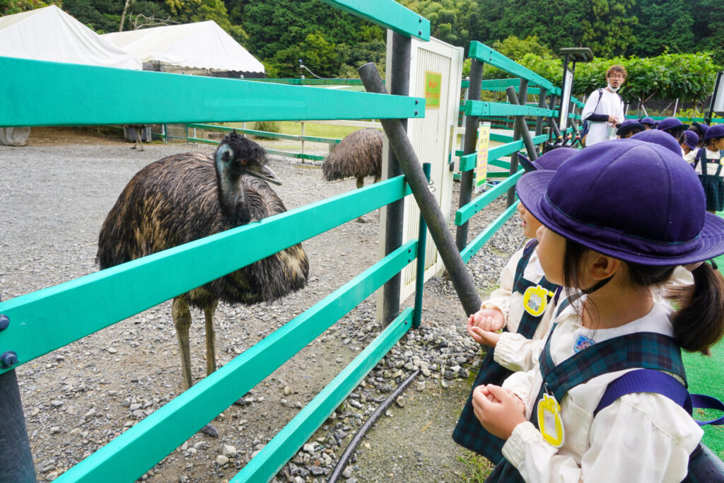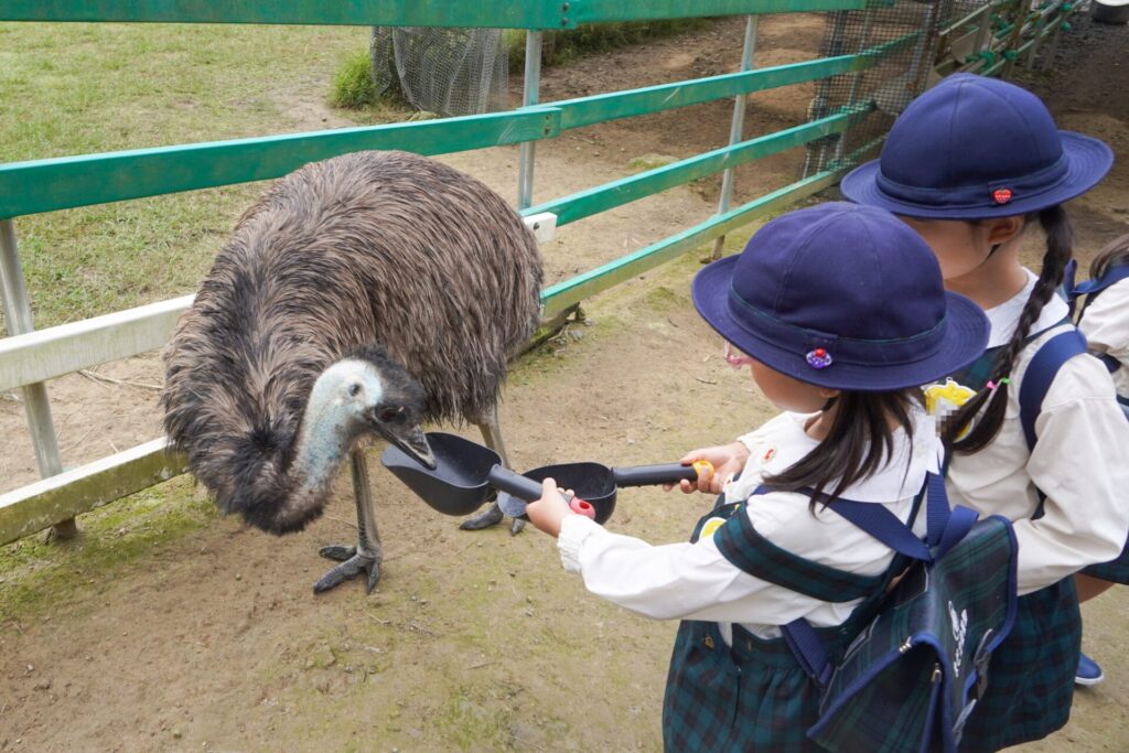 そして戸外で出て「エミュー牧場」へ!実際にエミューがいる牧場内へ入り、間近で見たり、餌をあげたり、大きなエミューにも怖がることなくふれあうことができてびっくりしました。「ペリカン」が大きなくちばしを広げて餌の魚を食べるのを見たり、「カモ」の大群に餌をあげたり、最後の最後まで様々な体験ができました。今日は数えきれない程の鳥の仲間に会えました。