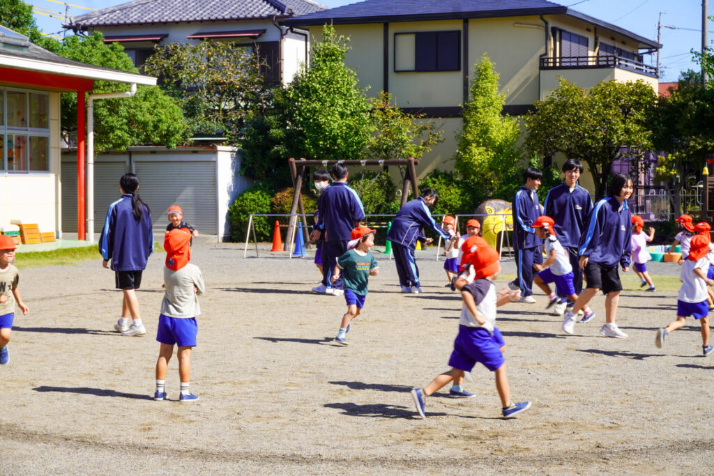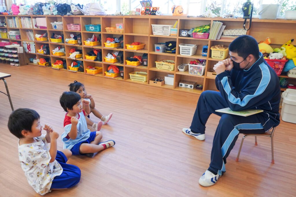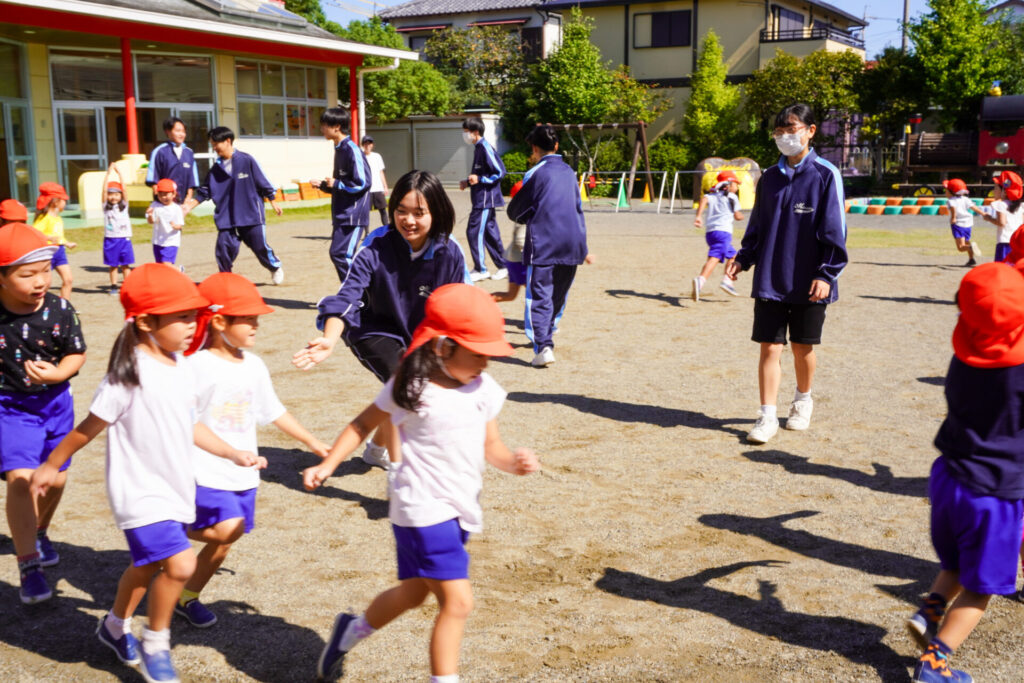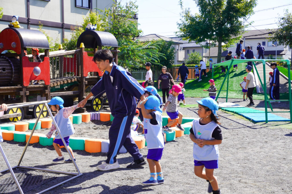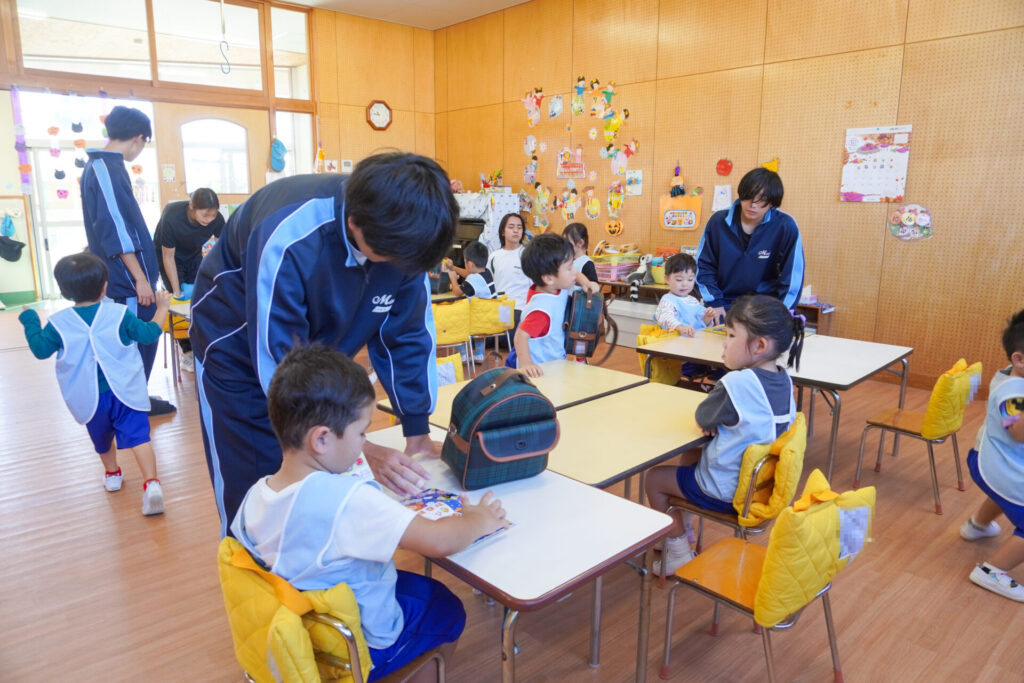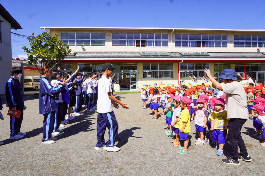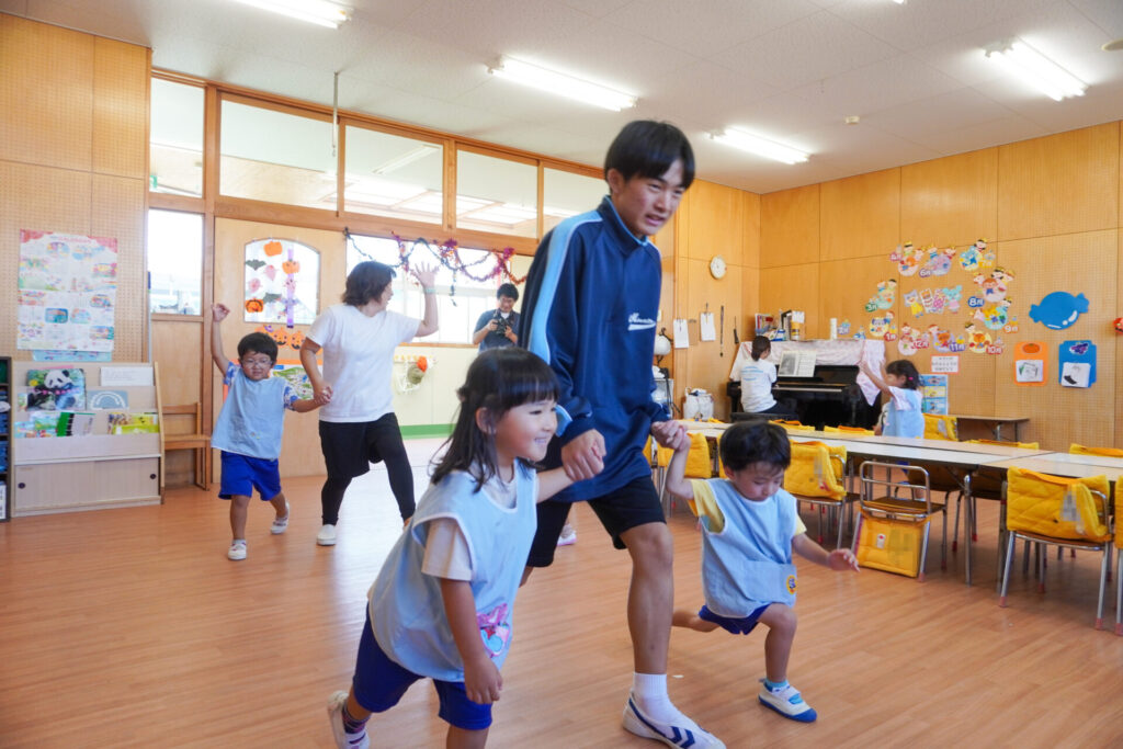 各クラスに分かれて、歌を聞いてもらったり、一緒にダンスを踊ったり、鬼ごっこや相撲対決…お兄さん・お姉さんと一緒にめいっぱい遊んでいただきました。