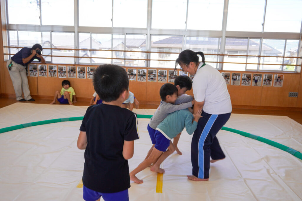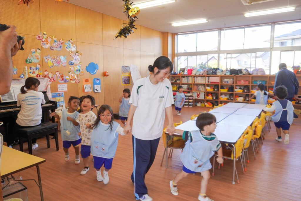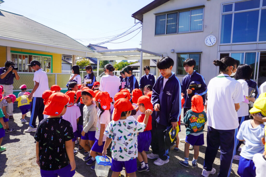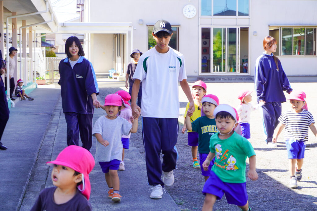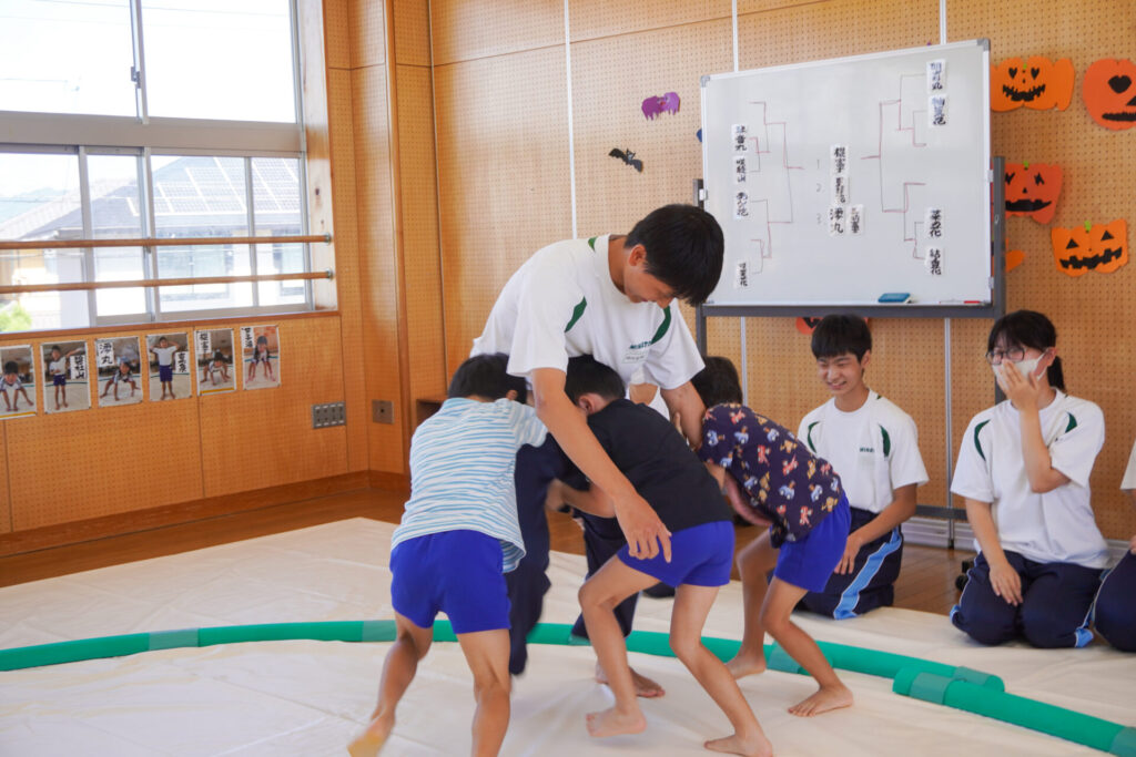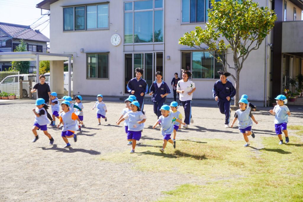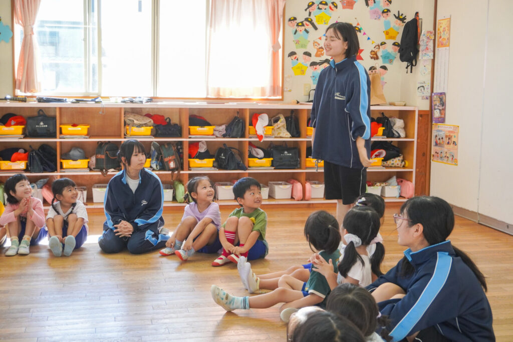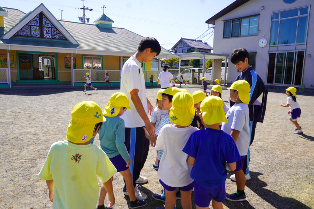 各クラスに分かれて、歌を聞いてもらったり、一緒にダンスを踊ったり、鬼ごっこや相撲対決…お兄さん・お姉さんと一緒にめいっぱい遊んでいただきました。