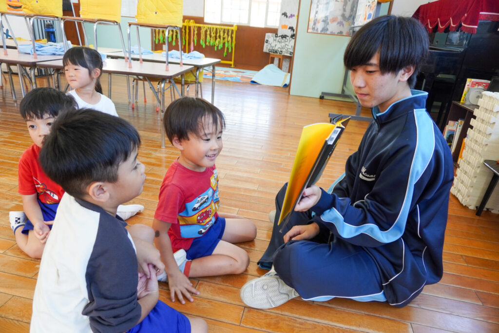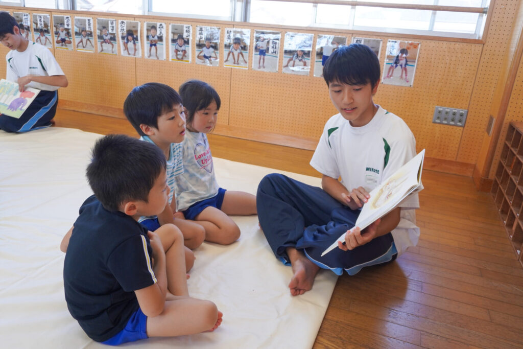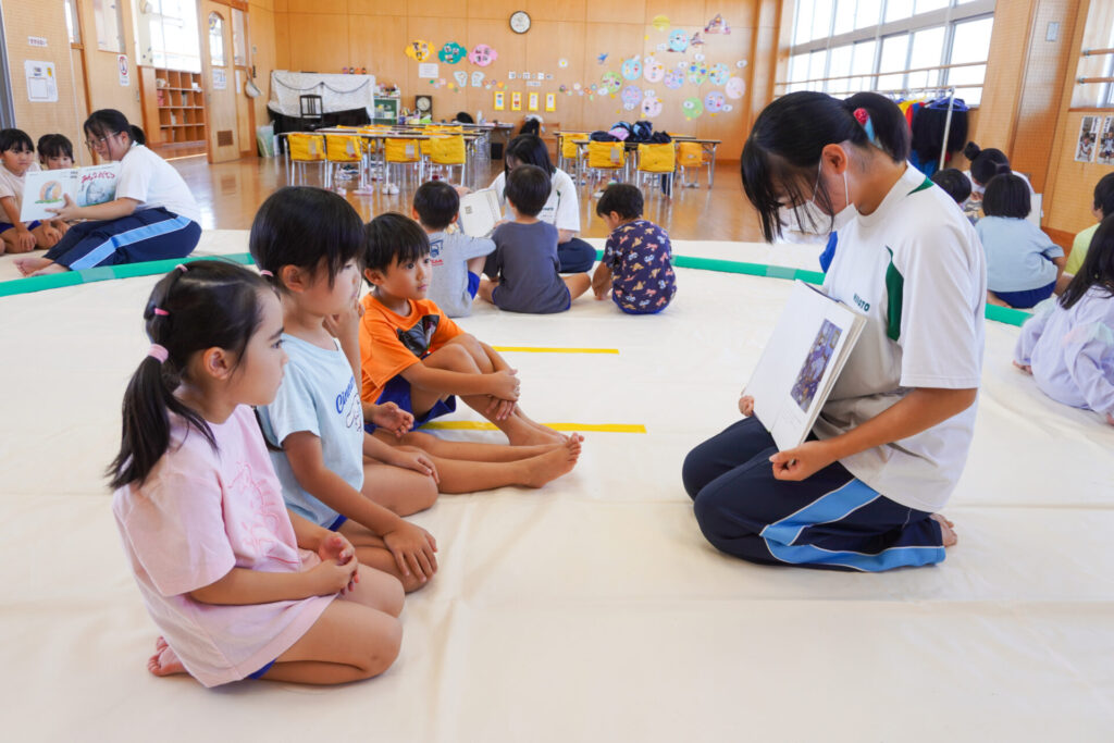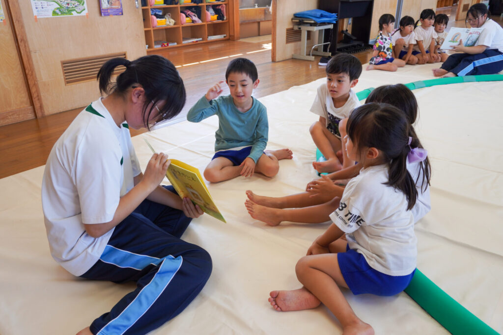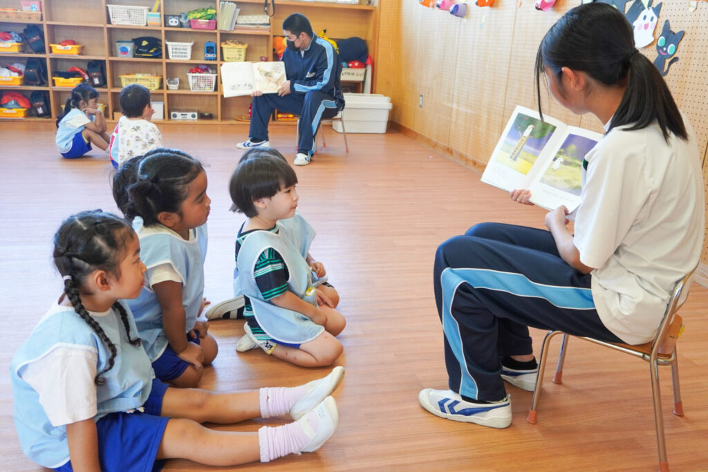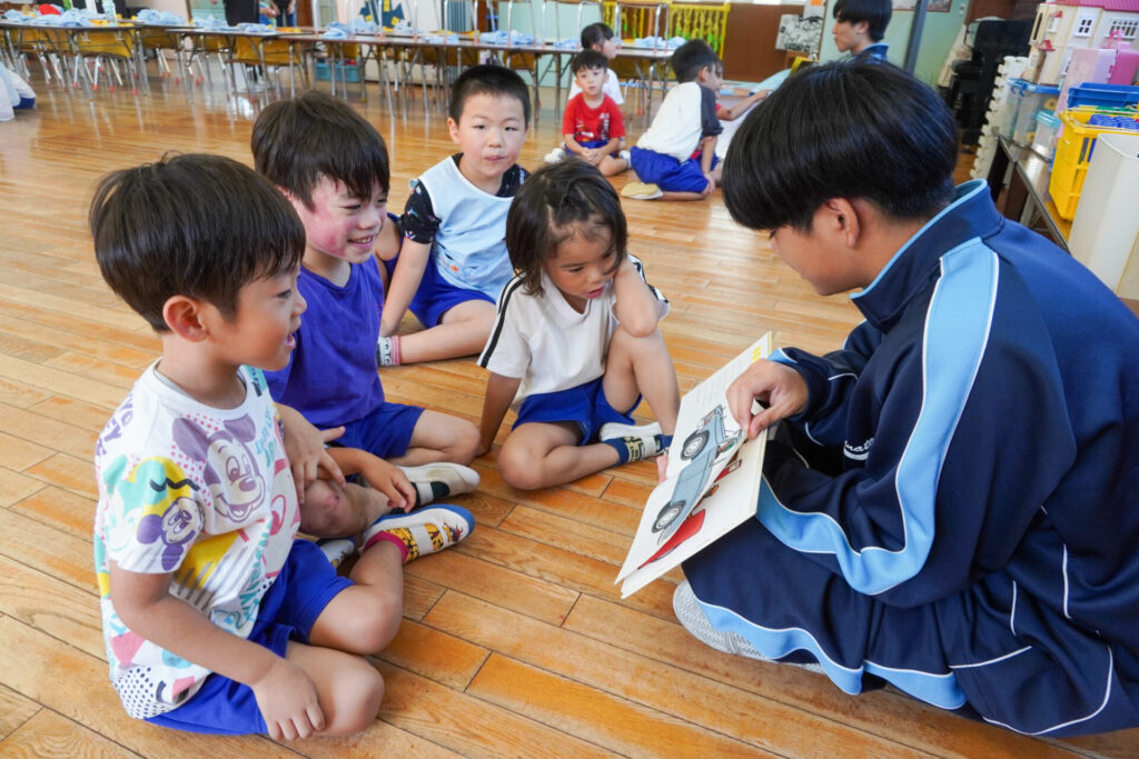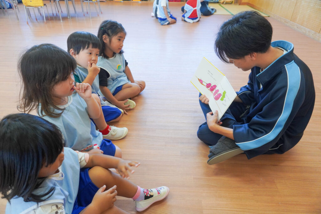 最後は絵本の読み聞かせです。各クラス、絵本の読み聞かせが始まったら、静まり返りました。年齢を考えて絵本を選び、優しく読んでくれたからだと思います。生徒さんの真剣な表情、子ども達のキラキラした目を見て、微笑ましく思いました。時折、子ども達の表情を見ながら読んでくれたのが印象的でした。