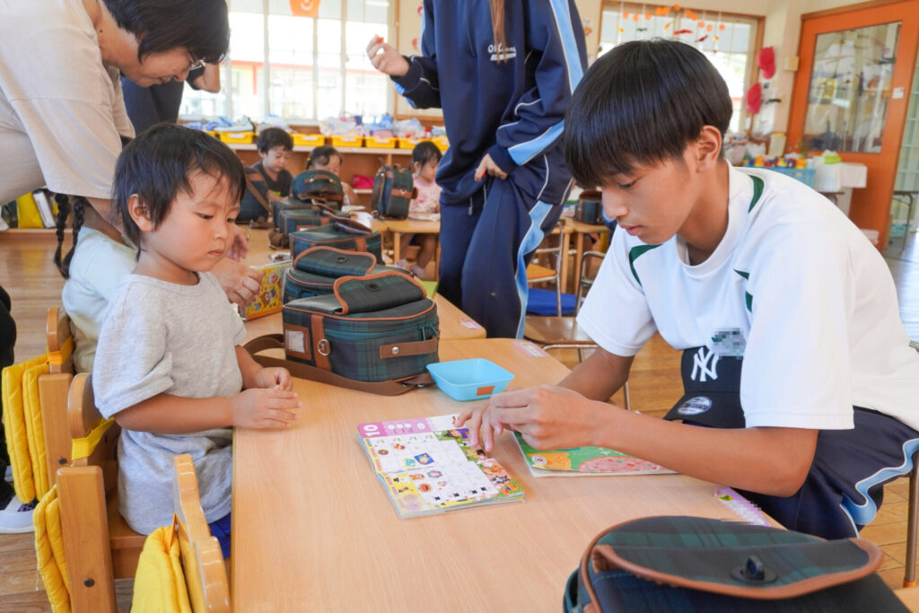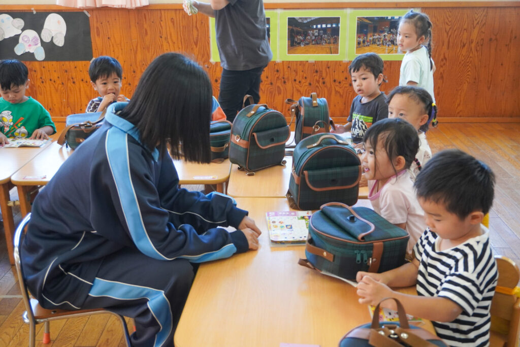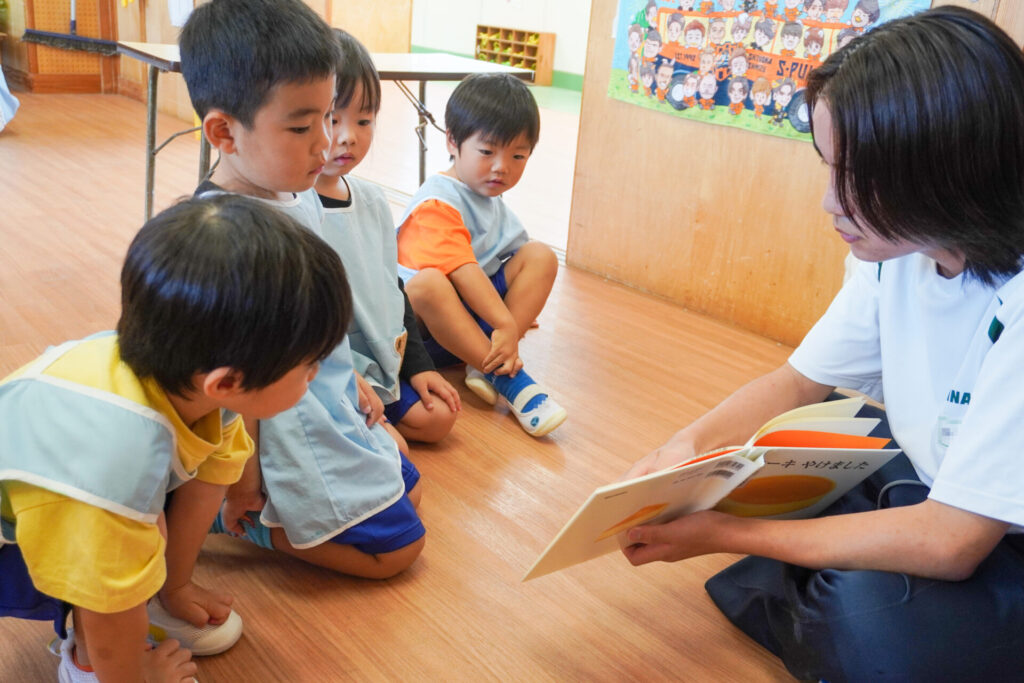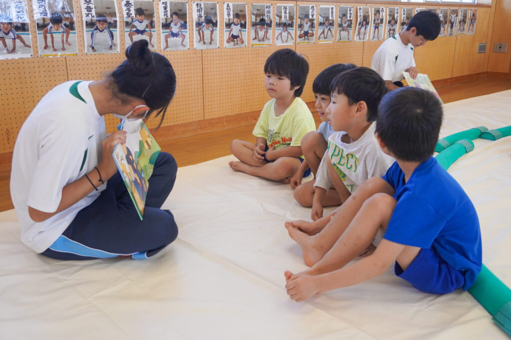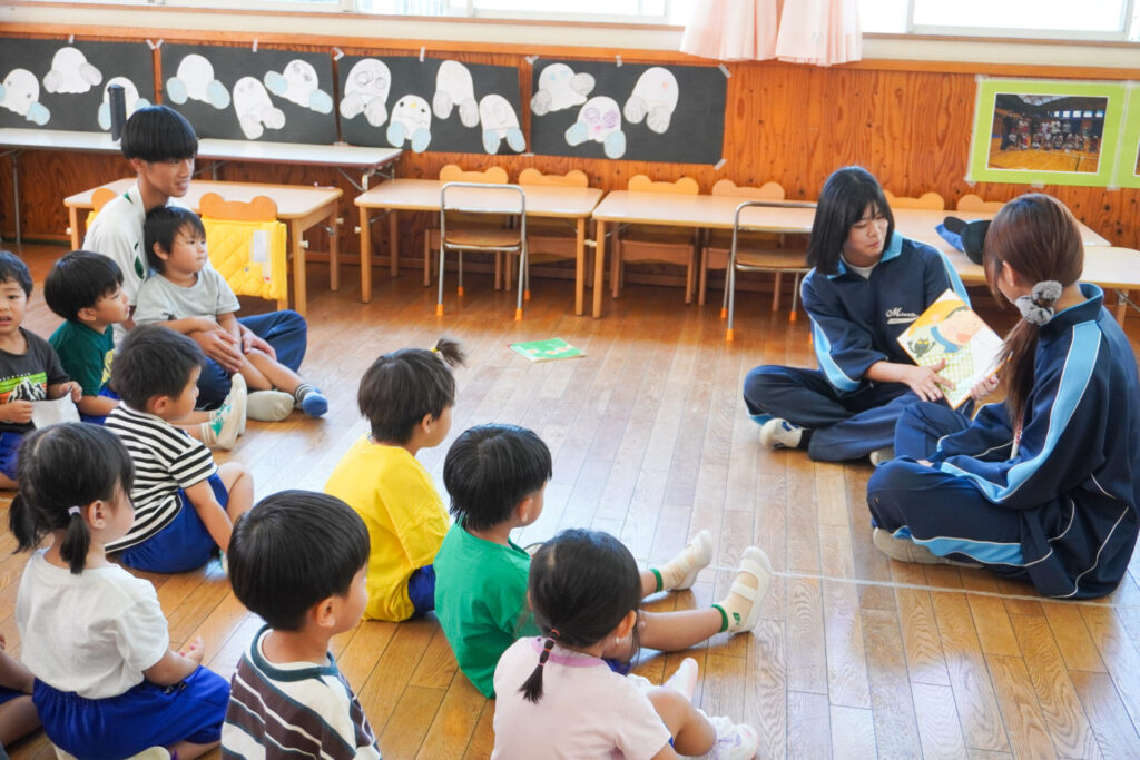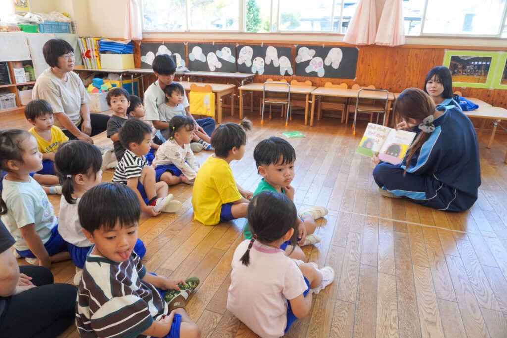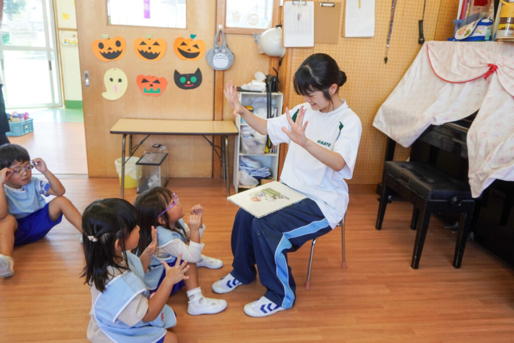 最後は絵本の読み聞かせです。各クラス、絵本の読み聞かせが始まったら、静まり返りました。年齢を考えて絵本を選び、優しく読んでくれたからだと思います。生徒さんの真剣な表情、子ども達のキラキラした目を見て、微笑ましく思いました。時折、子ども達の表情を見ながら読んでくれたのが印象的でした。