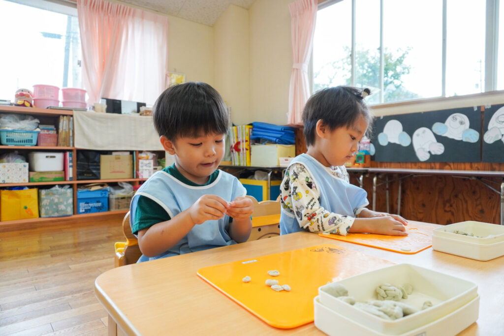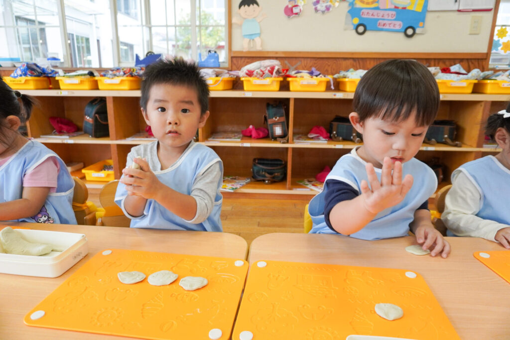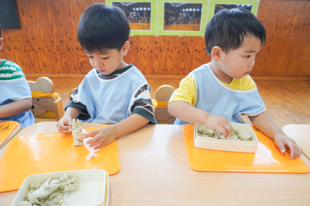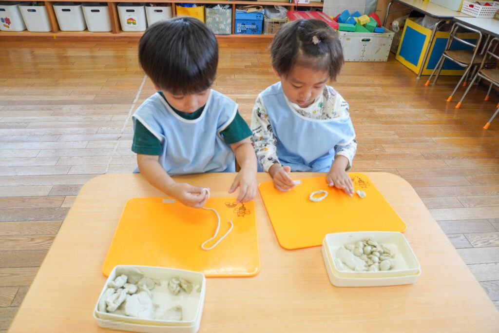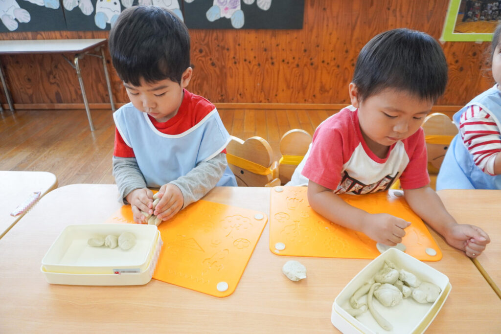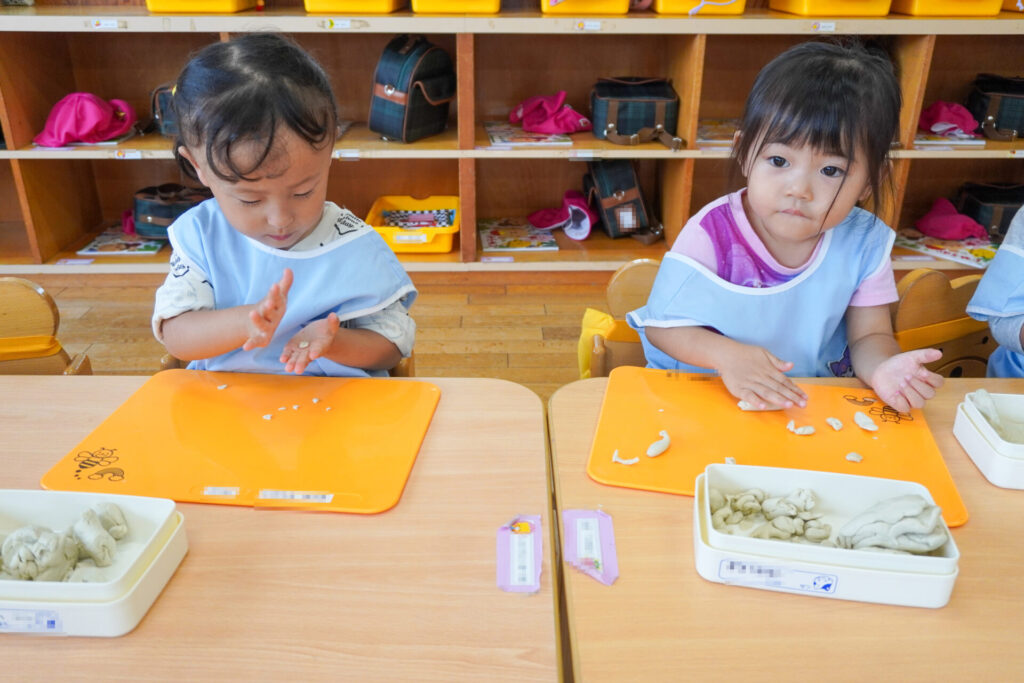 友だちを見て真似たり、「やってみたい!」と要求をしたり、「これで遊びたい!」という気持ちも強くなってきました。粘土の片付けも覚えてきました。粘土箱と粘土板を持って道具棚に片付けることができました。