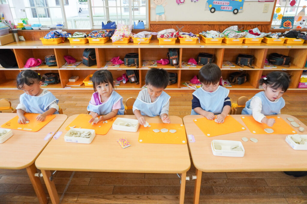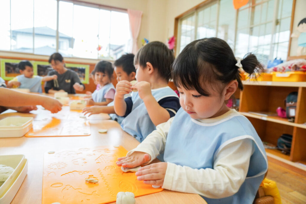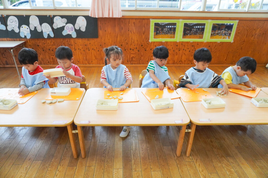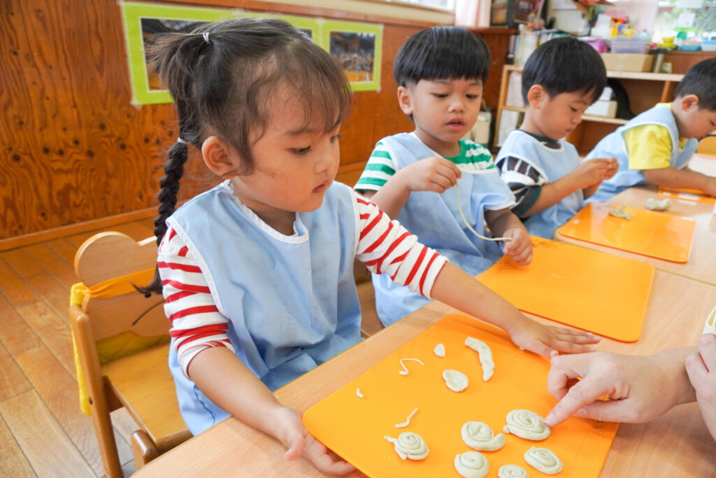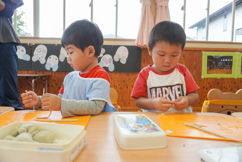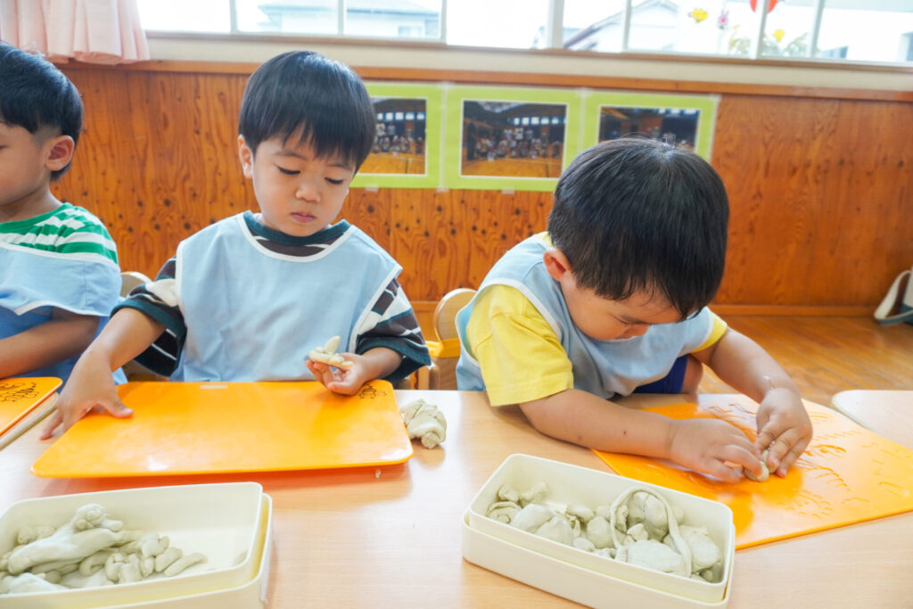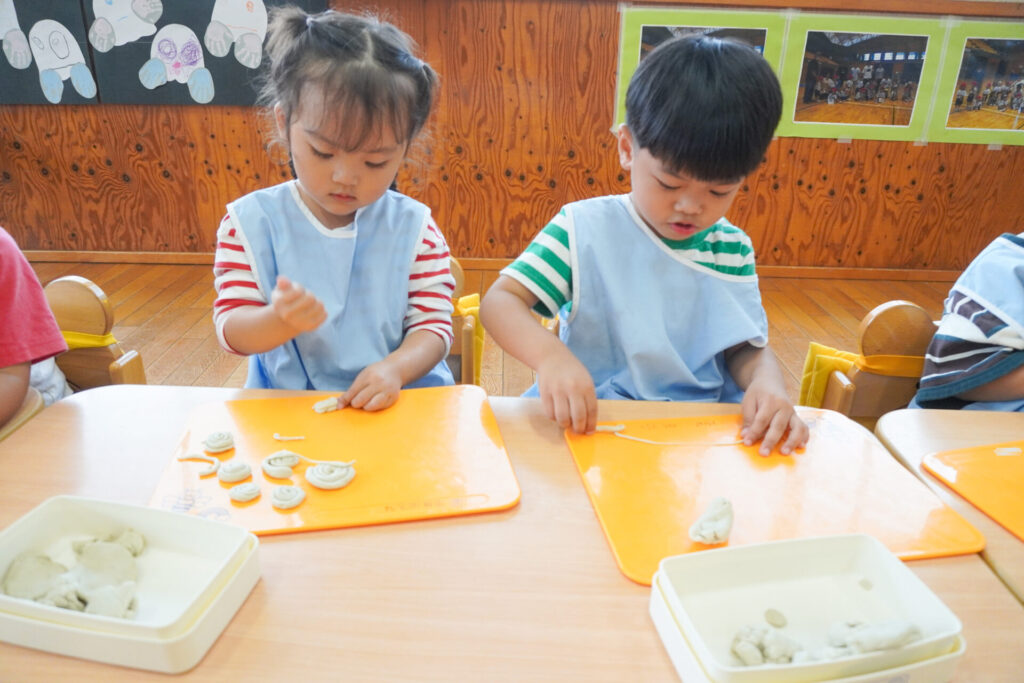 幼稚園で一番小さい満3歳バンビ組さんは、毎日元気いっぱいです!今日は粘土で遊びました。丸めたり、伸ばしたり…粘土は自由自在に形が変わります。コロコロ丸めたり、手のひらで伸ばしたり、ちぎったり、夢中になって遊びました。