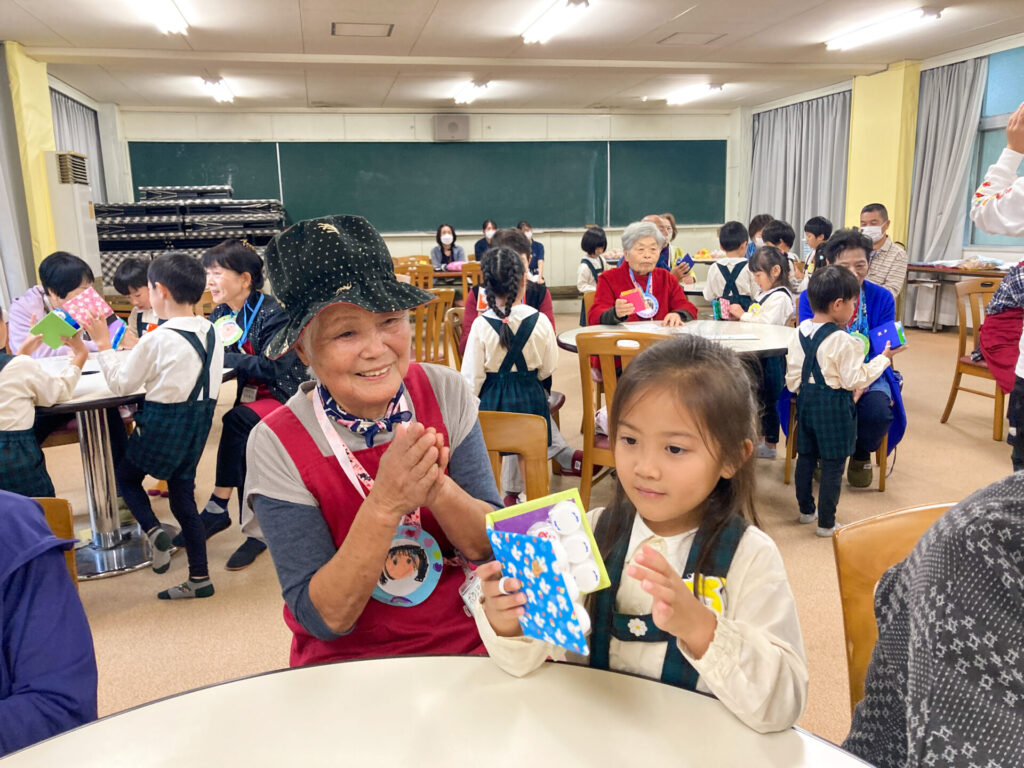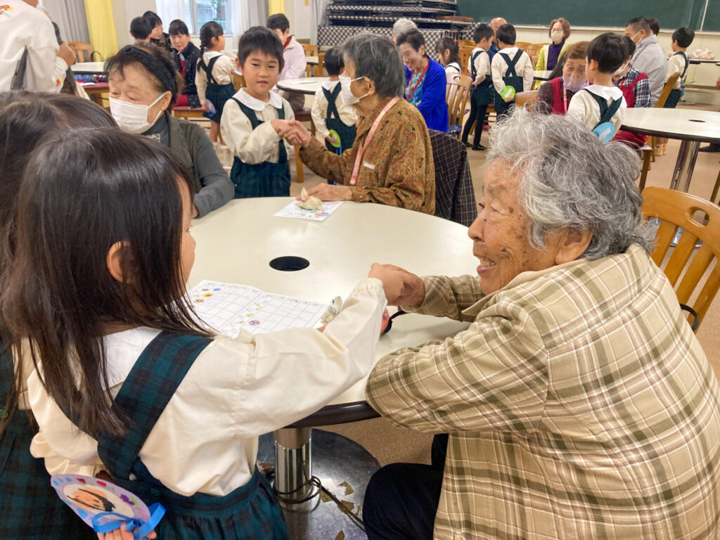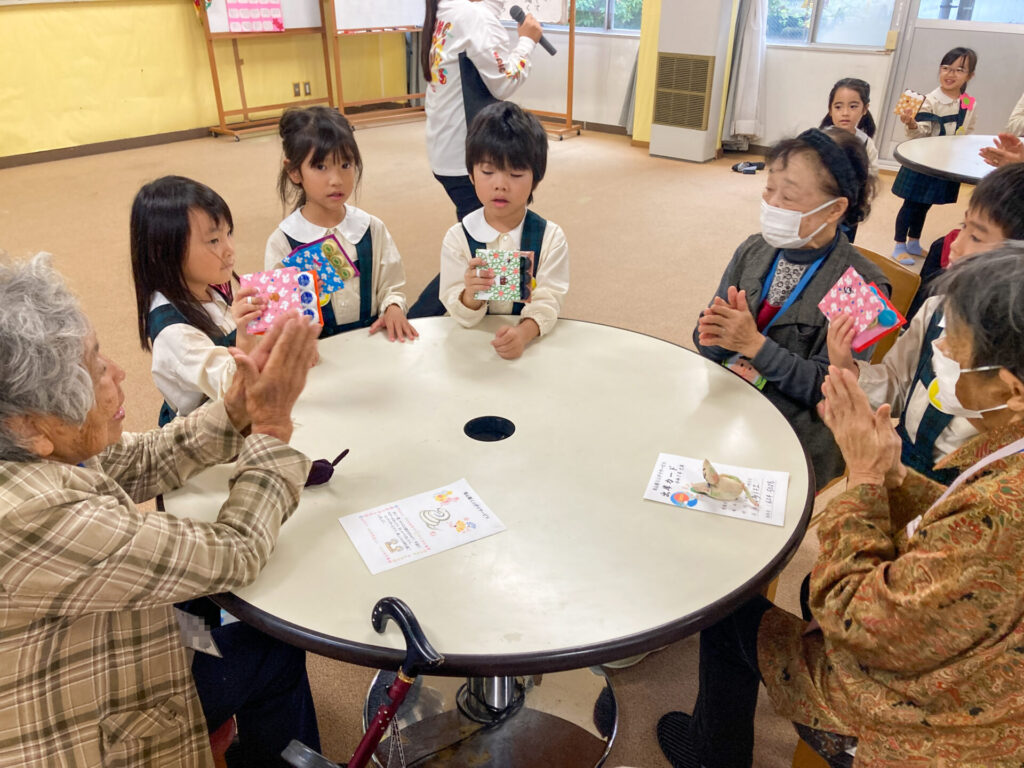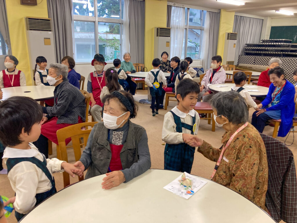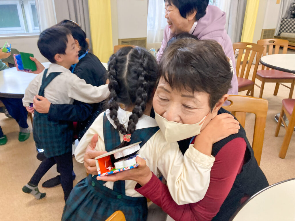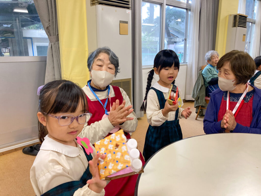 最後の最後に「手作りカスタネット」をいただきました。つき組、おじいさん、おばあさんと一緒に「手をたたきましょう」を歌いました。室内にすてきな音が響き渡りましたね。「これ、大事にする!」と言っていた子もいました。