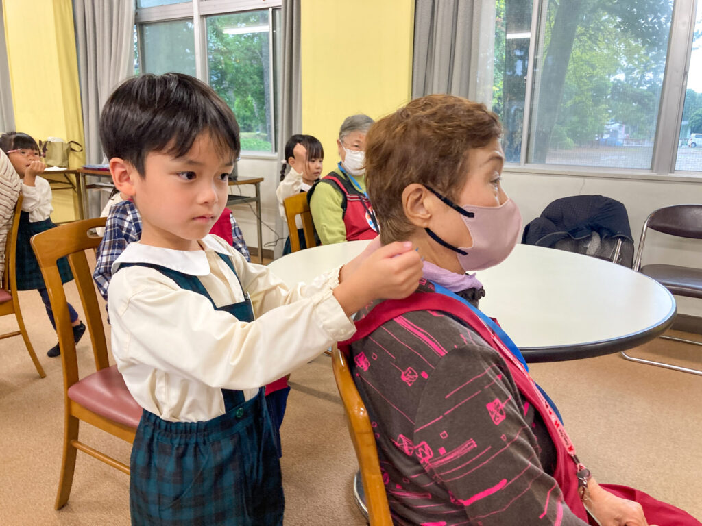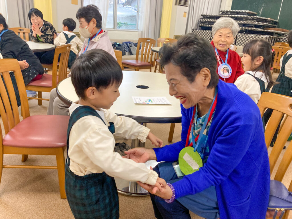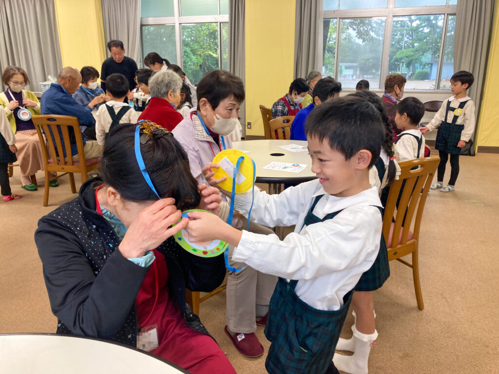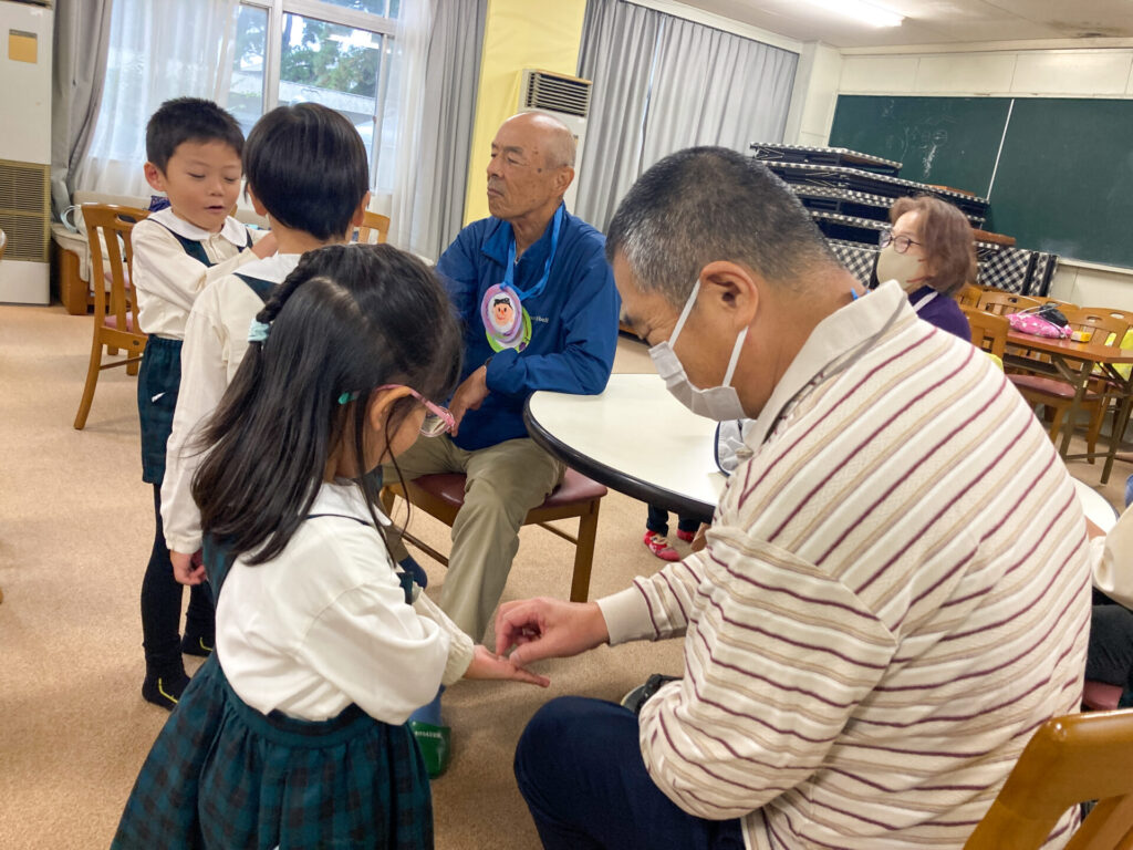 それぞれペアになってふれあい遊びもしました。内緒で作ったペンダントを「いつまでもお元気でいてください!」と手渡し、首にかけてあげました。「ありがとう」「嬉しいよ」と言ってもらえて、子ども達も嬉しそうでした。ペアのおじいさん・おばあさんへ「名前」「年齢」「好きな動物」「将来の夢」等を伝えました。