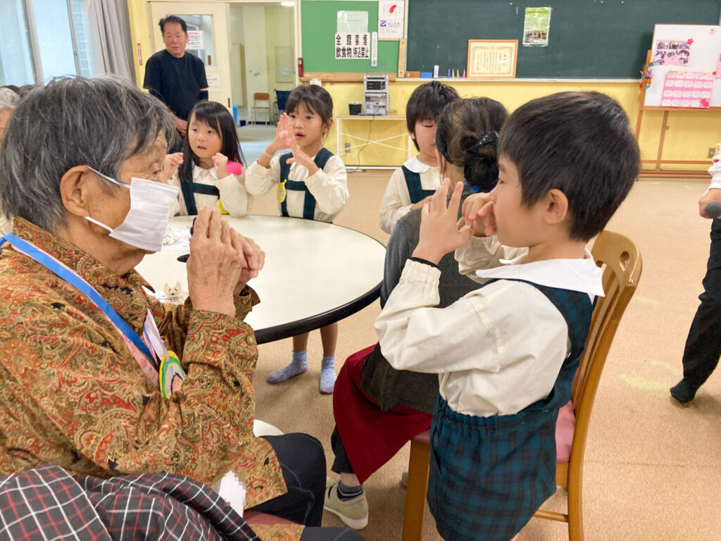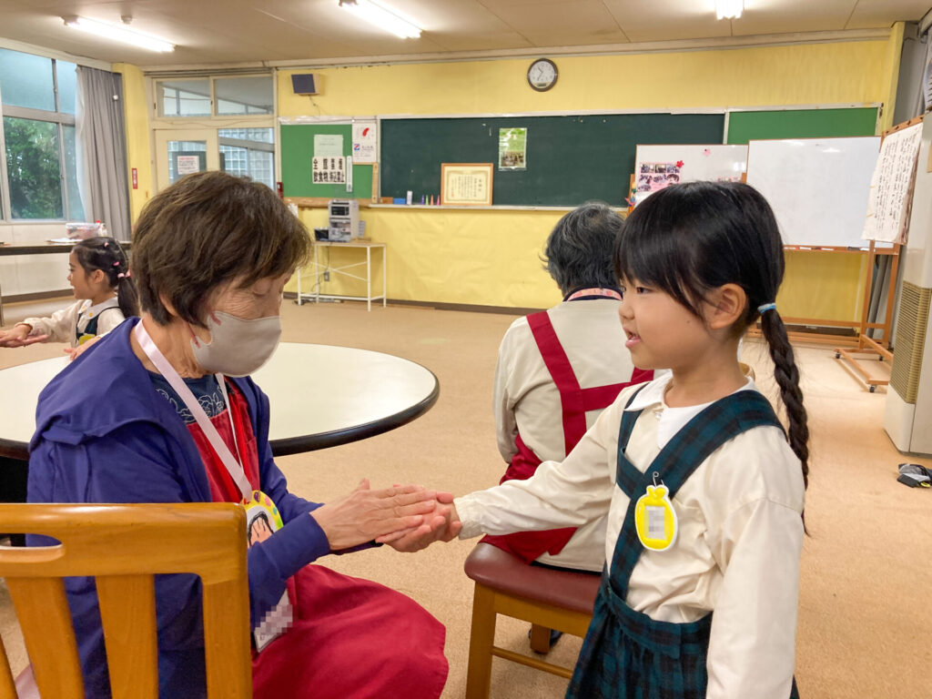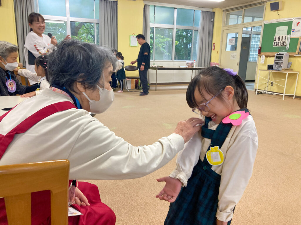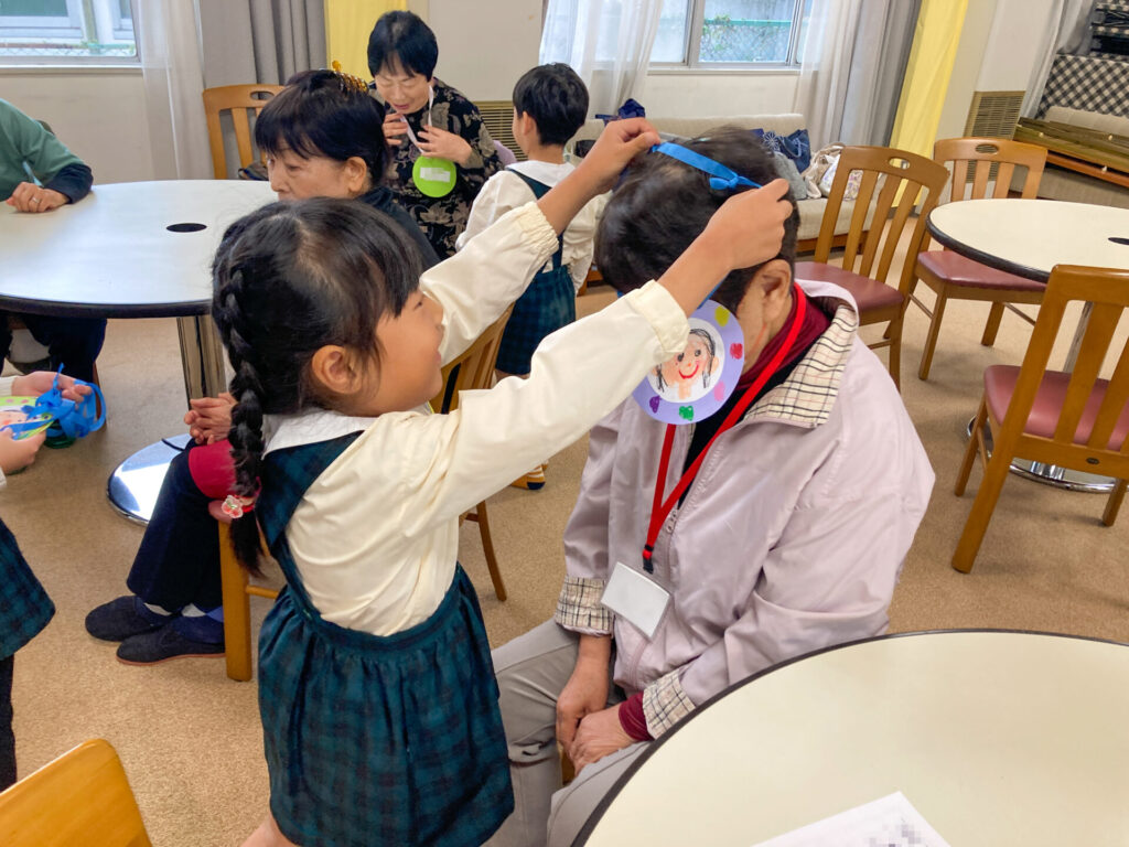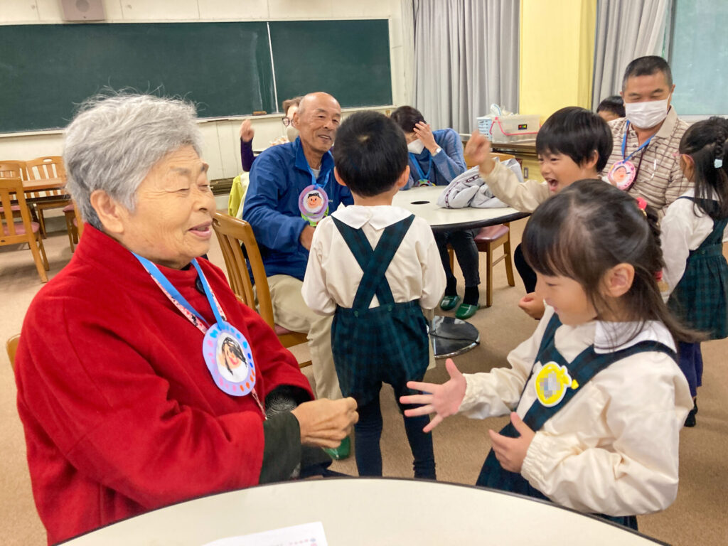 それぞれペアになってふれあい遊びもしました。内緒で作ったペンダントを「いつまでもお元気でいてください!」と手渡し、首にかけてあげました。「ありがとう」「嬉しいよ」と言ってもらえて、子ども達も嬉しそうでした。ペアのおじいさん・おばあさんへ「名前」「年齢」「好きな動物」「将来の夢」等を伝えました。