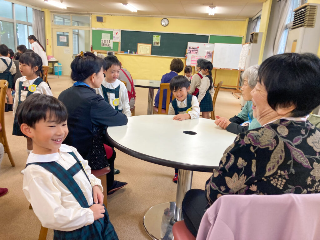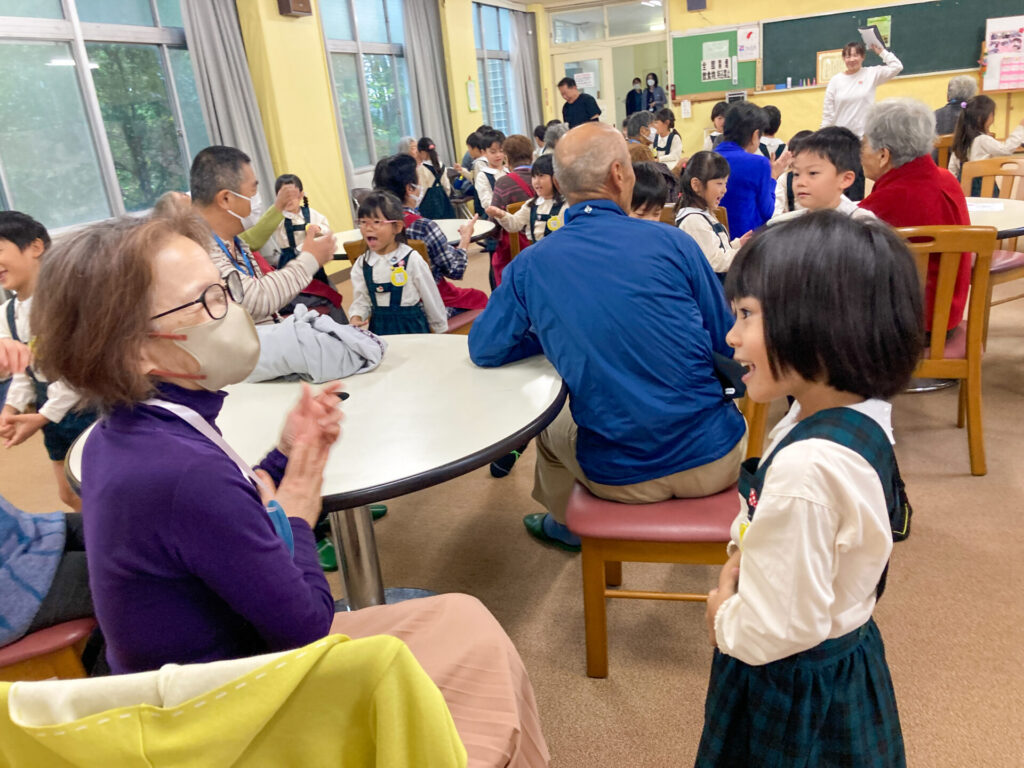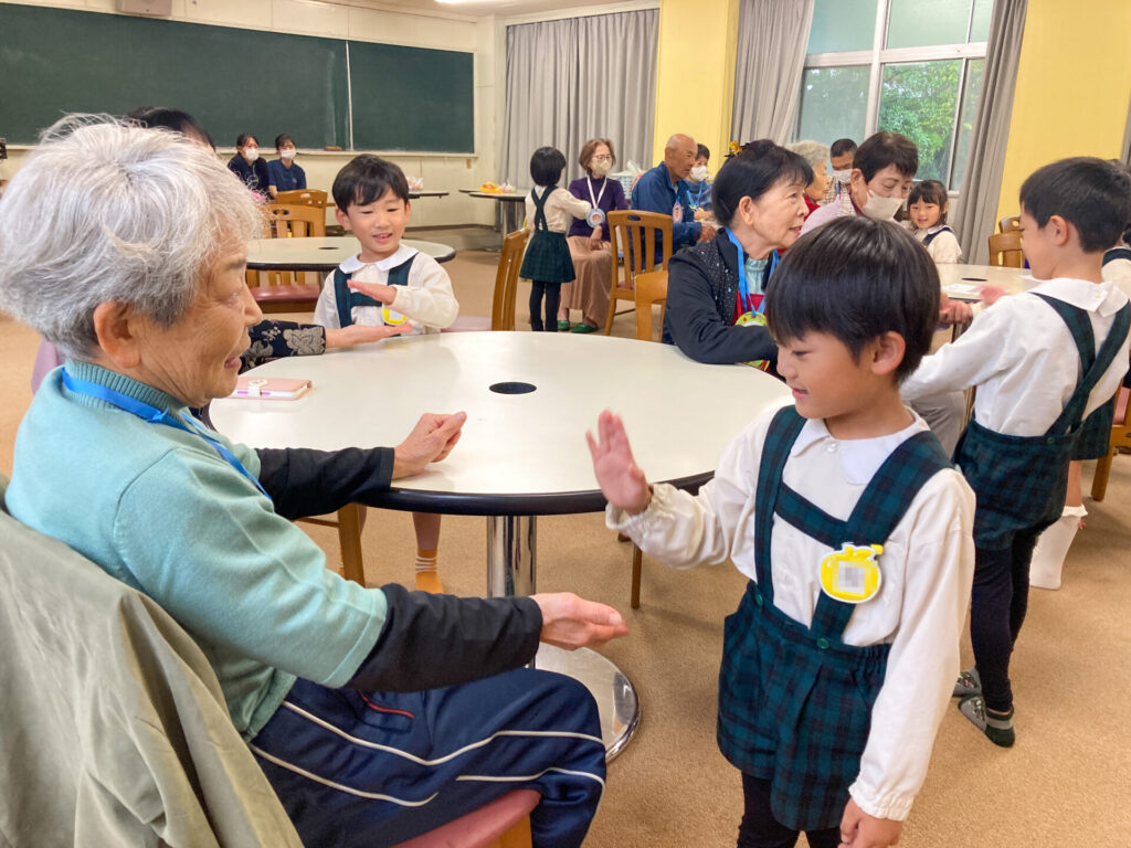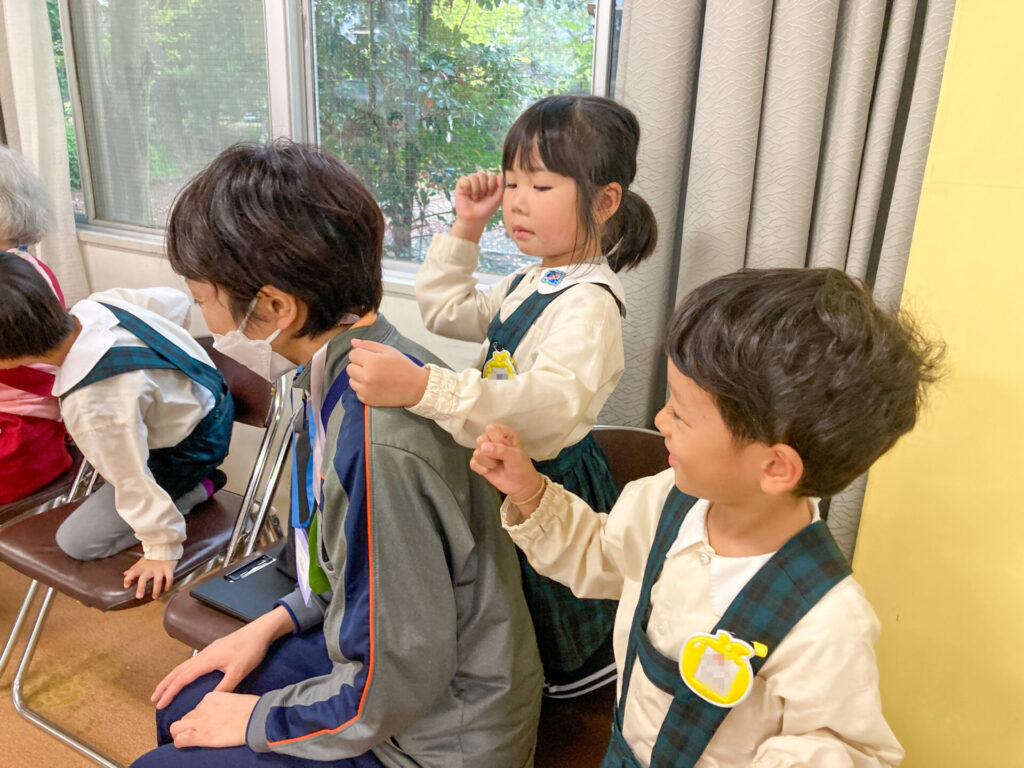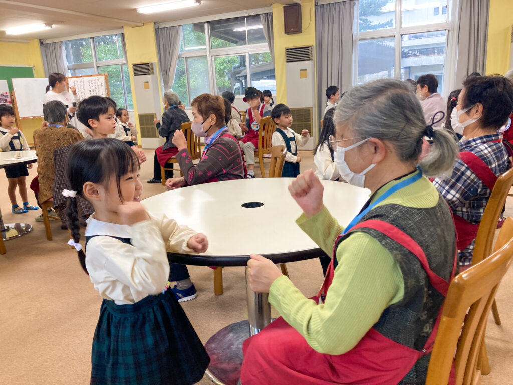 この度、年長つき組がお誘いを受け、焼津青少年の家隣のコミュニティ施設「祐心館」へスクールバスで出向きました。到着した時は少し緊張していた子も、温かく出迎えていただき、いつもの表情に戻りました。