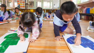 この度、年長つき組がお誘いを受け、焼津青少年の家隣のコミュニティ施設「祐心館」へスクールバスで出向きました。到着した時は少し緊張していた子も、温かく出迎えていただき、いつもの表情に戻りました。