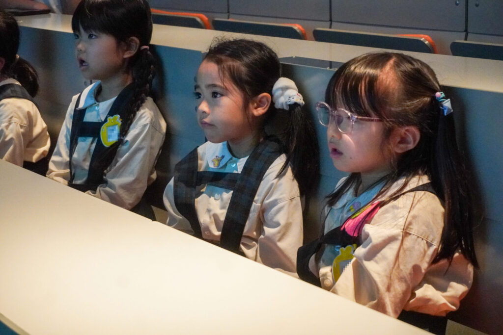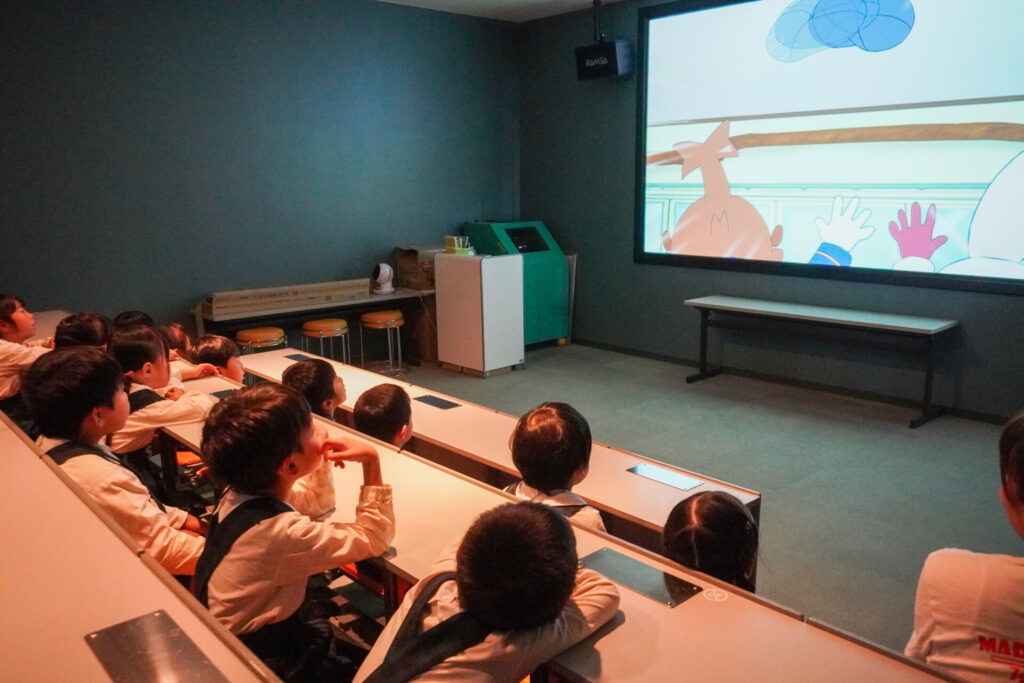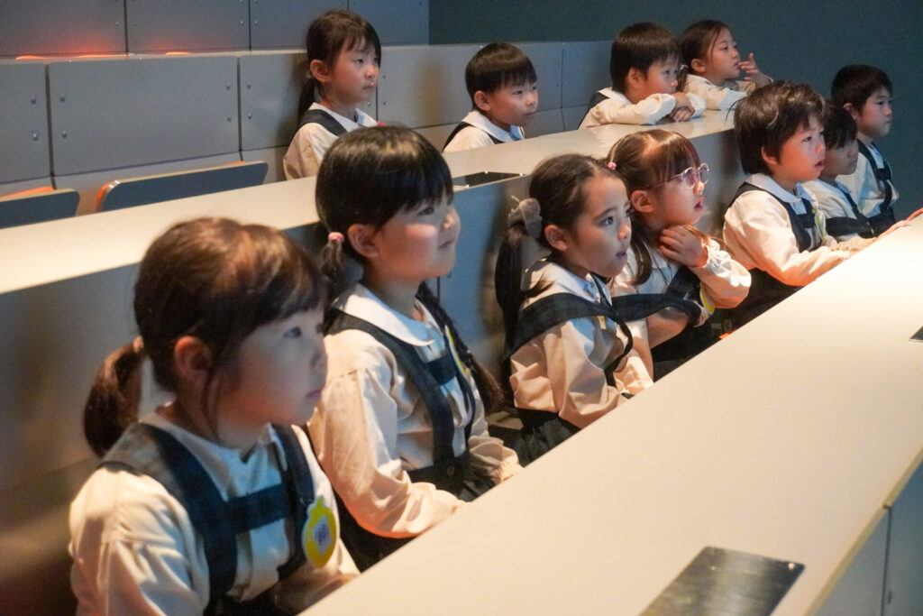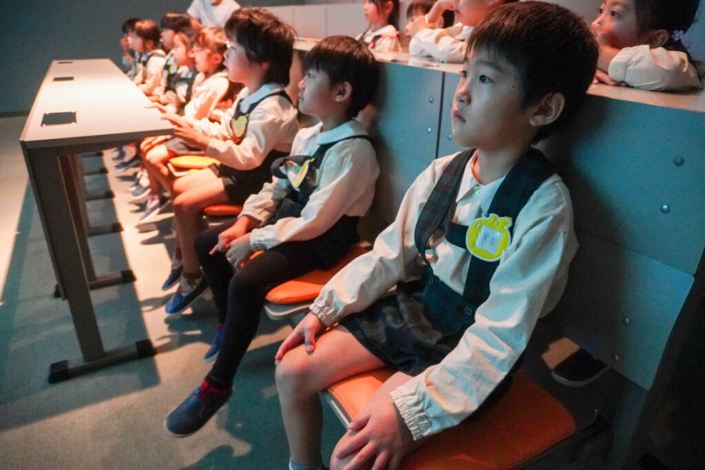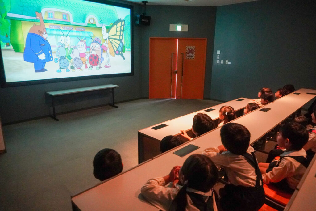 「防災シアター」では防災アニメ映像を鑑賞しました。昆虫が分かりやすく、避難訓練の安全な方法を教えてくれ、真剣に見ていました。見て、聞いて、考えて、またひとつ、大切な知識が増えました。