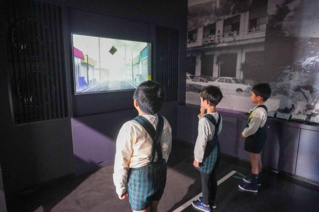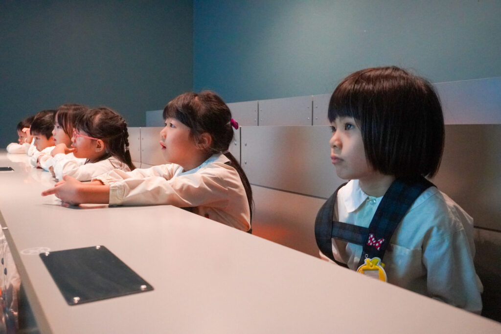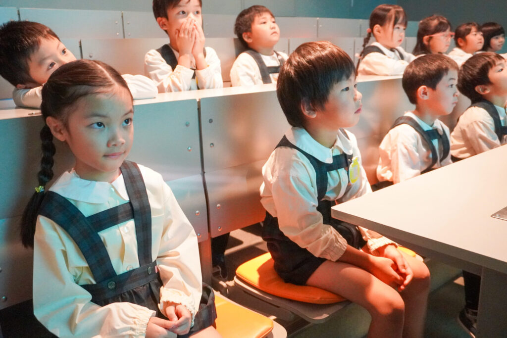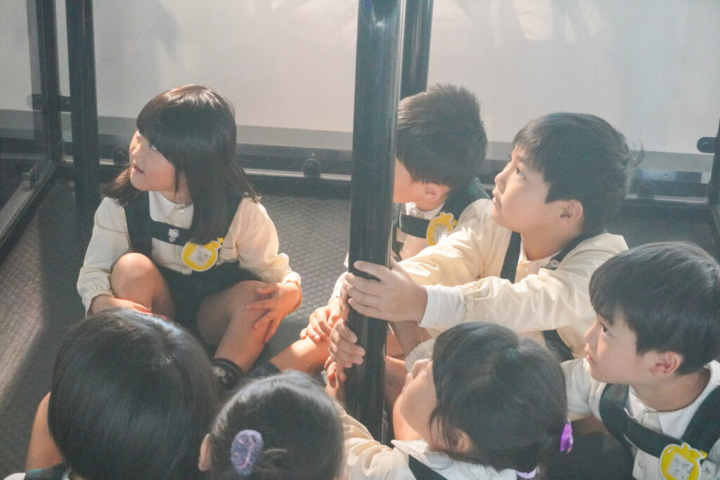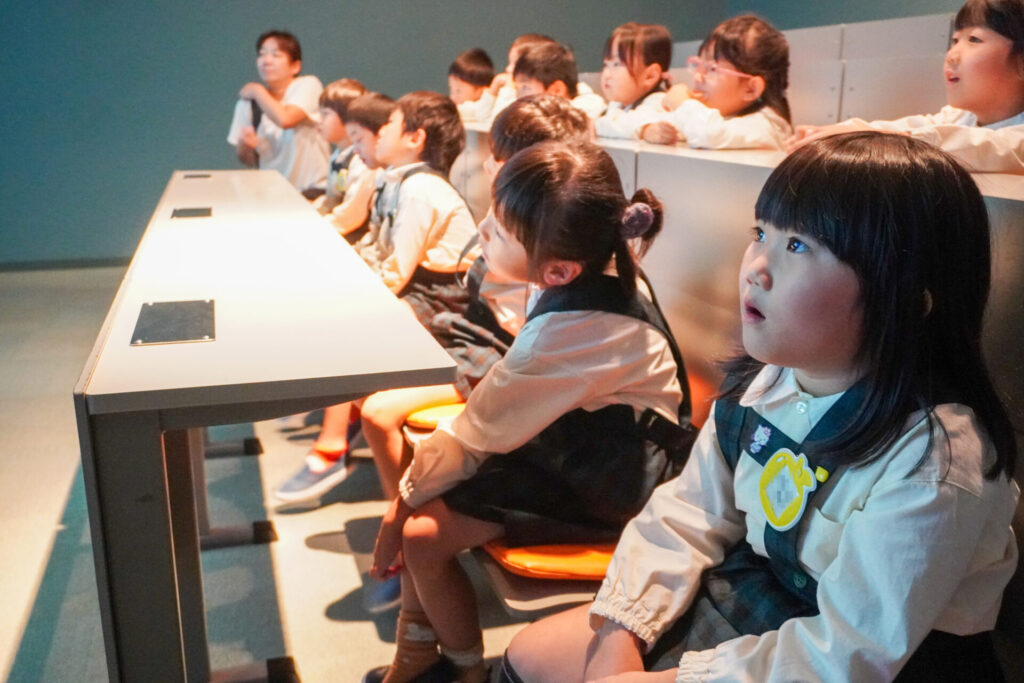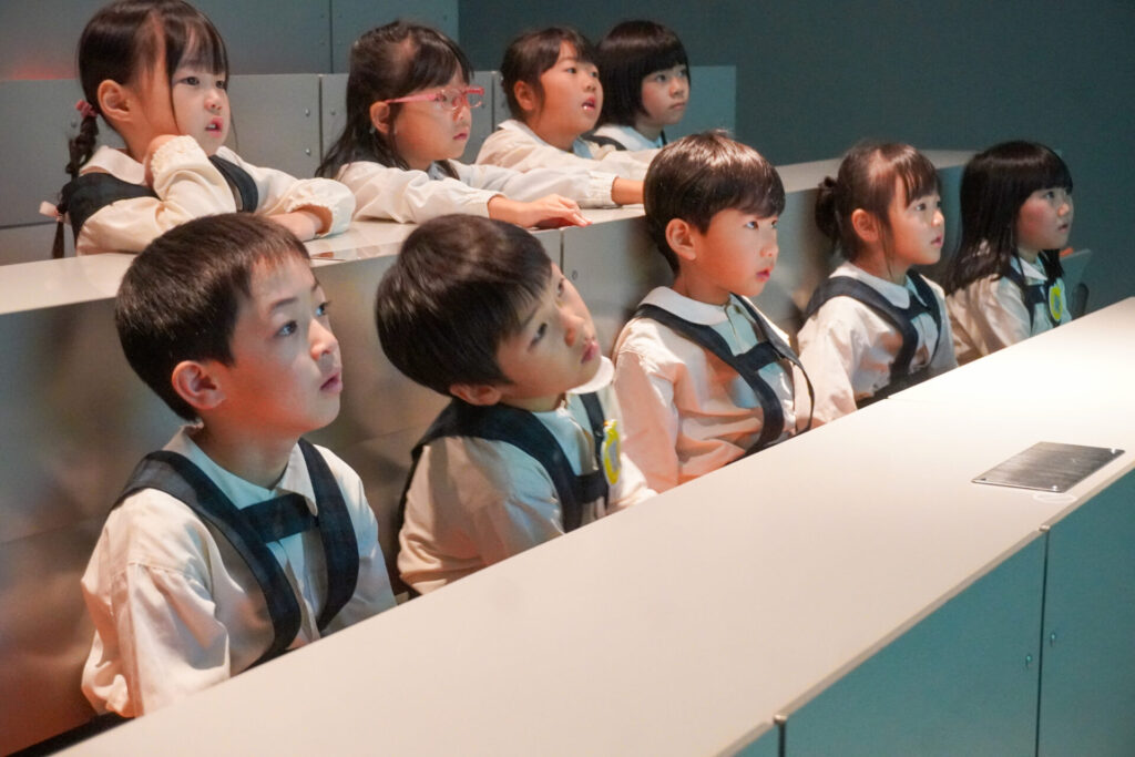 「防災シアター」では防災アニメ映像を鑑賞しました。昆虫が分かりやすく、避難訓練の安全な方法を教えてくれ、真剣に見ていました。見て、聞いて、考えて、またひとつ、大切な知識が増えました。